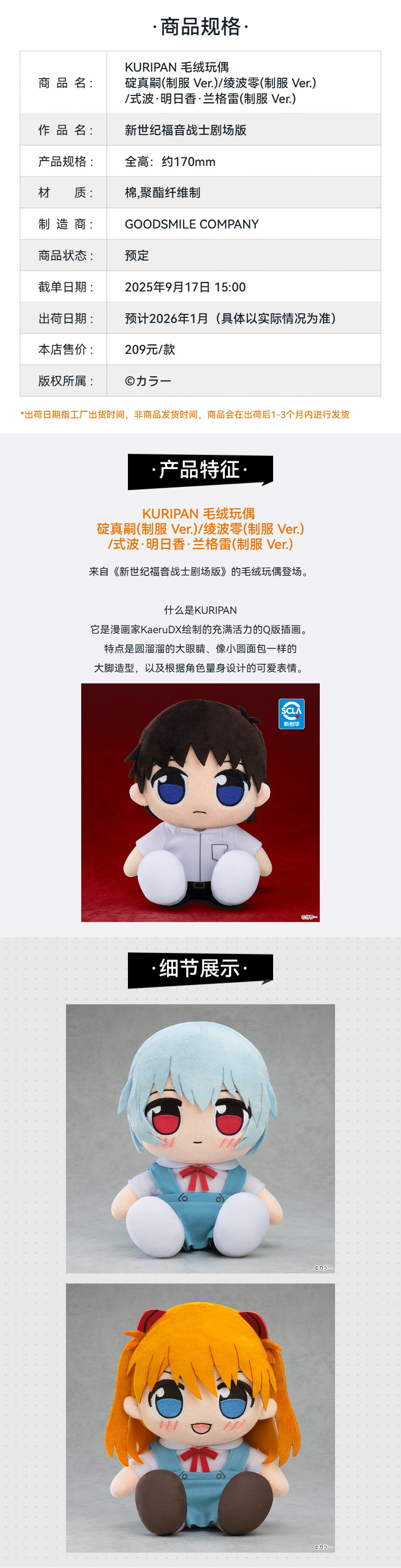 【GSC现货】KURIPAN 毛绒玩偶 碇真嗣(制服 Ver.)/绫波零(制服 Ver.)/式波·明日香·兰格雷(制服 Ver.) 新世纪福音战士剧场版