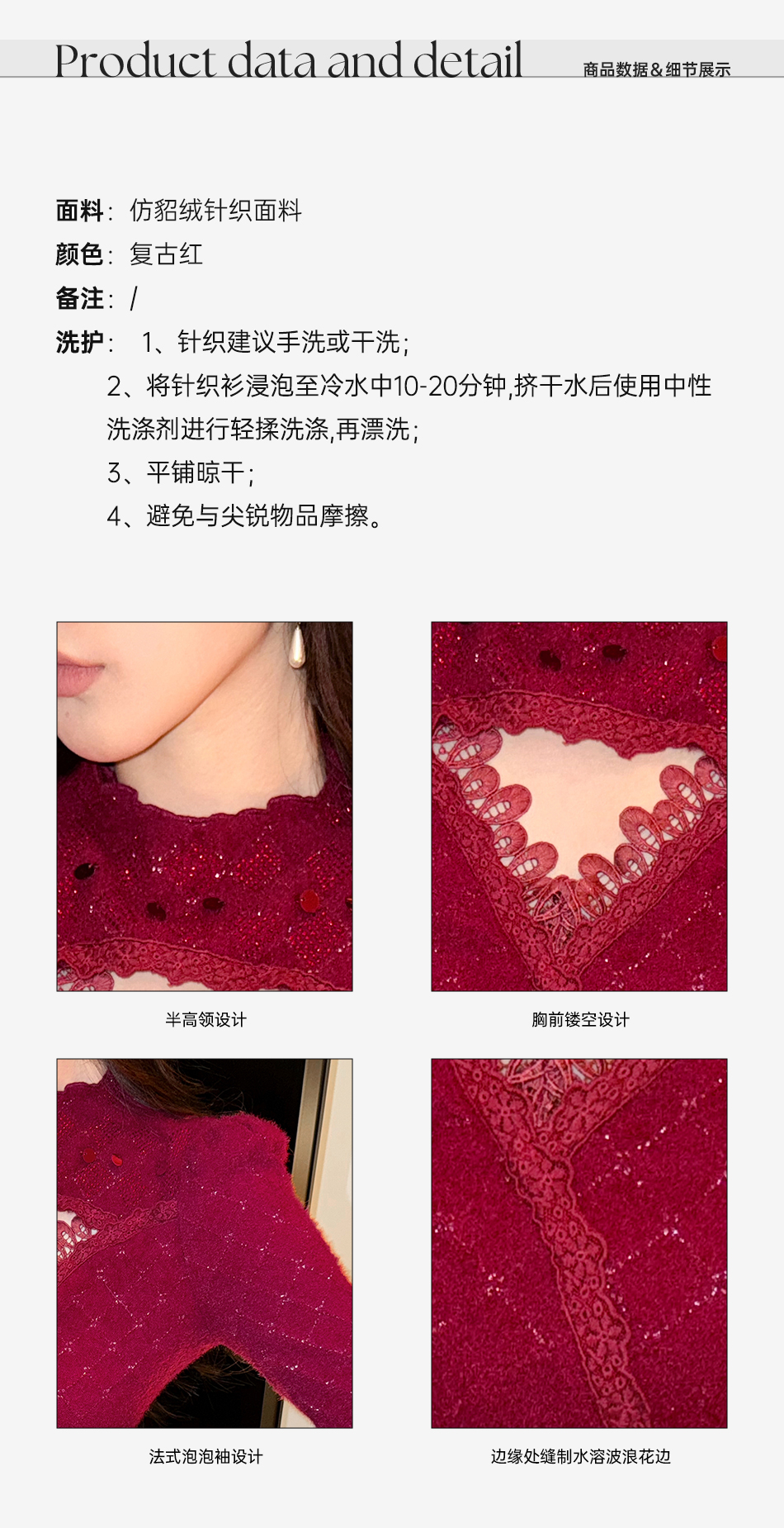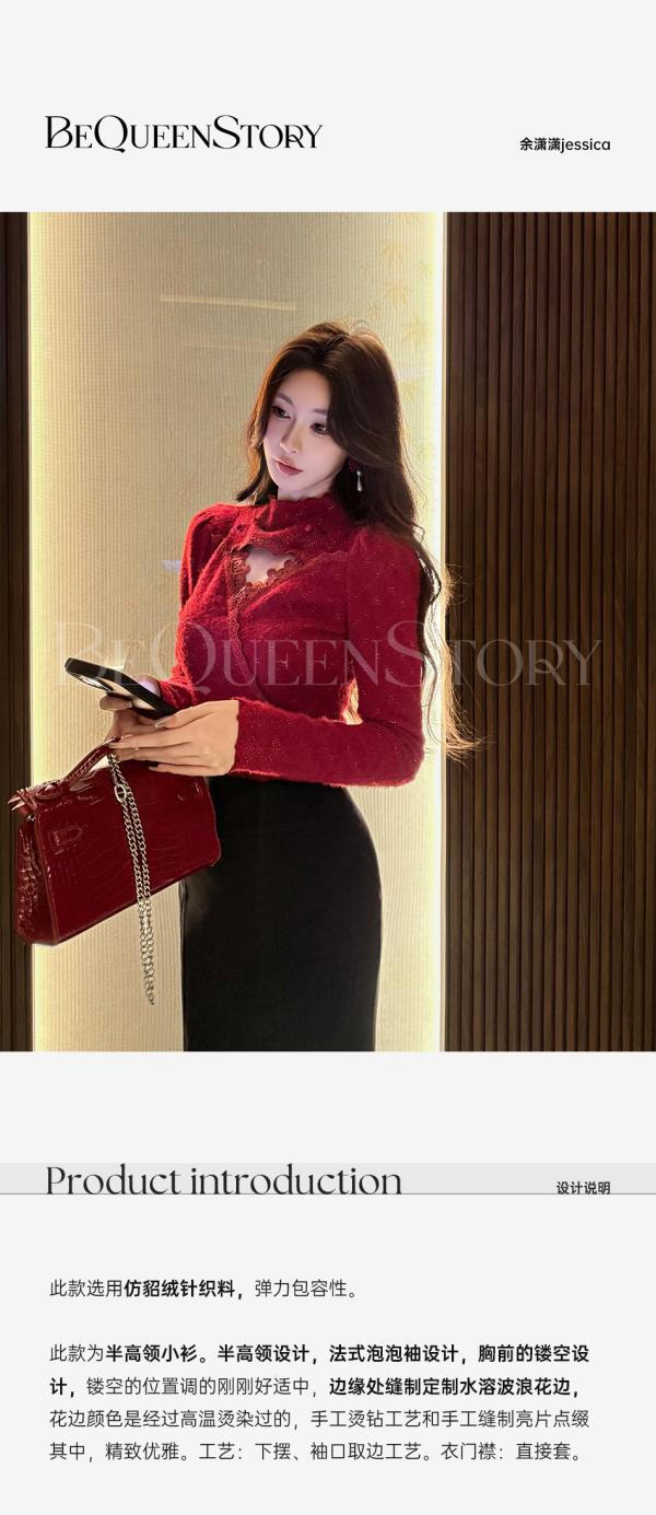【年终福利,不退不换】【圣诞热红酒】仿貂绒手工烫钻亮片法式泡泡袖弹力打底衫