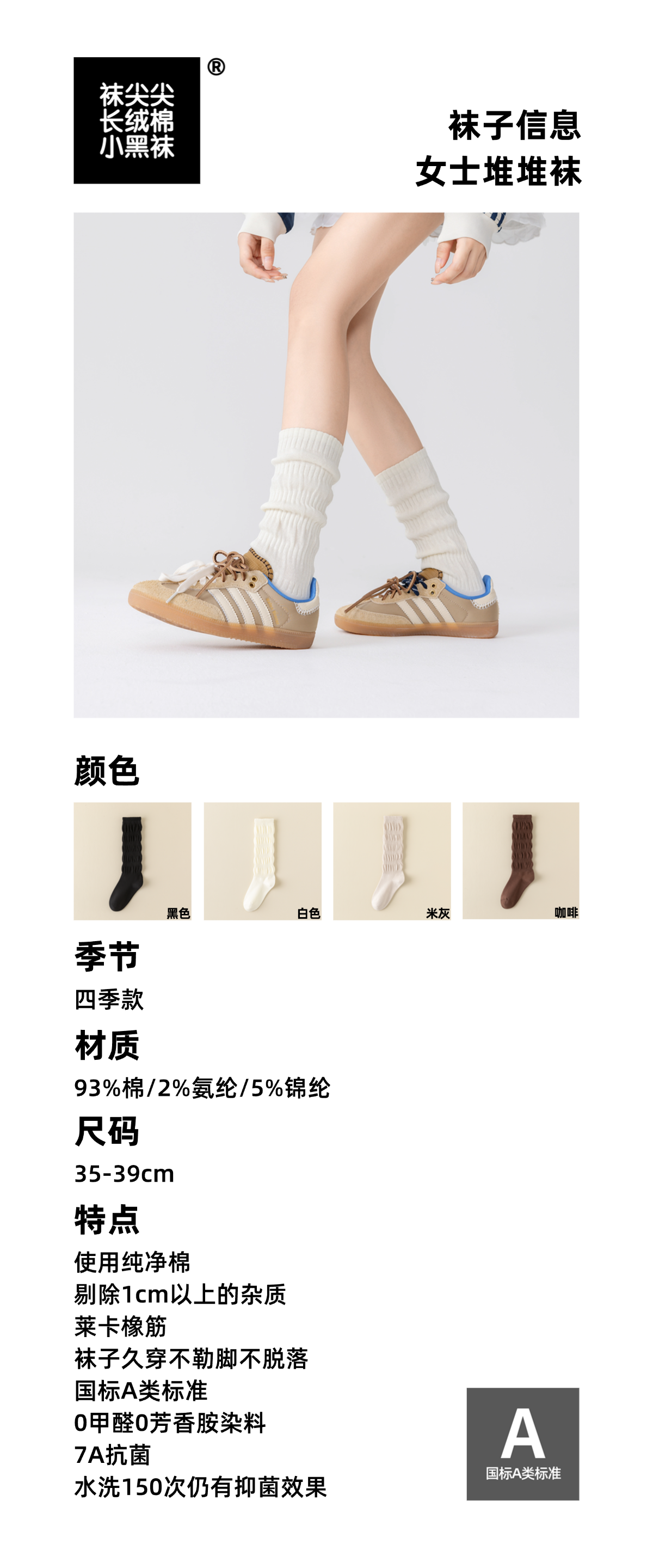 【任选2件立减20元】袜尖尖 四季款女士堆堆长袜 四双装 赛络纺长绒棉,触感顺滑舒爽;A类标准7A抗jun,舒适耐穿不勒脚