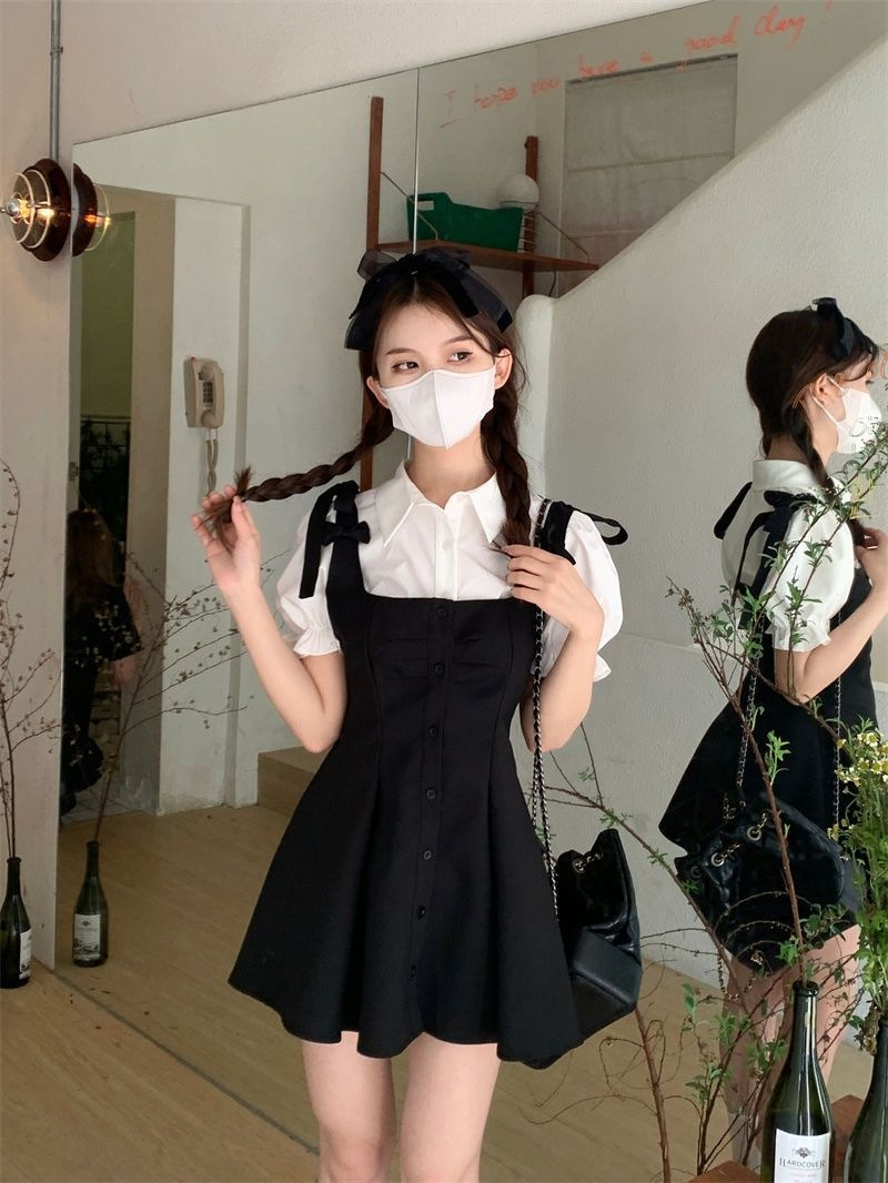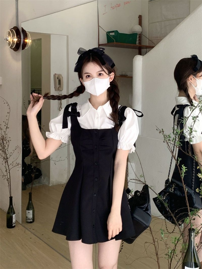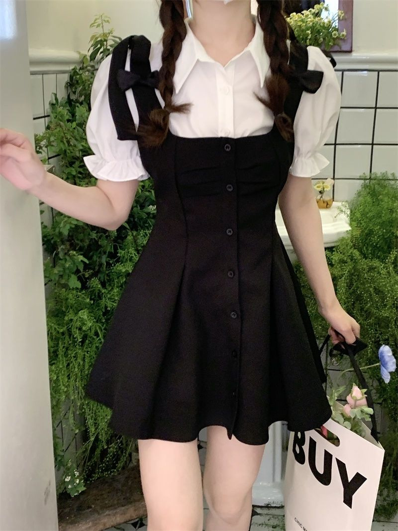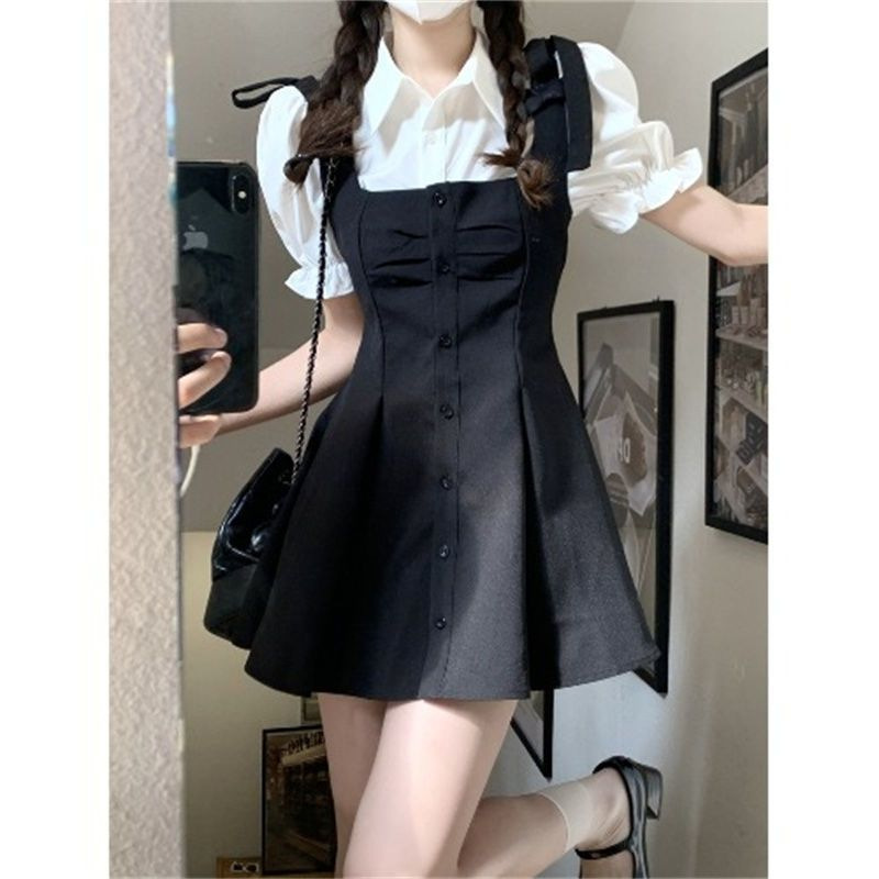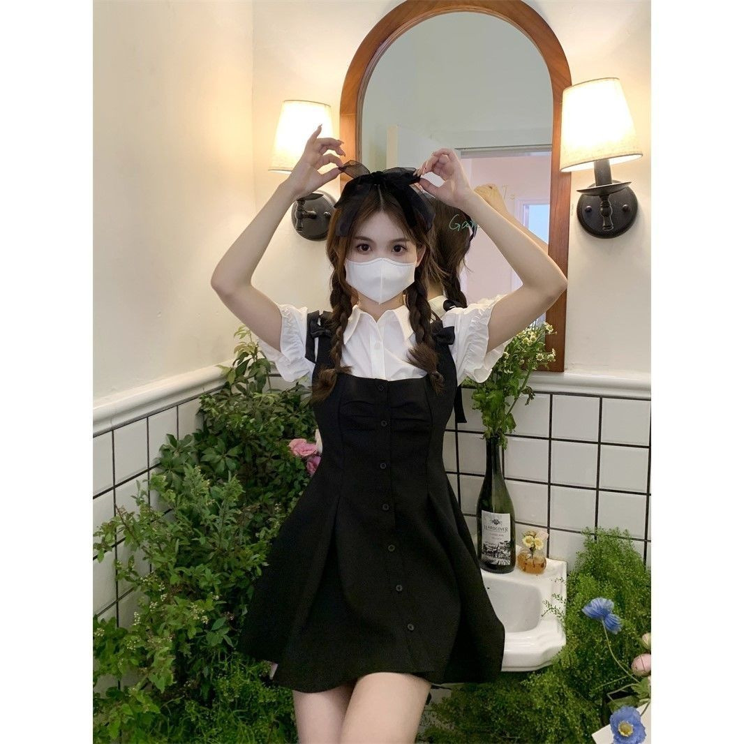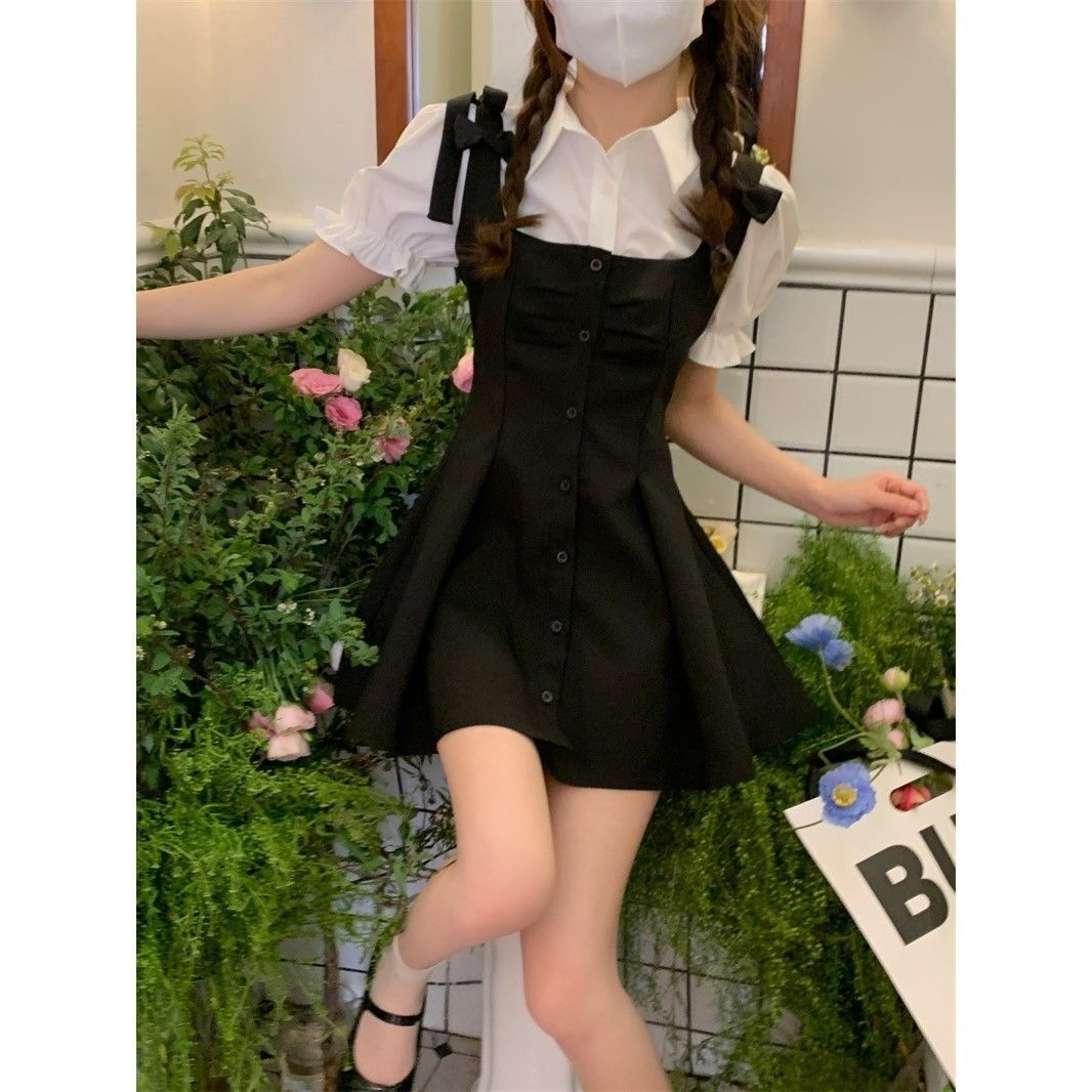 小个子茶系穿搭【衬衫背带连衣裙套装女】夏季学院风 初恋甜美两件套