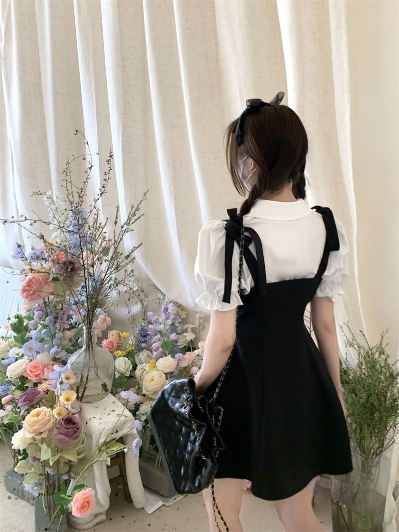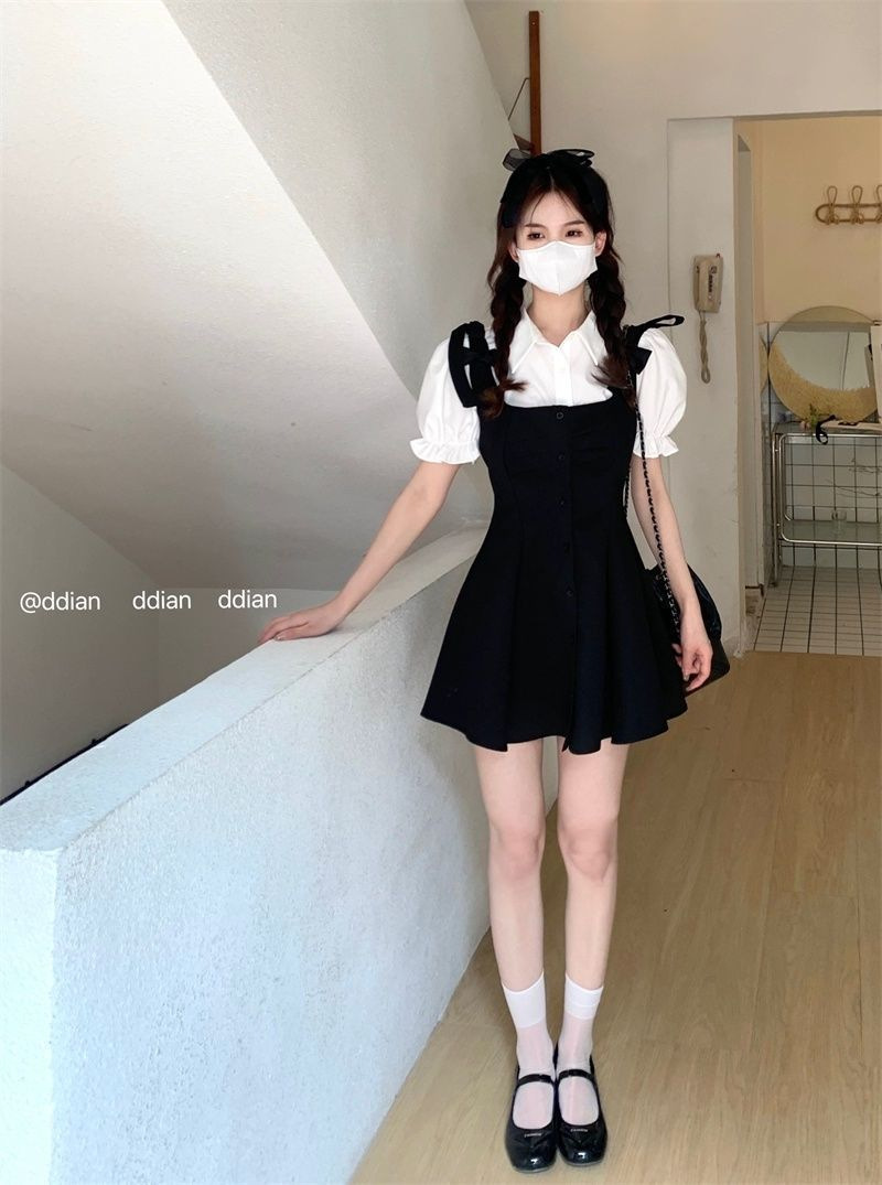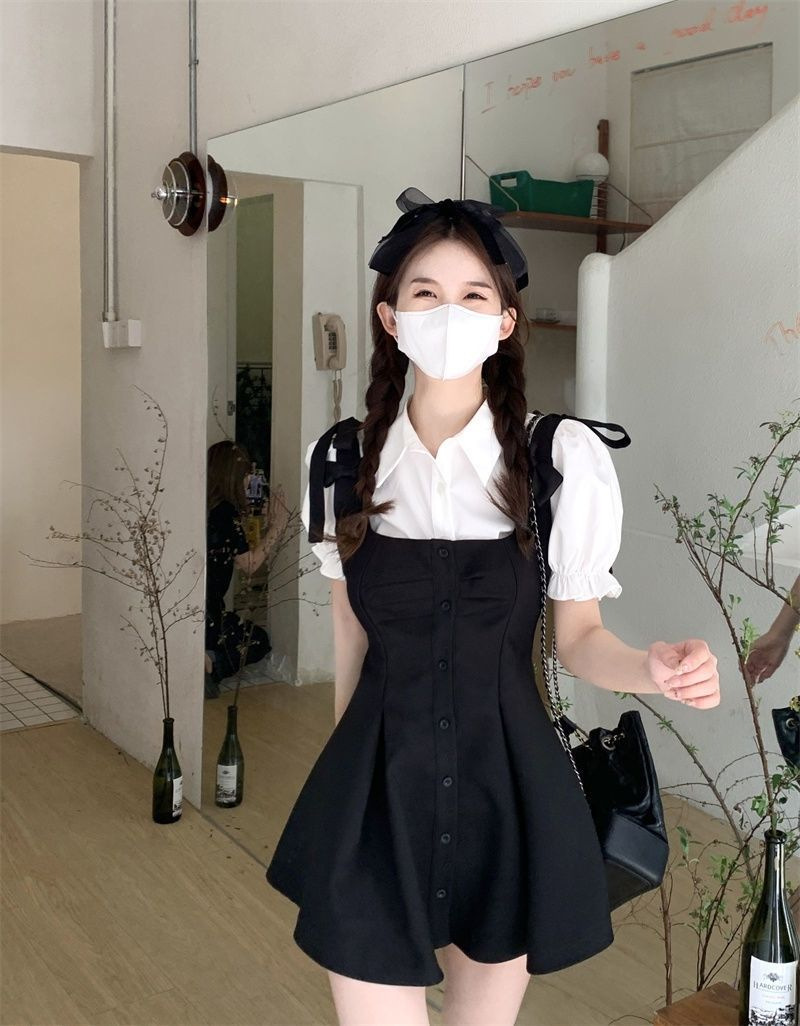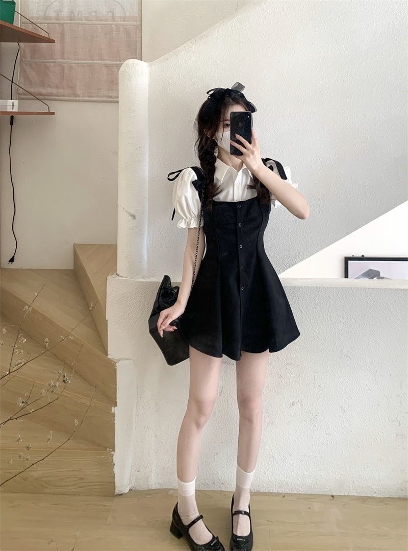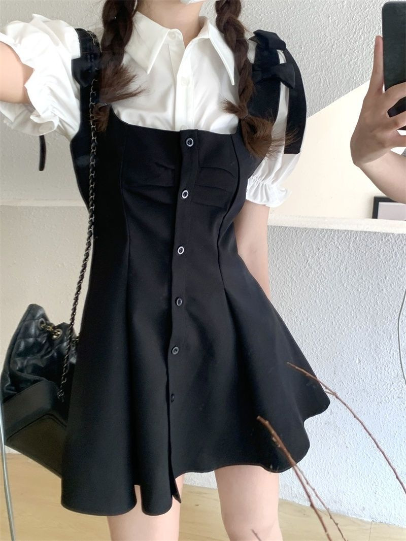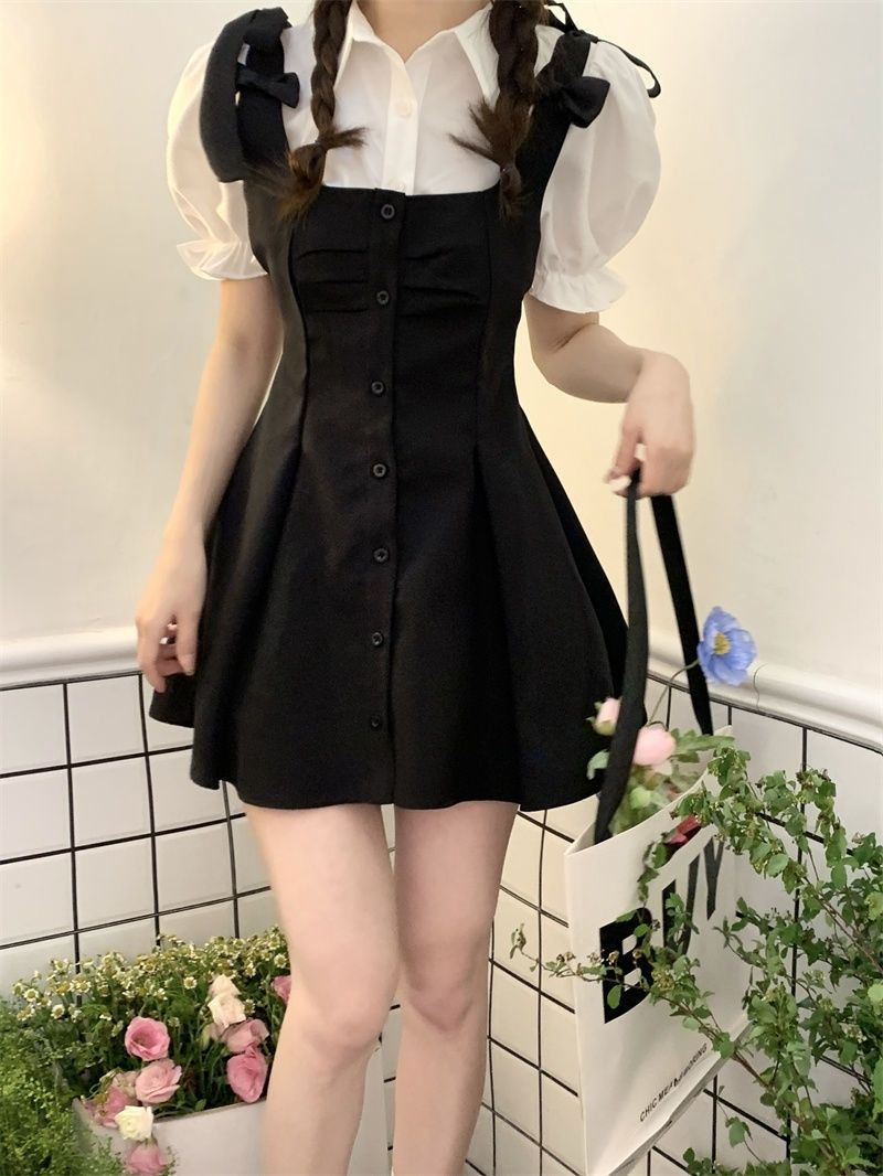 小个子茶系穿搭【衬衫背带连衣裙套装女】夏季学院风 初恋甜美两件套