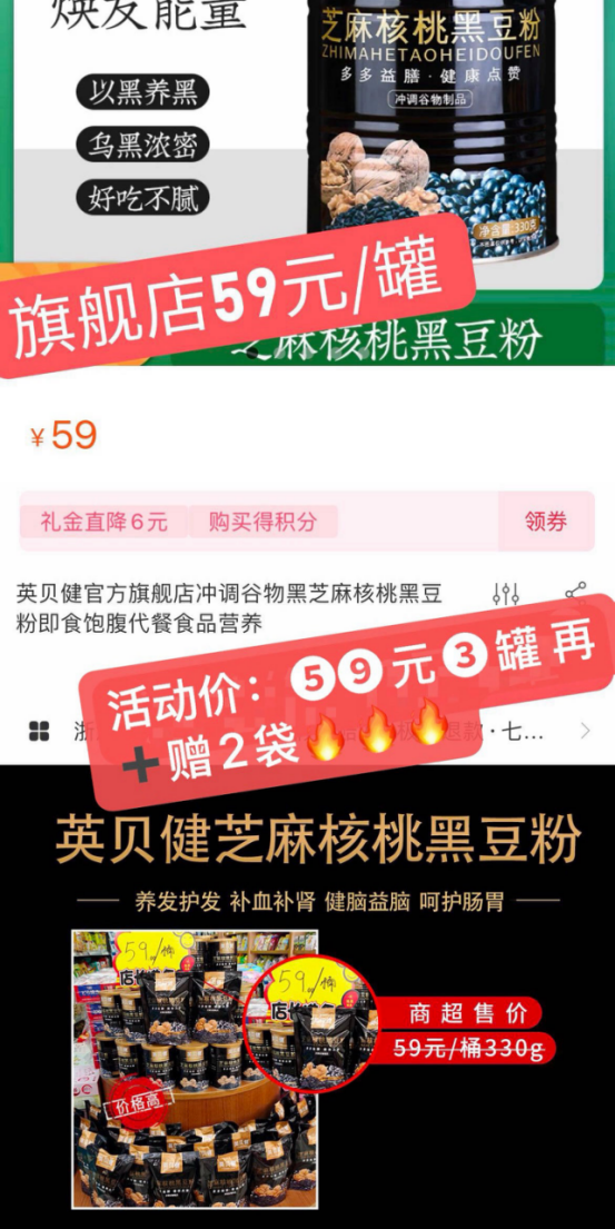 英贝健的产品遍布20万➕家线下实体店,是进母婴店的牌子!是营养食品专家领导者👑 这款英贝健黑豆粉线上线下🉐价格都不便宜‼️ 全部是59元一罐,回购率超高‼️‼️ 现在我们再次回馈铁粉‼️ 💰❺❾元❸罐 再➕赠2袋🔥🔥🔥