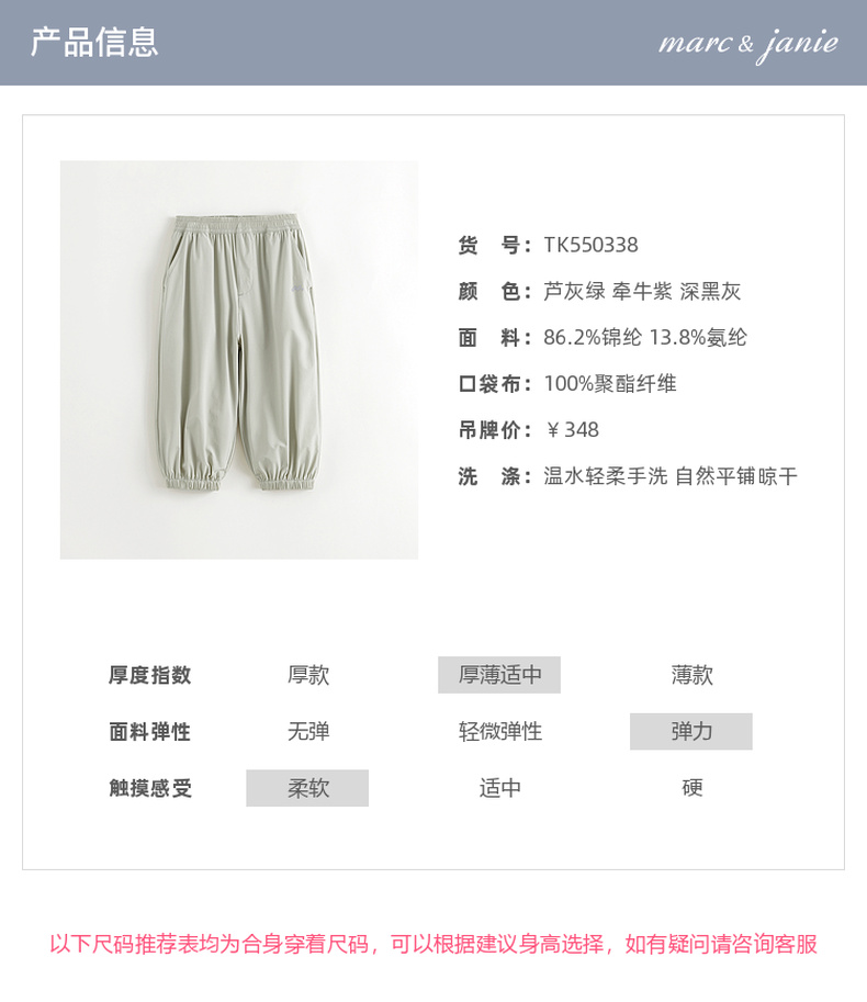 [超轻速干]马克珍妮男女童微弹轻便速干裤儿童裤子防蚊春夏550338