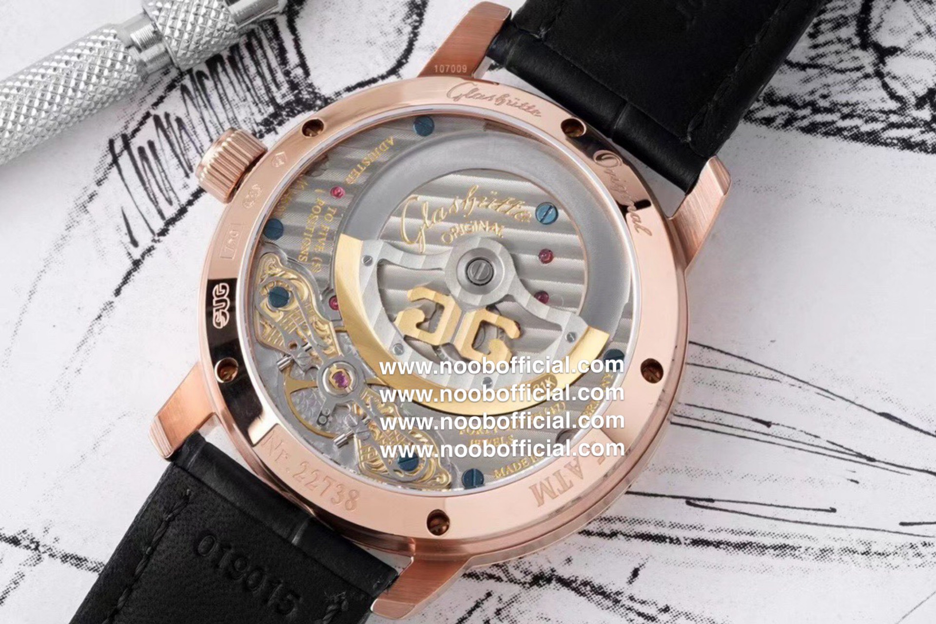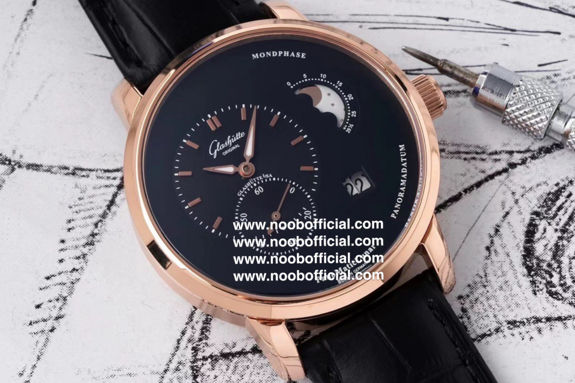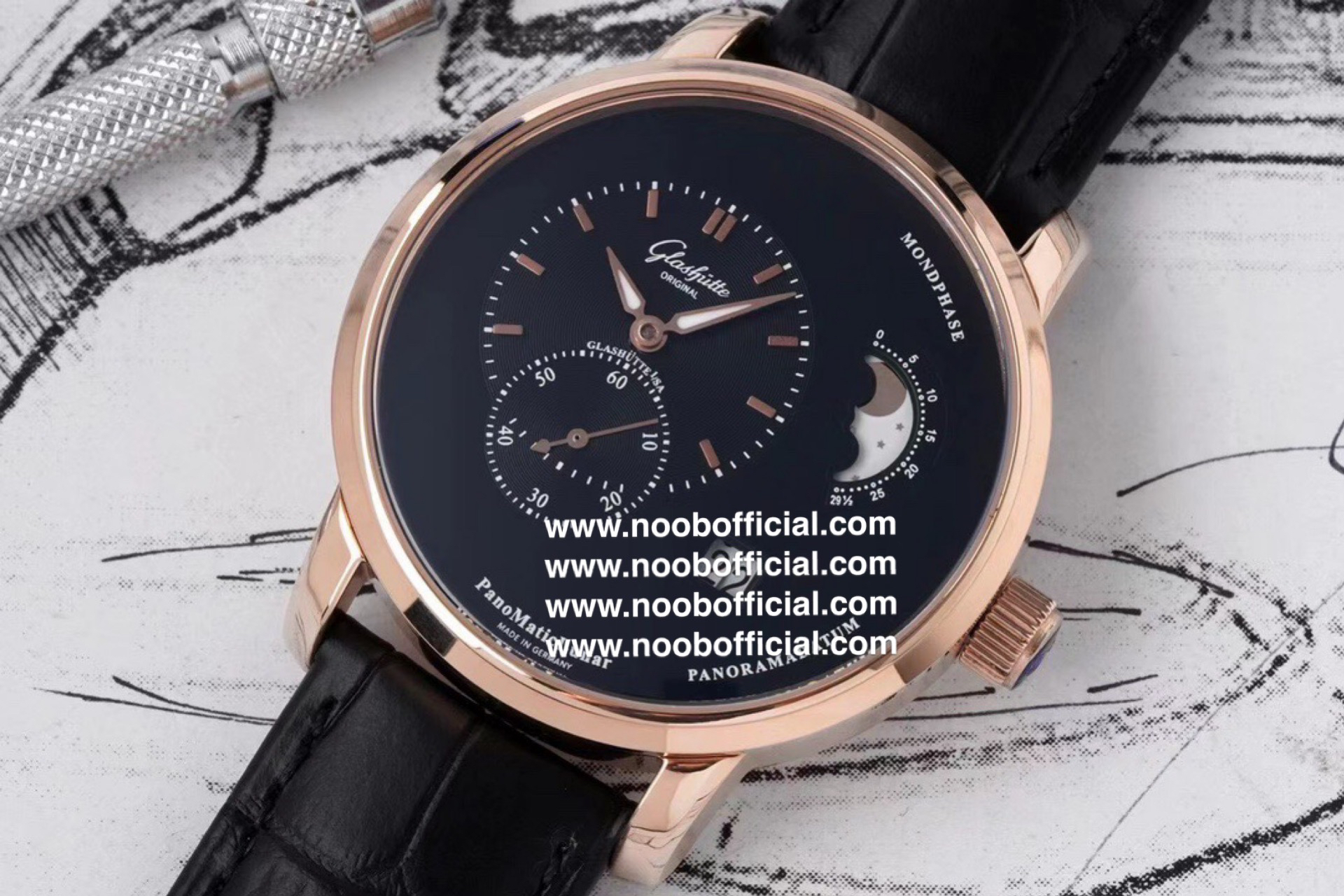 NOOB工厂最有“德味儿”的腕表———格拉苏蒂原创90偏心大日历月相,订制机芯的双跳大日历显示,日期显示的个位和十位并不在同一个日期圈上,有两个独立的显示盘,采用双模组设计