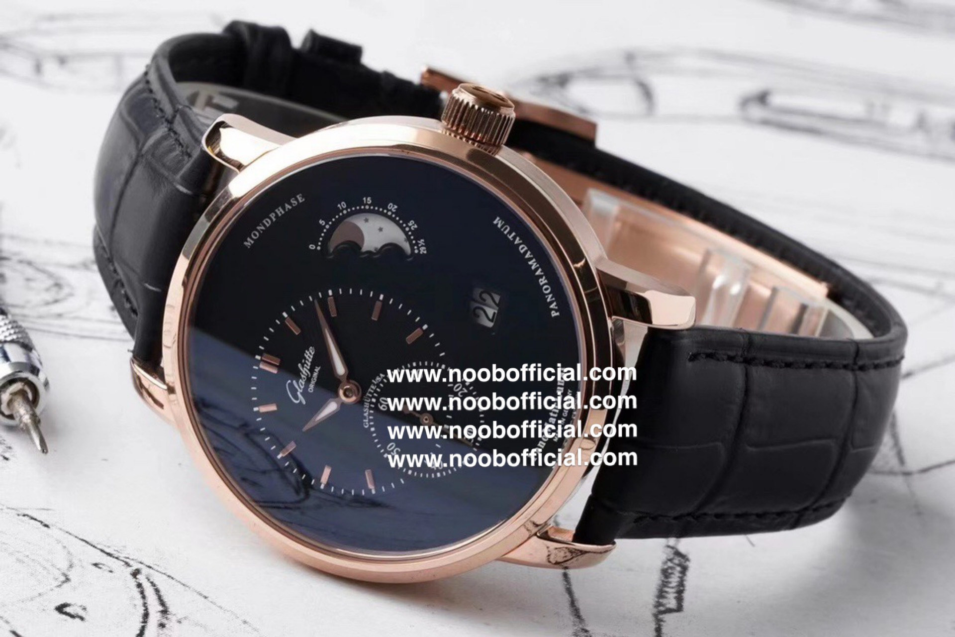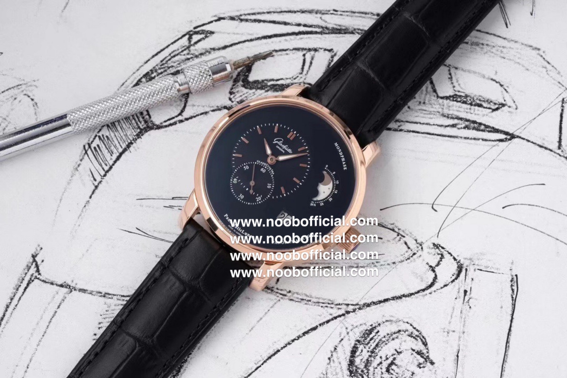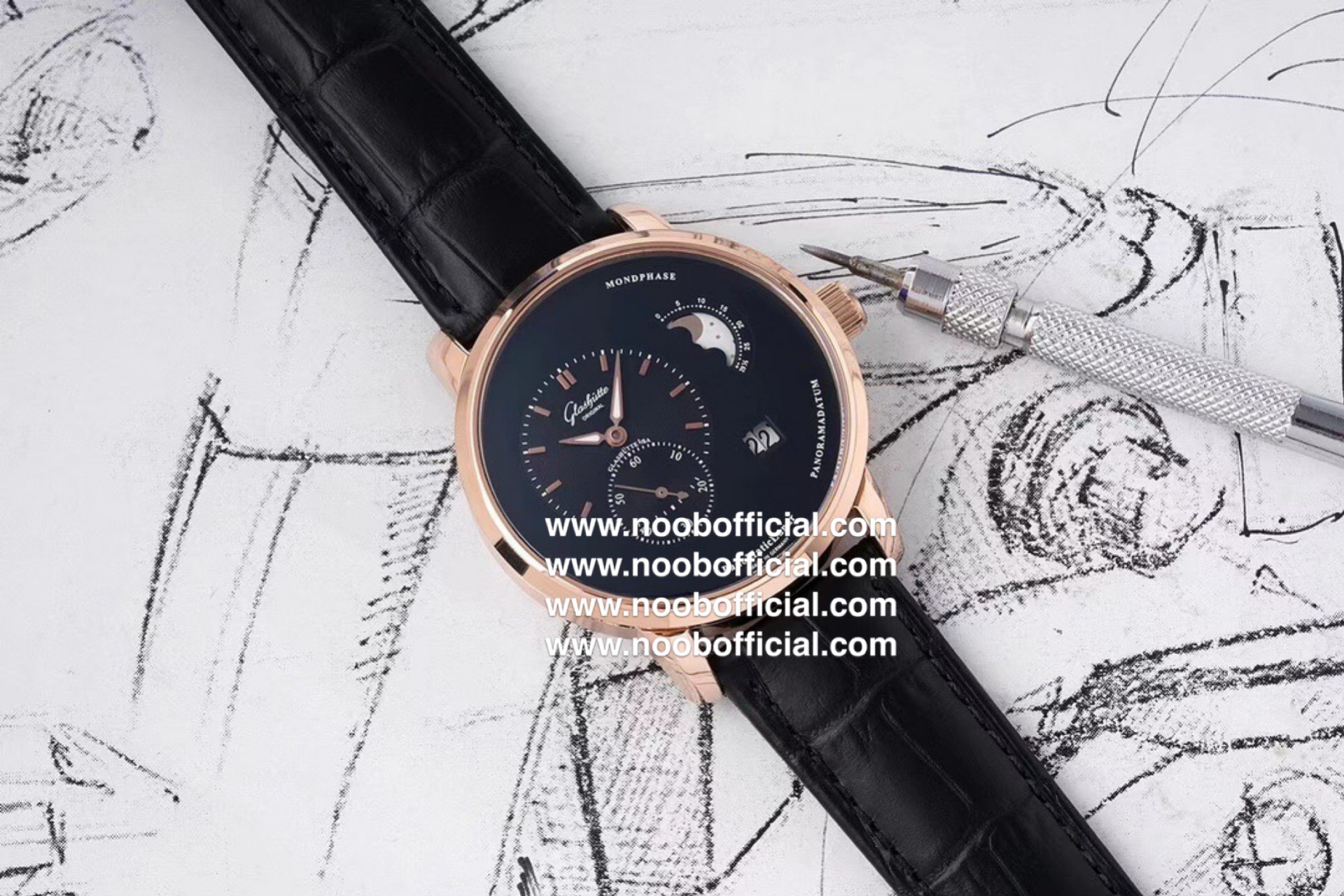 NOOB工厂最有“德味儿”的腕表———格拉苏蒂原创90偏心大日历月相,订制机芯的双跳大日历显示,日期显示的个位和十位并不在同一个日期圈上,有两个独立的显示盘,采用双模组设计