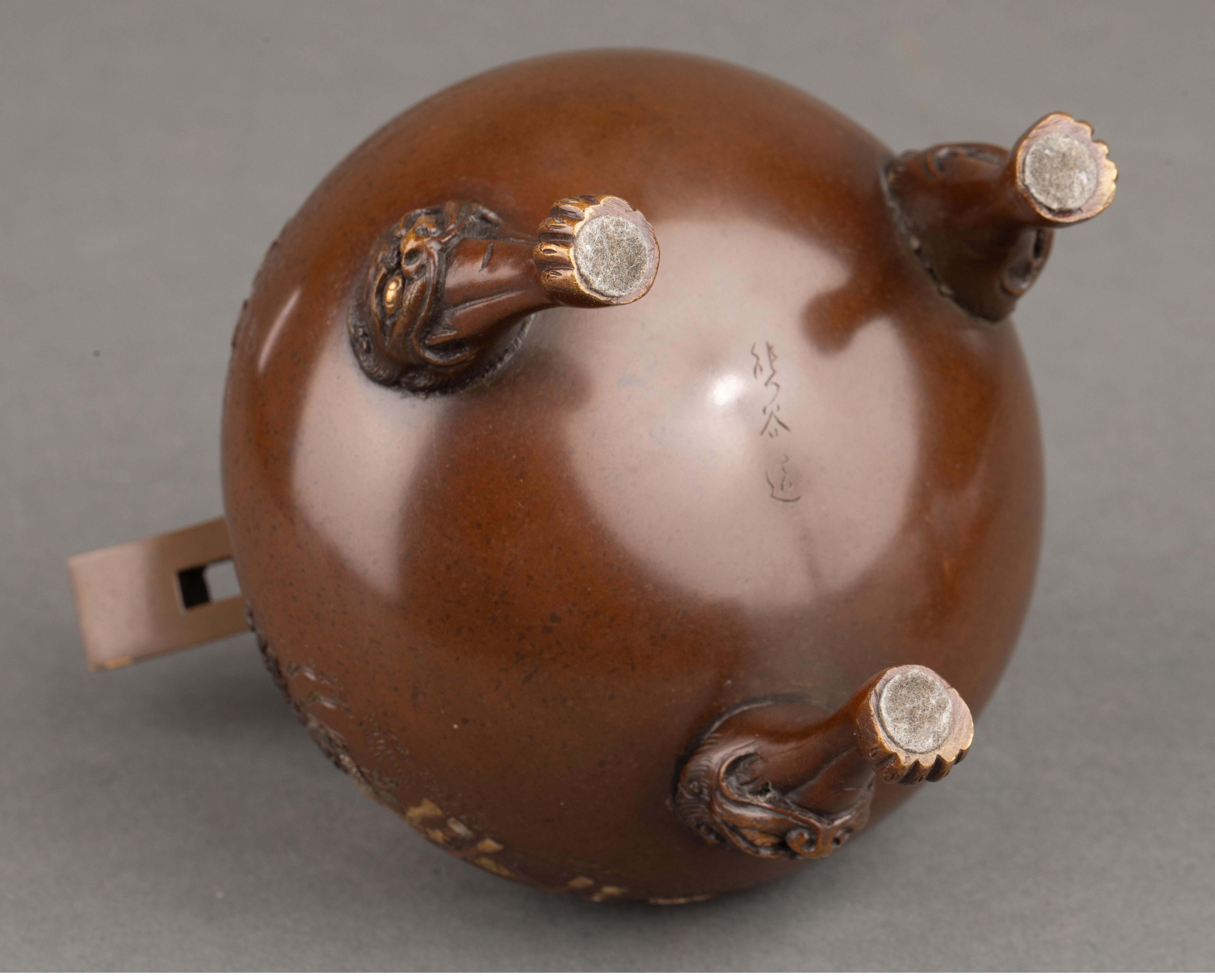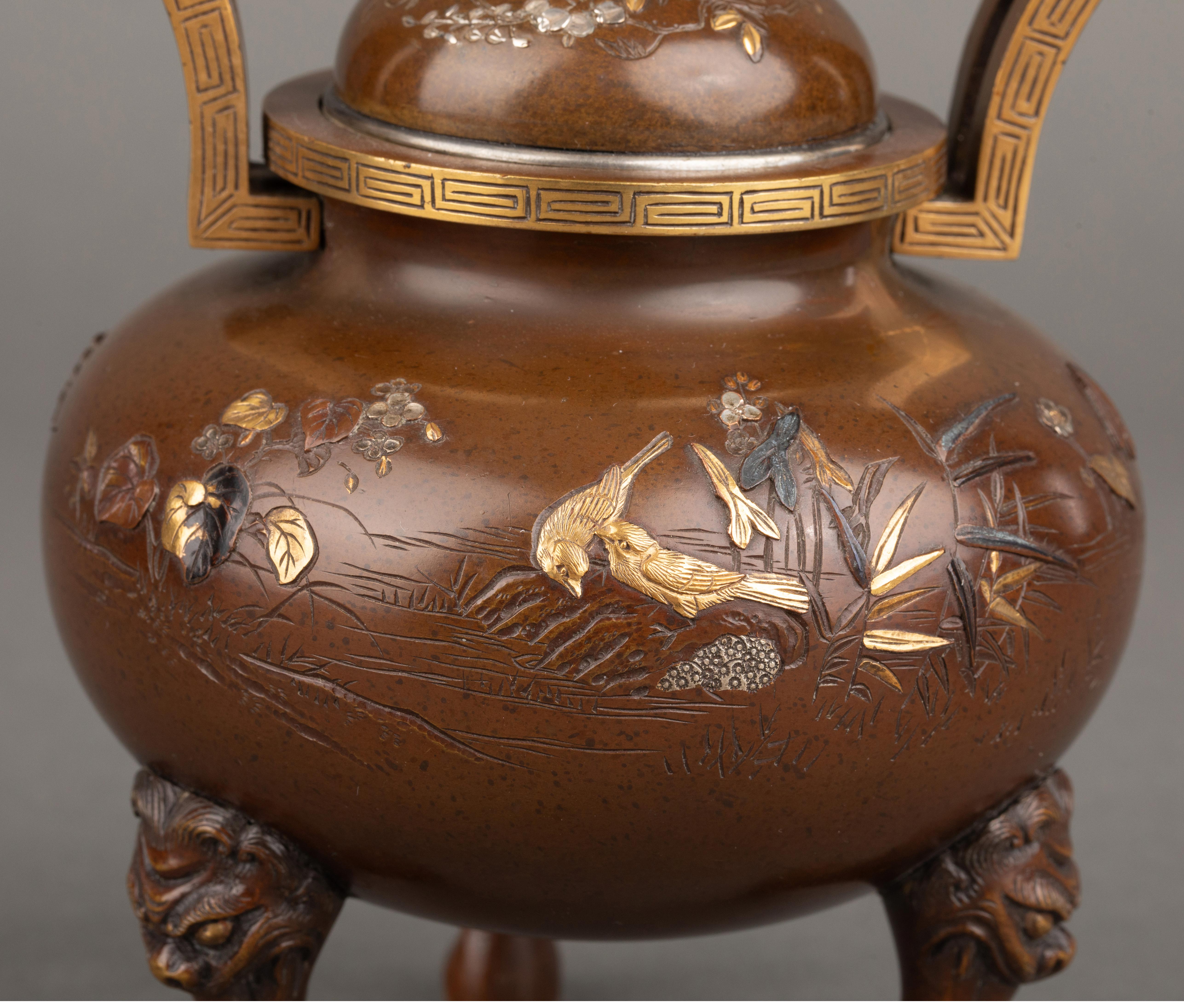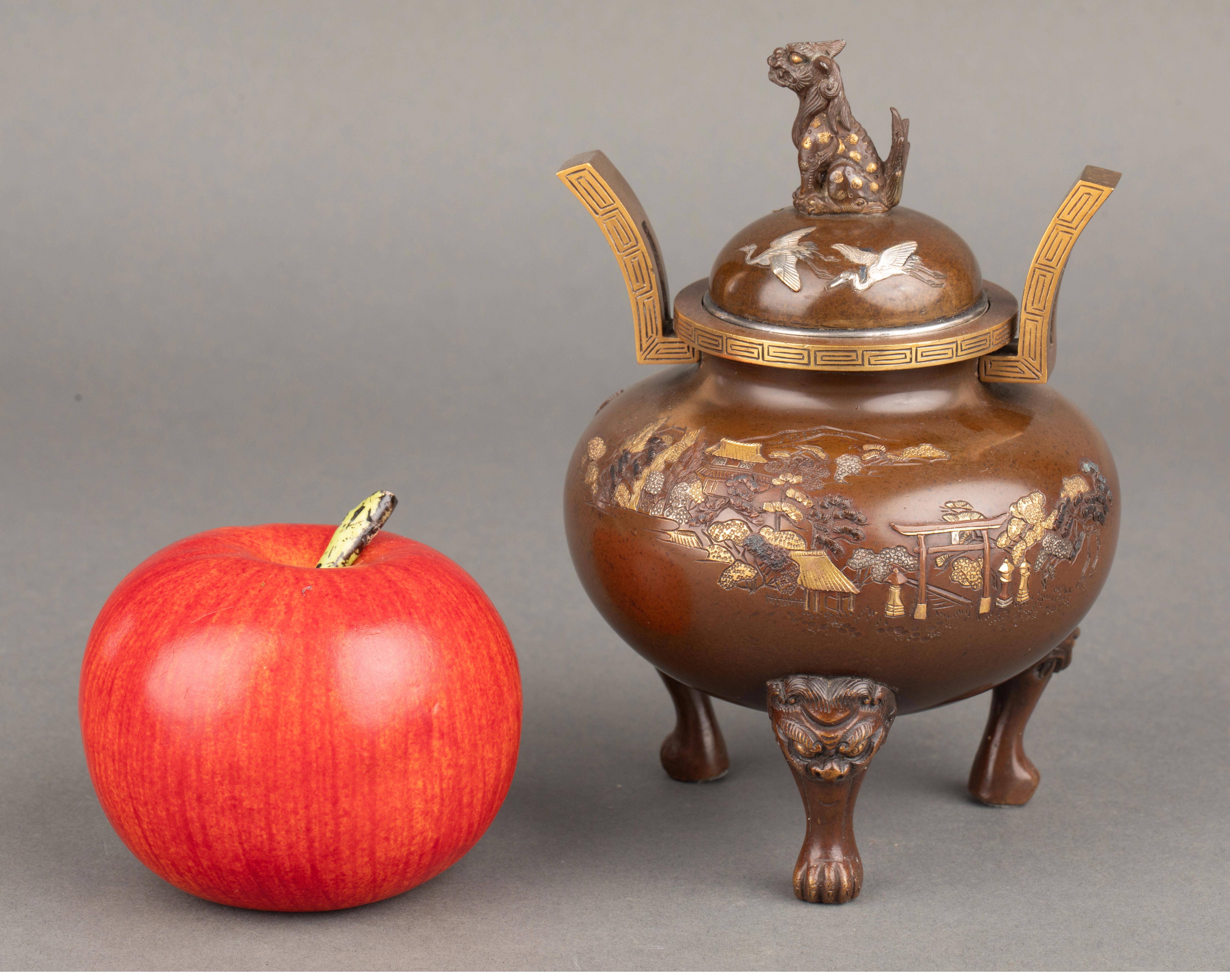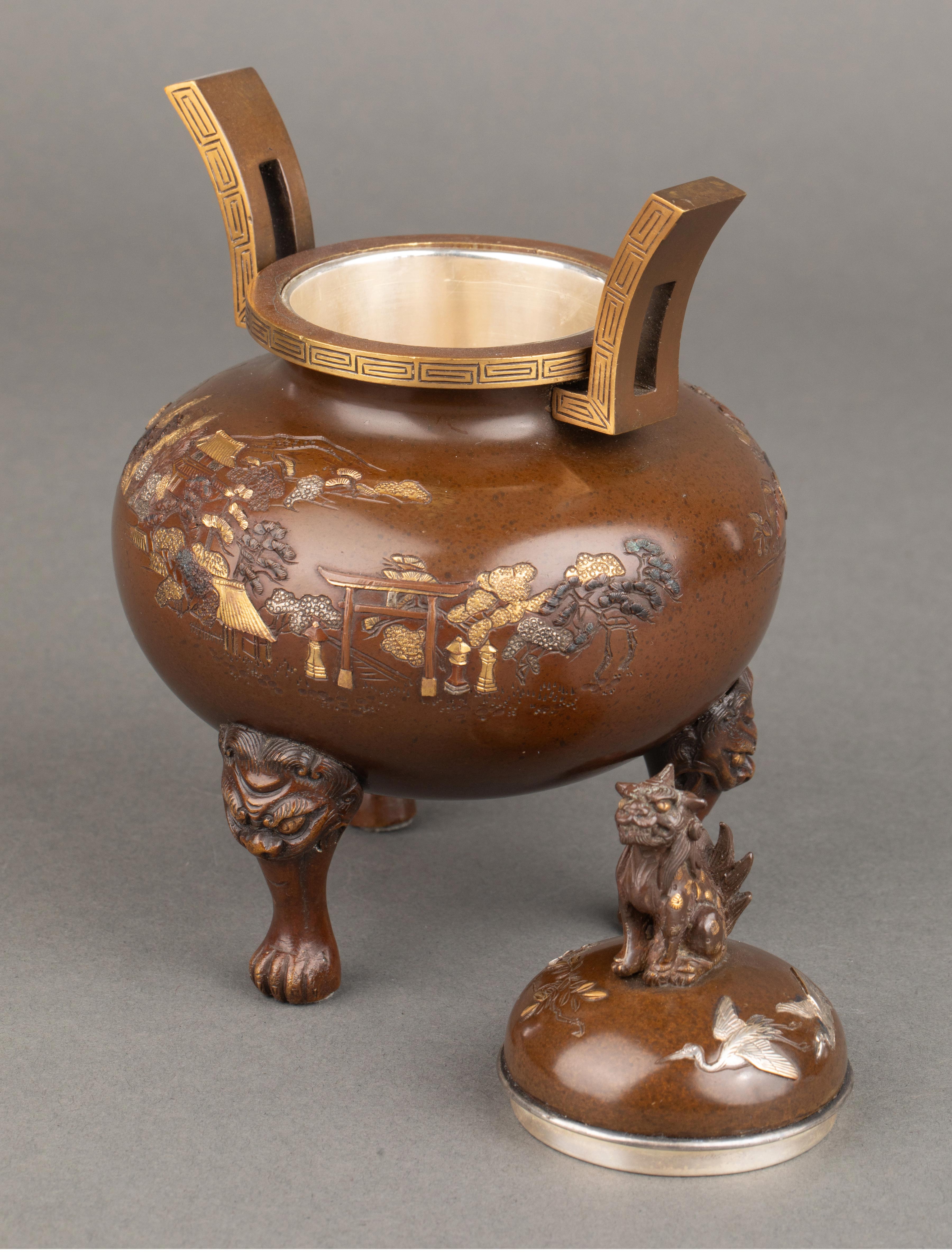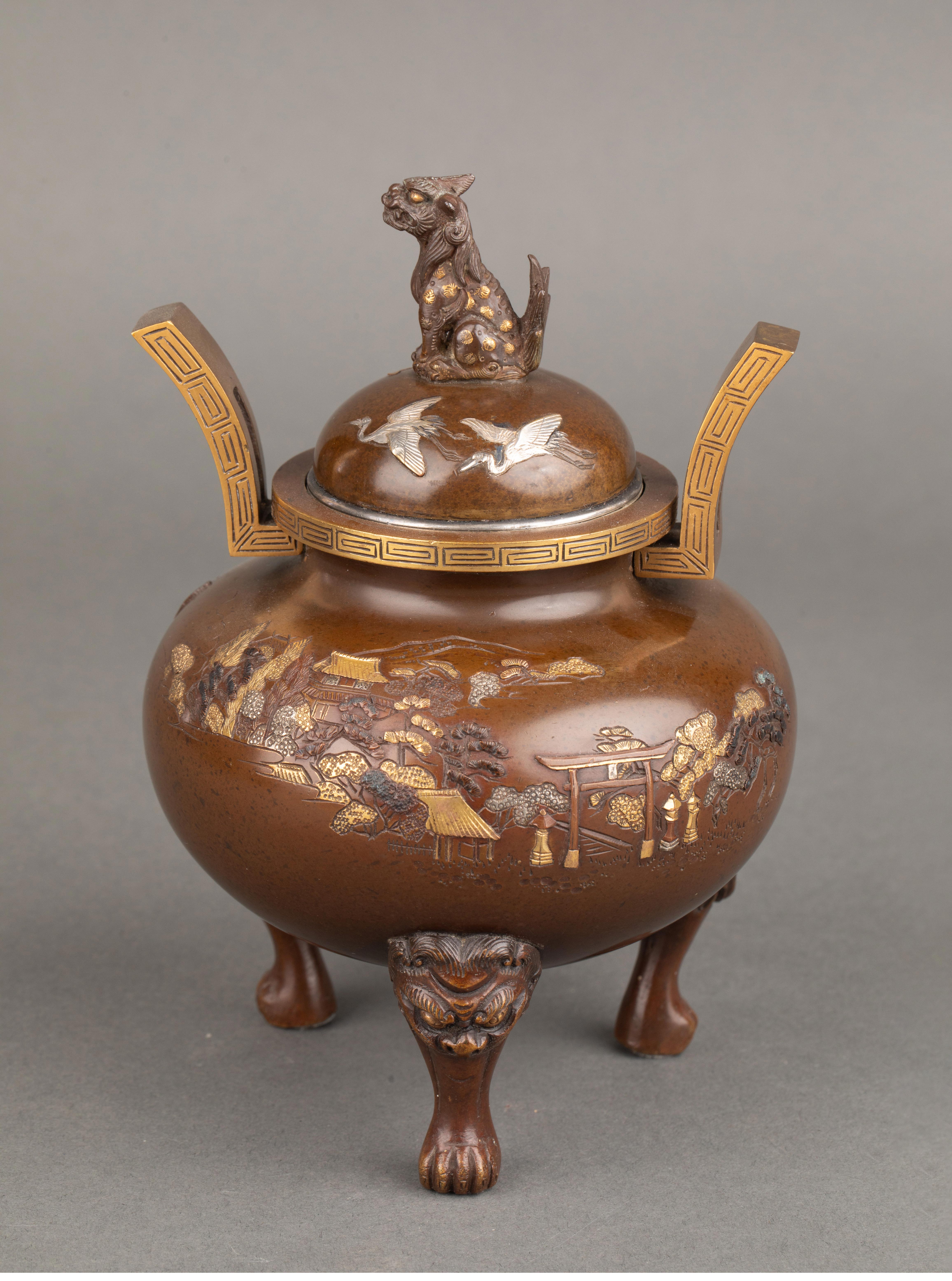 1880年代日本明治时期出品楼阁鹤鸟主题镀金银精雕装饰麒麟顶盖及兽纹三足底座赤铜香炉