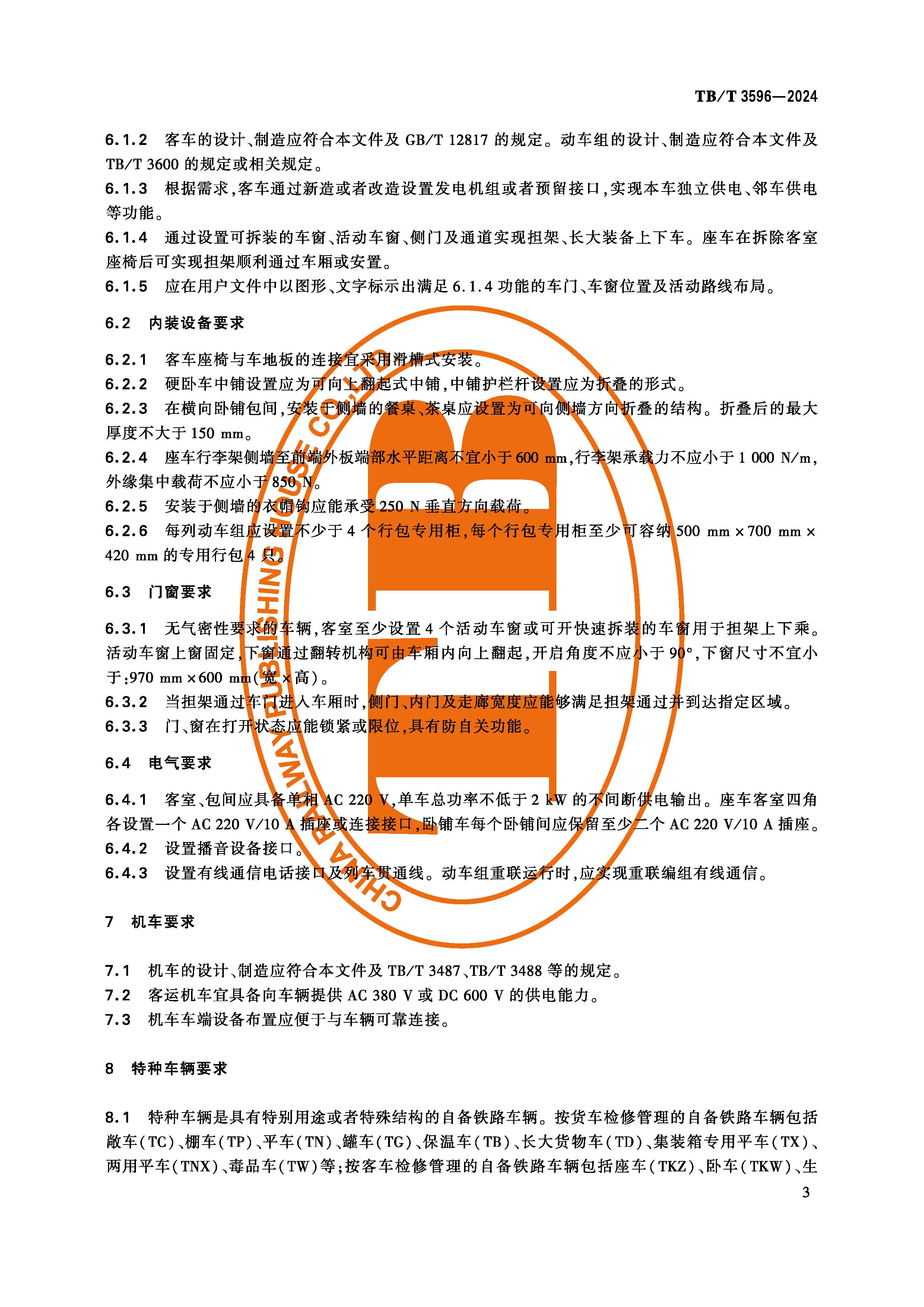 本标准为国家铁路局发布的铁道行业标准,技术标准2024年第4批(共4种铁标),铁标名称:《铁路机车车辆贯彻国防要求技术规范》