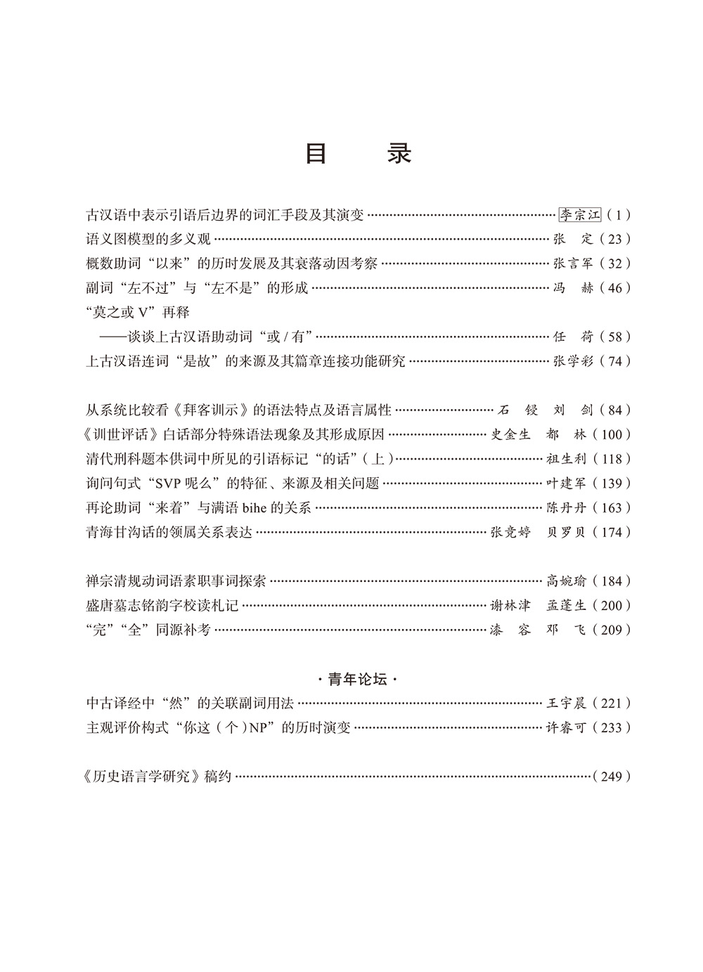 《历史语言学研究》是由中国社会科学院语言研究所历史语法与词汇学学科(中国社会科学院重点学科)主办、由商务印书馆出版发行的系列学术集刊,旨在为国内外历史语言学界提提供一个高水平的学术交流平台,以便更好地推进汉语历史语言学的发展。该刊自创刊以来,发表了一系列高水平的历史语言学及相关专业的学术论文。随着历史语言学的进一步深入发展,刊物目前的出版频率已不足以满足学界需求。为更好地服务学术、引领潮流,自2021年自2021年起,该刊由每年一期、繁体字版改为每年两期、简体字版。本期为2024年第二辑,总第22辑,共收入张定《语义图模型的多义观》等17篇文章,内容涉及语法、句法、词汇、语义、方言等多方面。