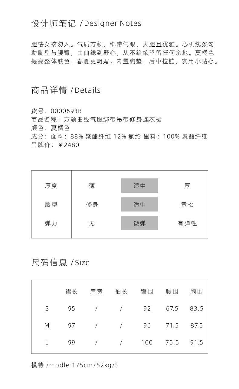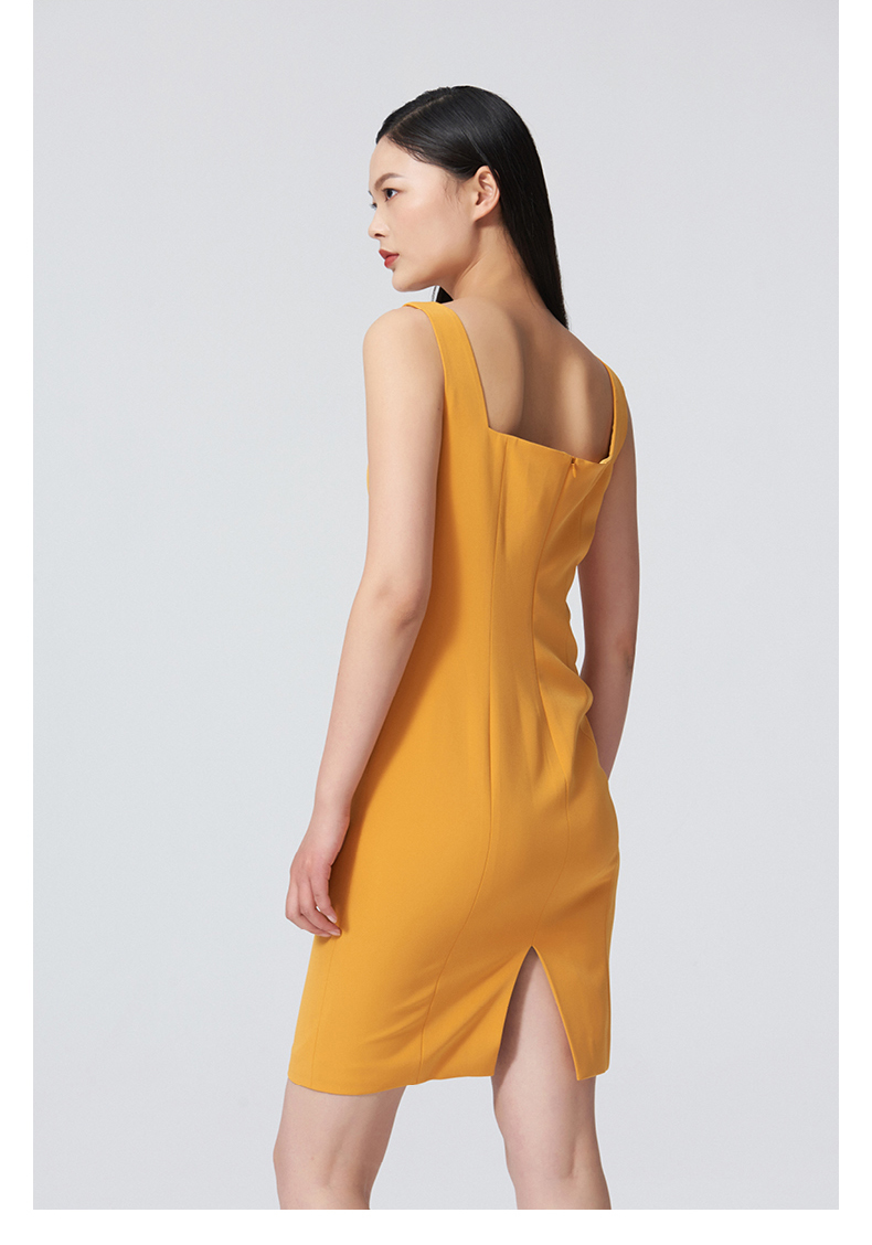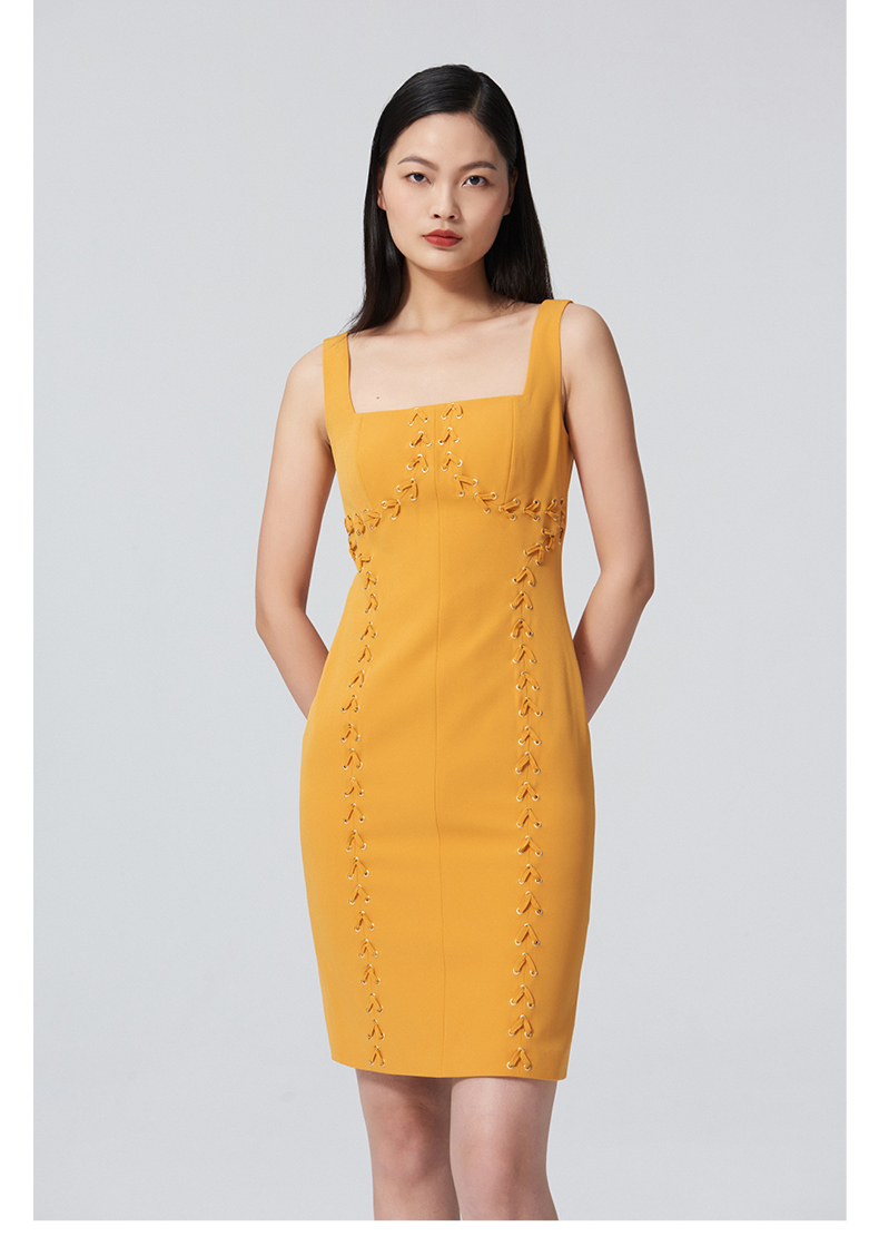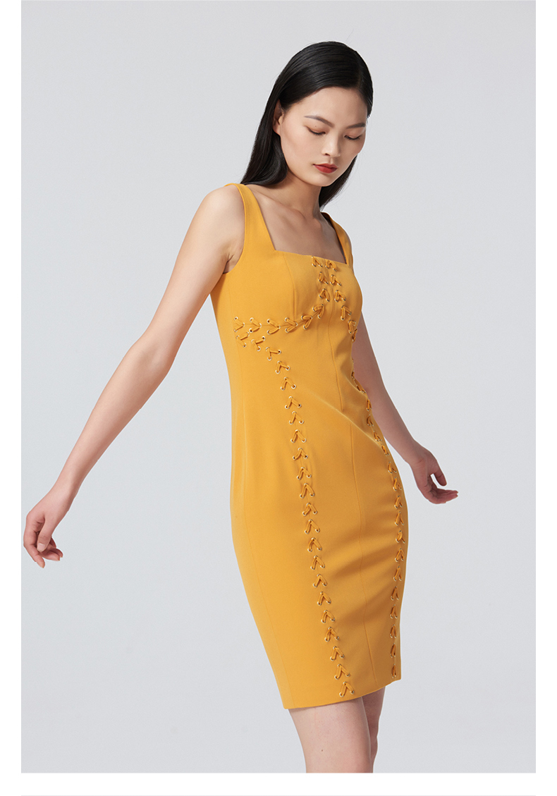 【丽比戴安娜】方领气眼绑带曲线设计吊带夏橘修身连衣裙/0000693B