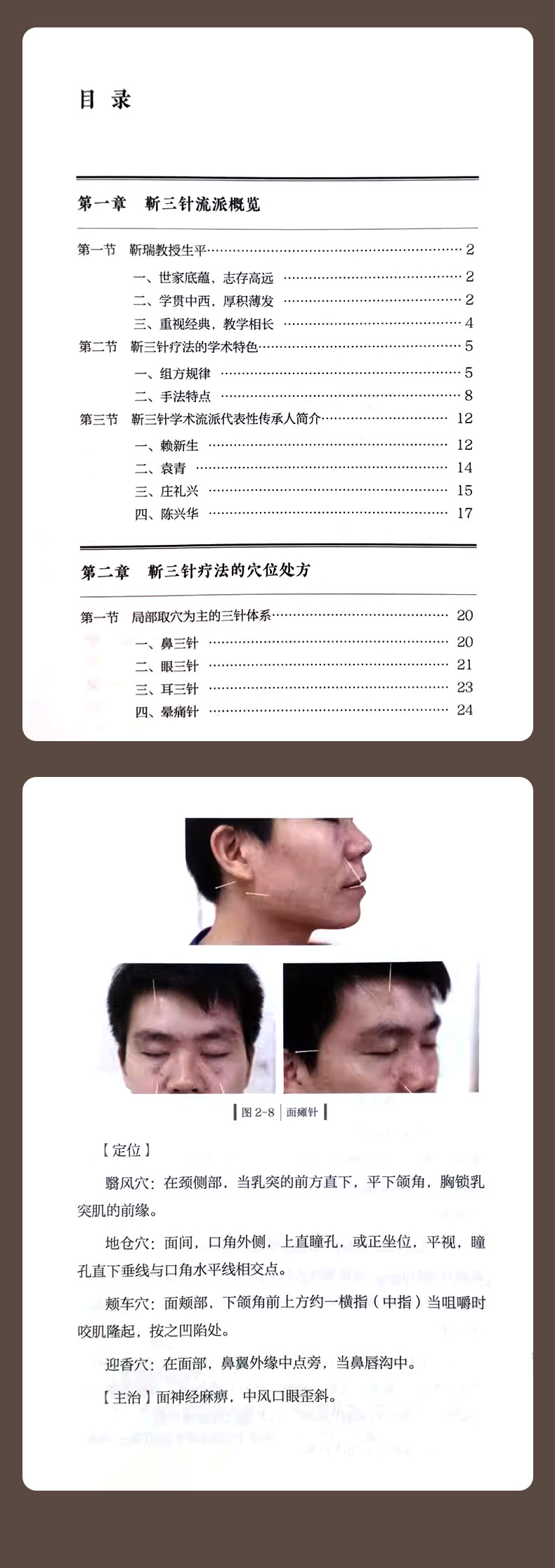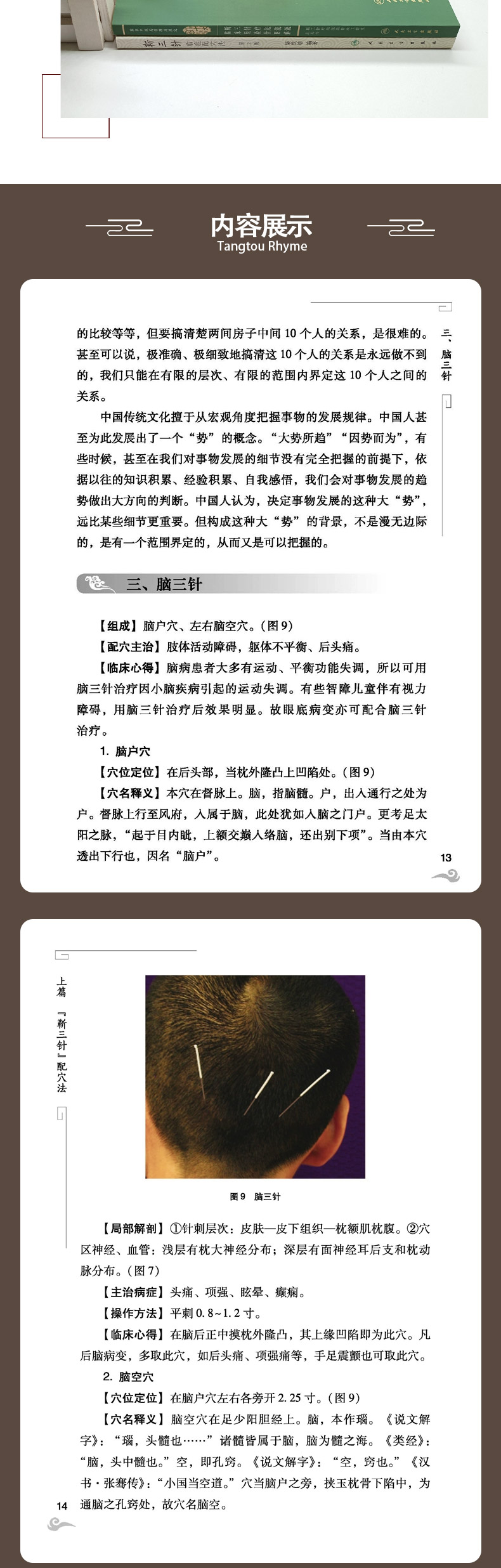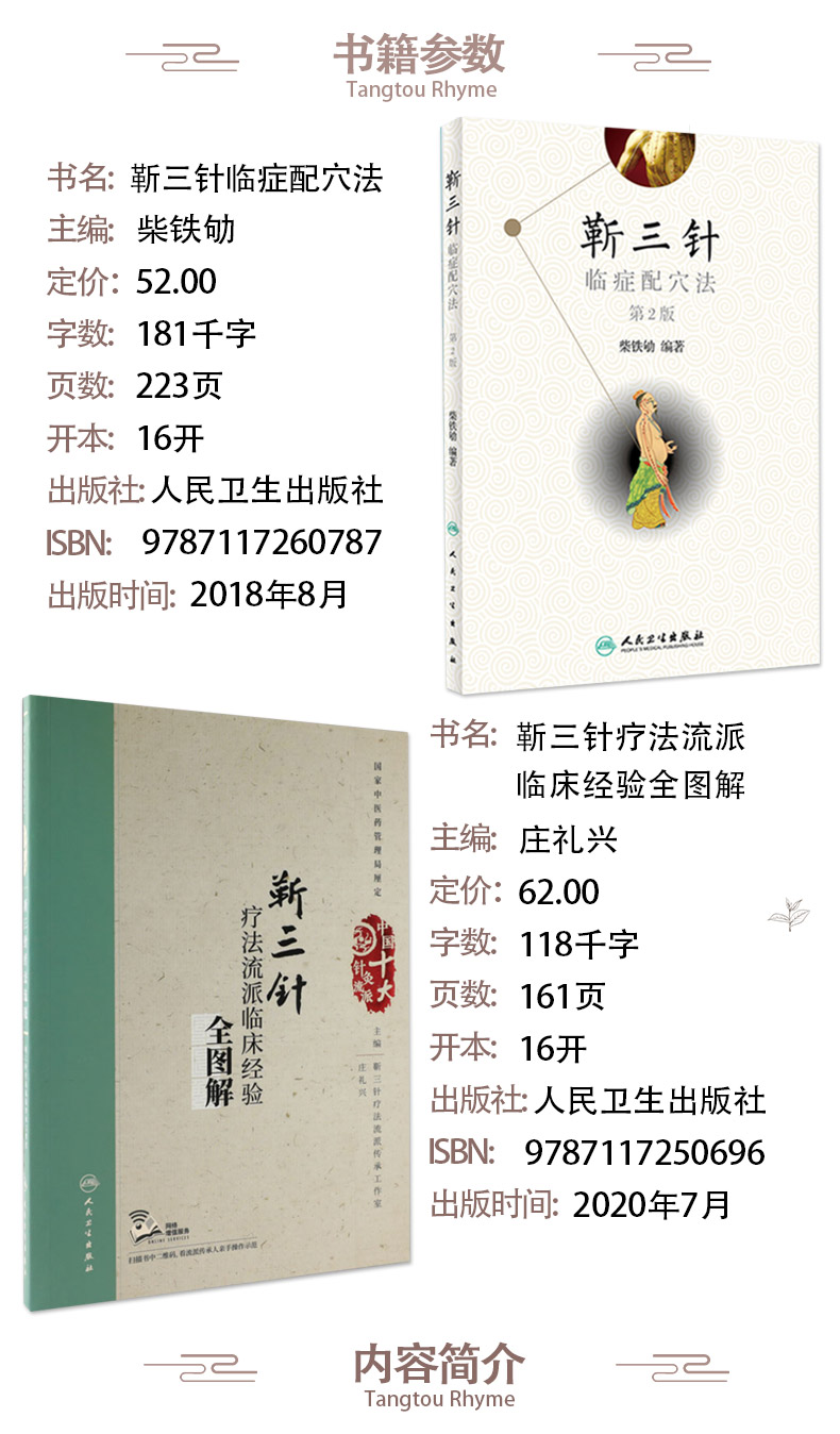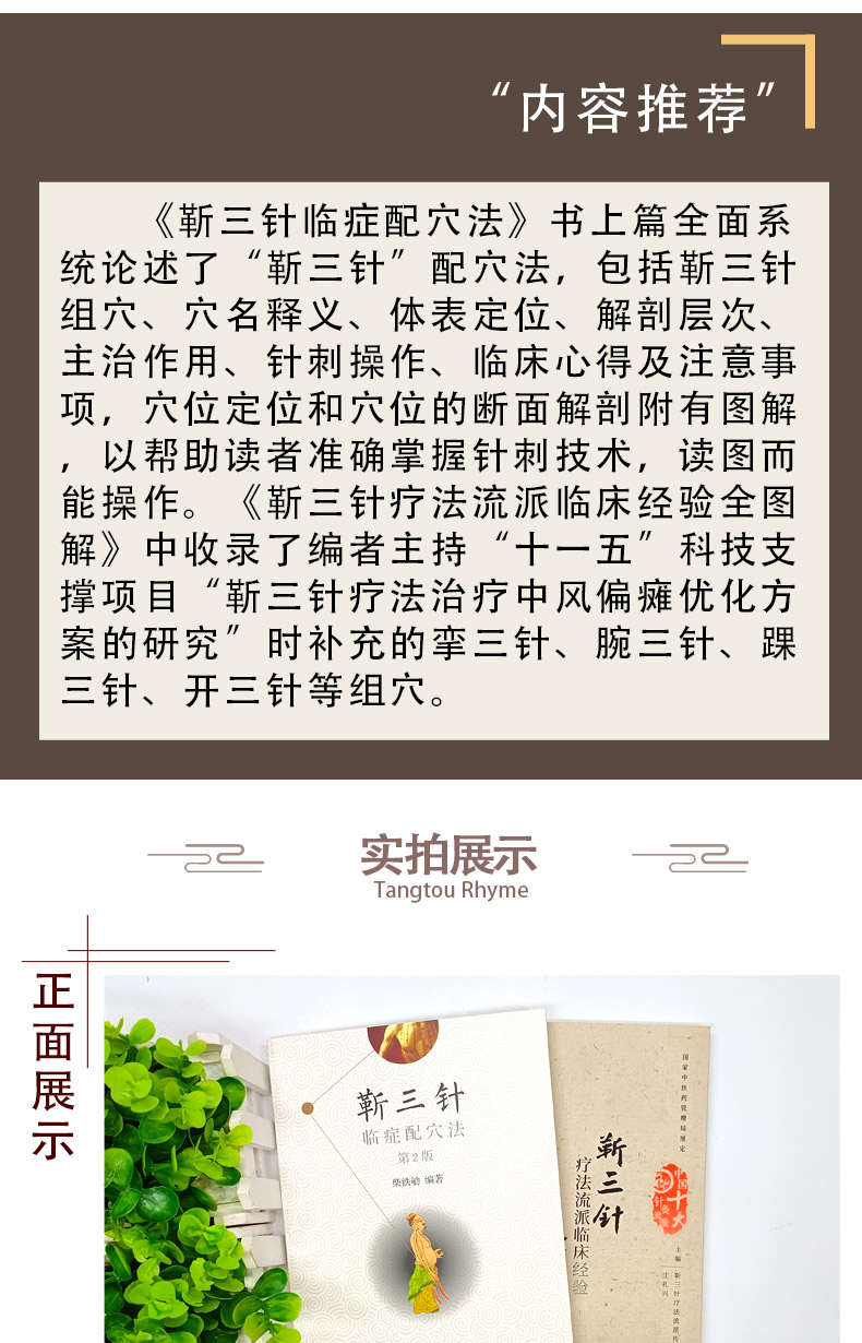 《靳三针临症配穴法》书上篇全面系统论述了“靳三针”配穴法,包括靳三针组穴、穴名释义、体表定位、解剖层次、主治作用、针刺操作、临床心得及注意事项,穴位定位和穴位的断面解剖附有图解,以帮助读者准确掌握针刺技术,读图而能操作。《靳三针疗法流派临床经验全图解》中收录了编者主持“十一五”科技支撑项目“靳三针疗法治疗中风偏瘫优化方案的研究”时补充的挛三针、腕三针、踝三针、开三针等组穴。