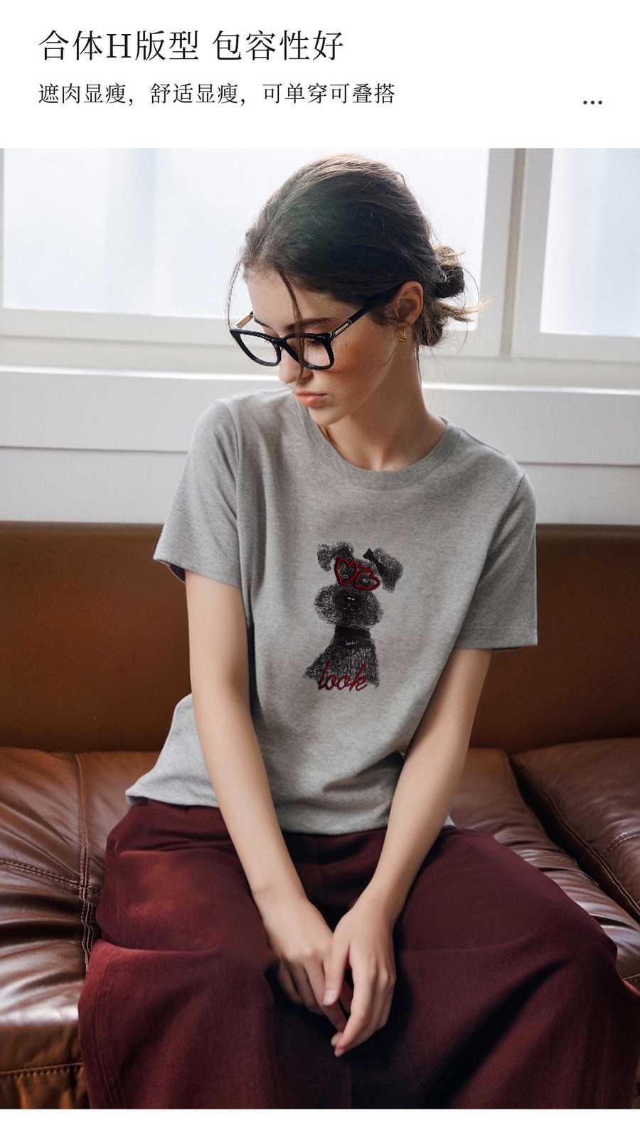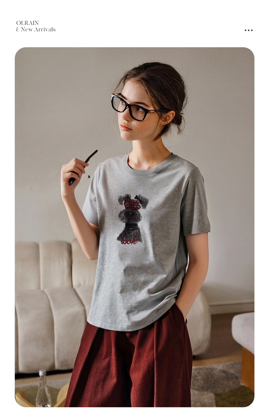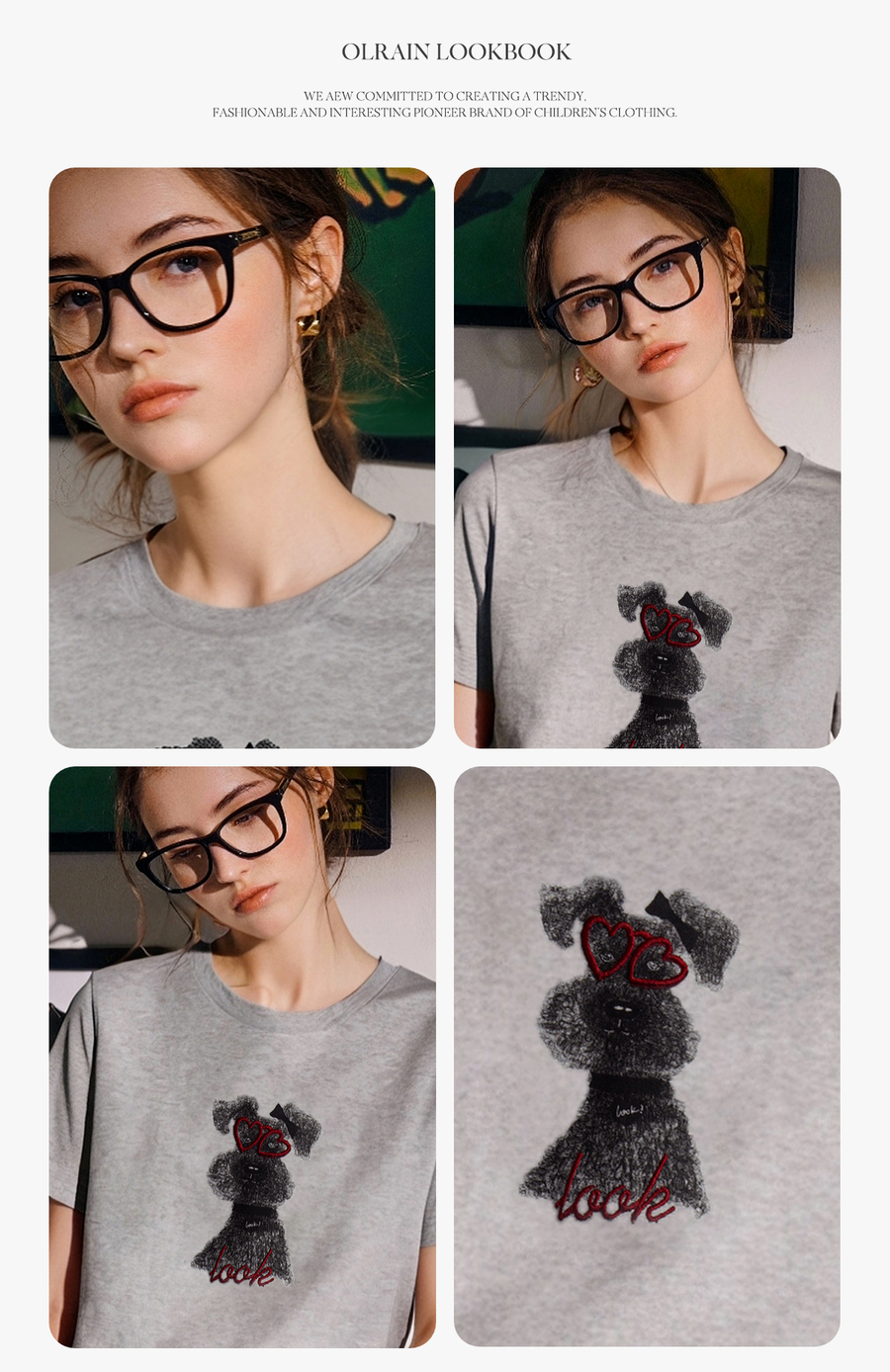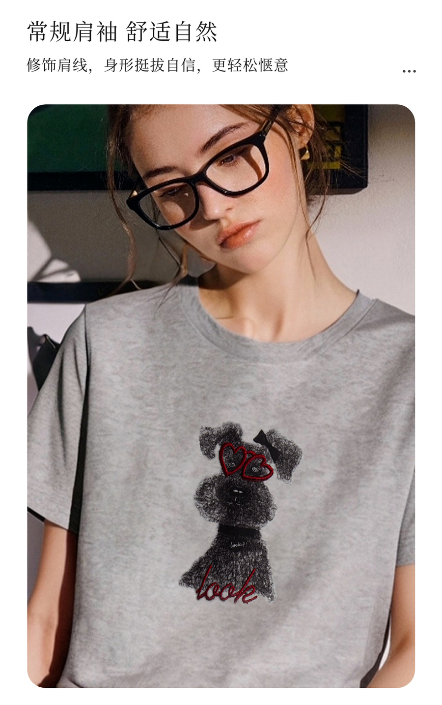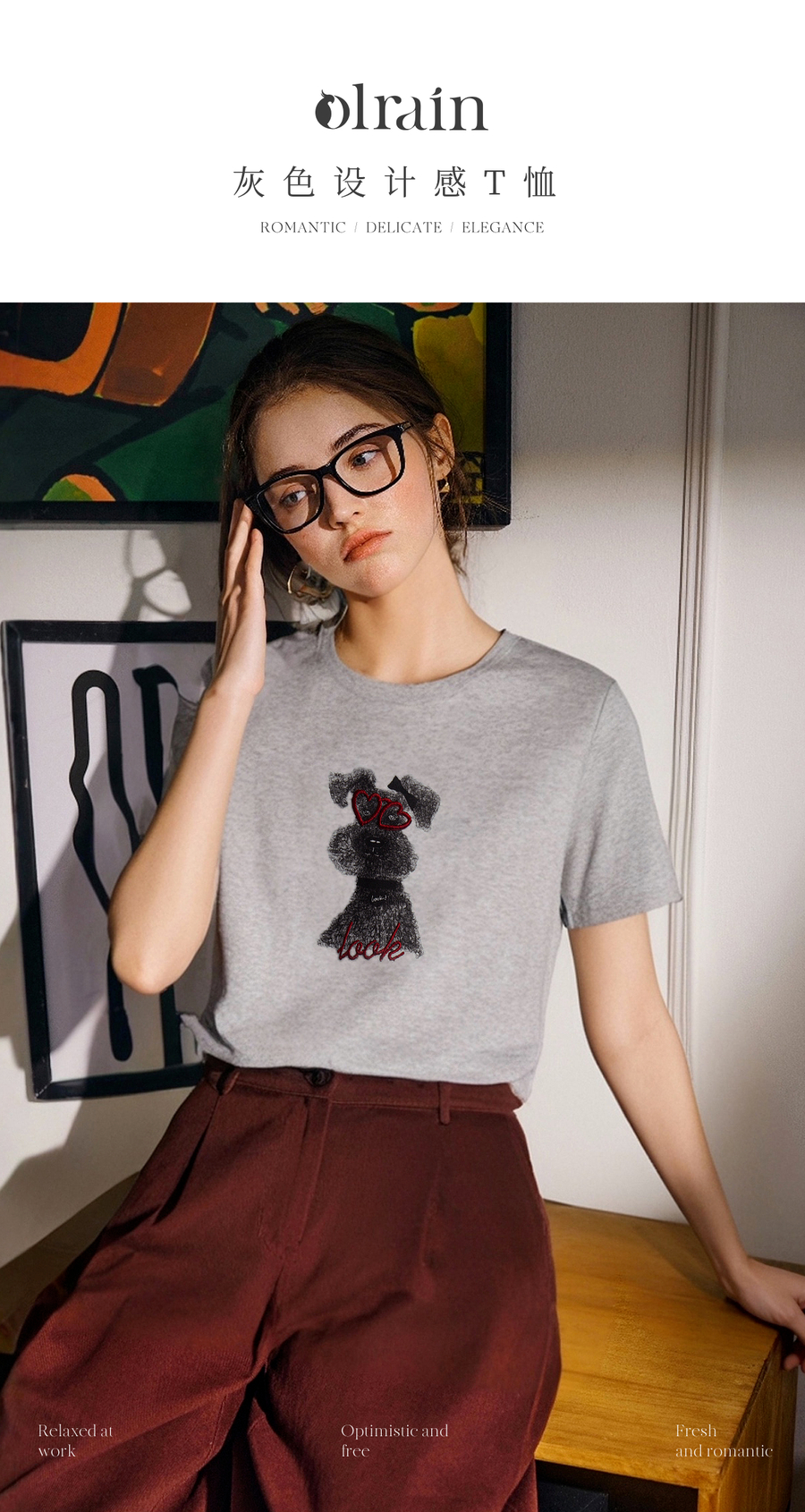 OLrain欧芮儿灰色设计感短袖T恤女夏季2025新款宽松印花刺绣上衣