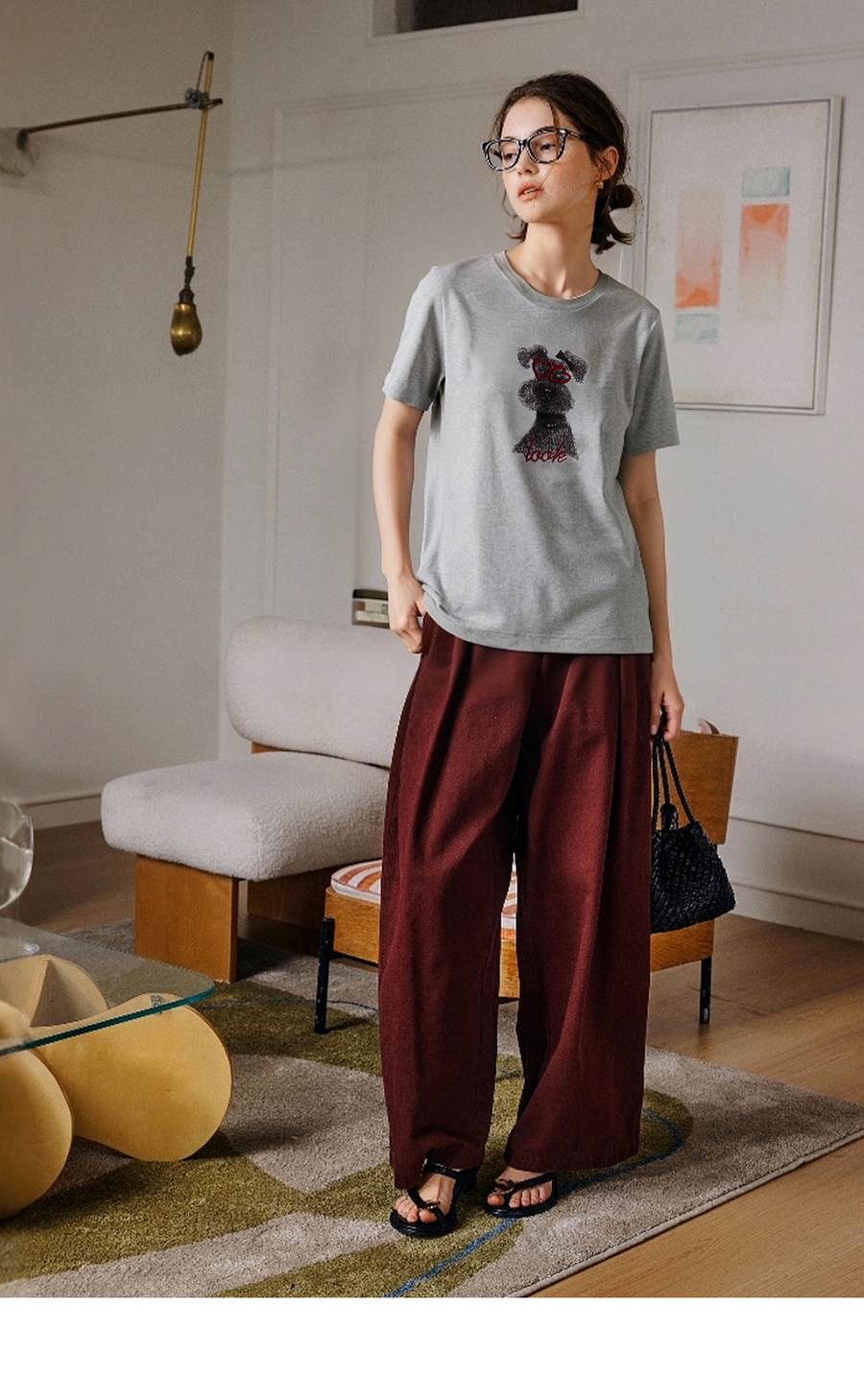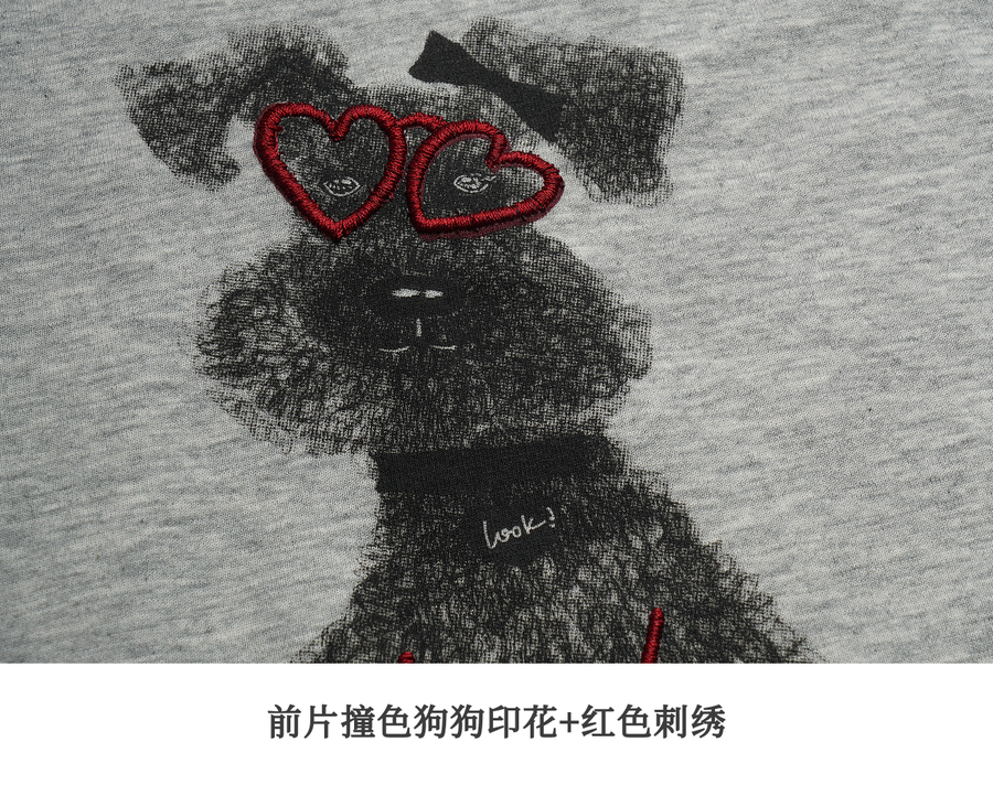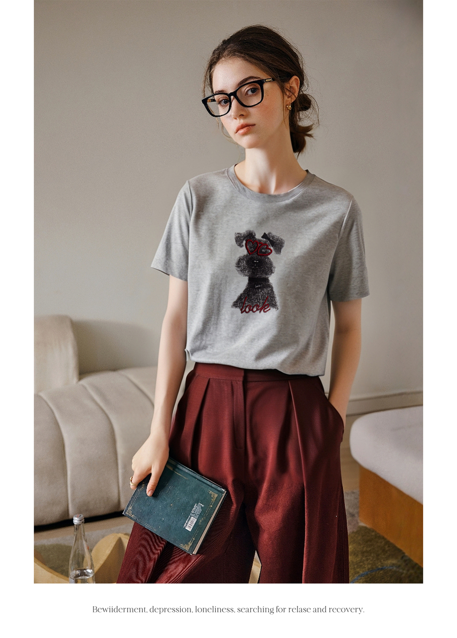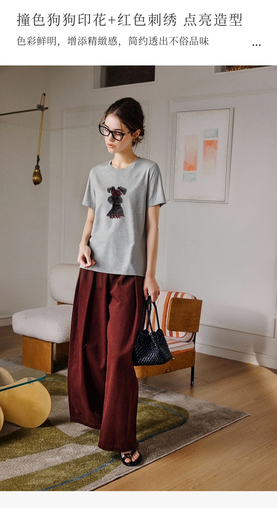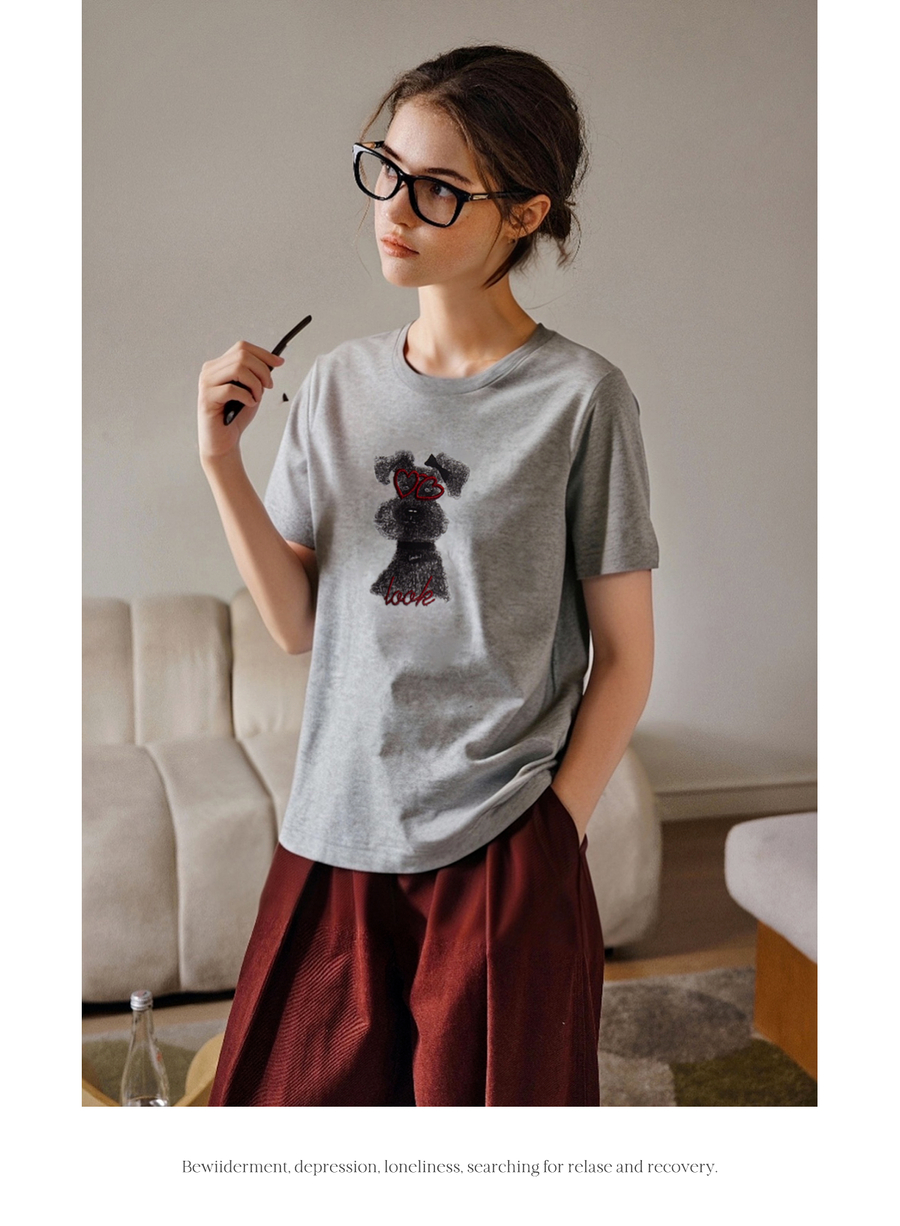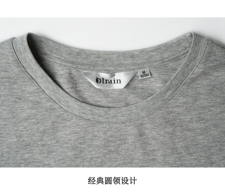 OLrain欧芮儿灰色设计感短袖T恤女夏季2025新款宽松印花刺绣上衣