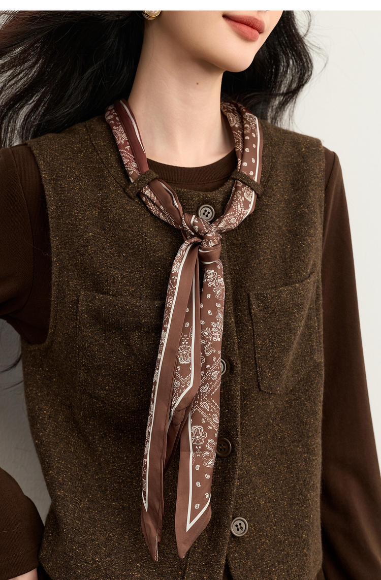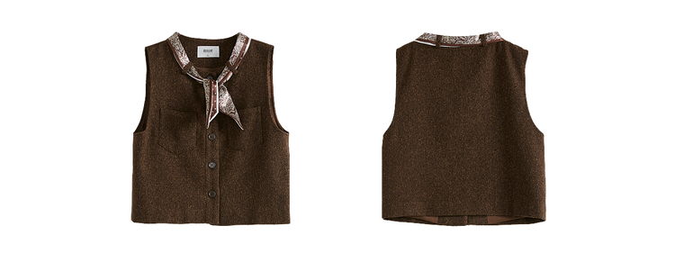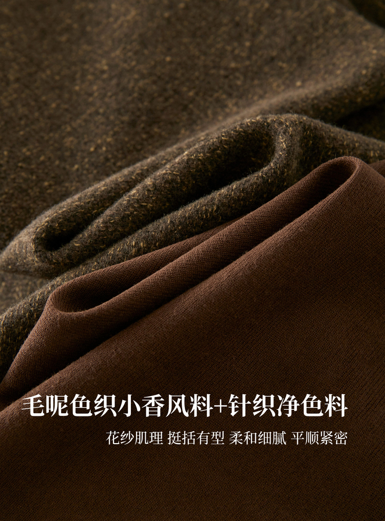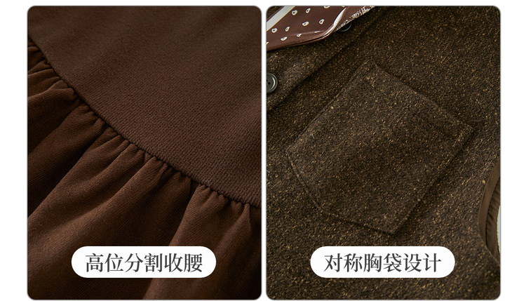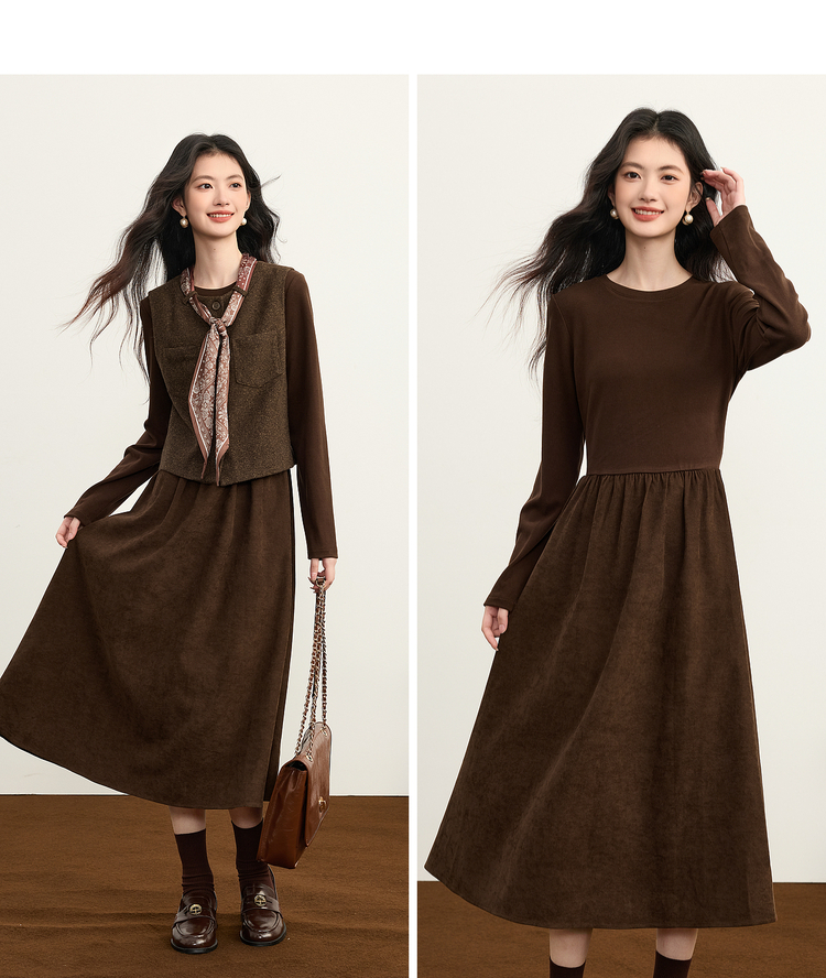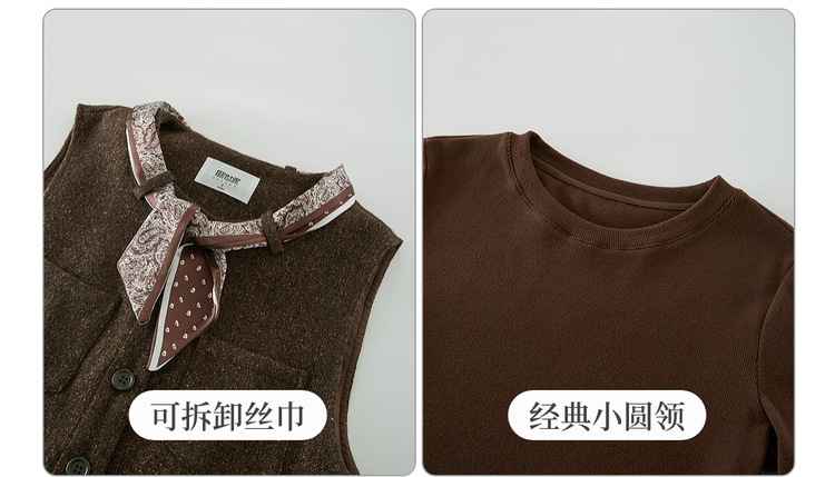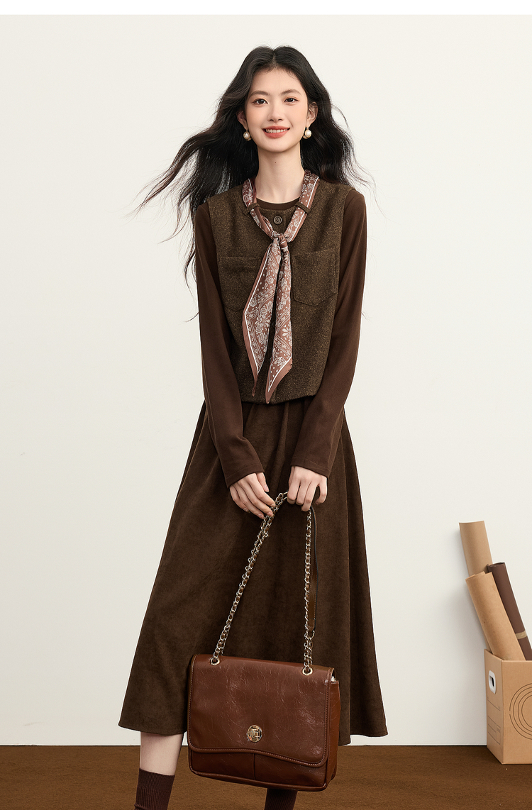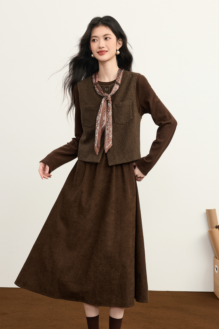 【12/03新品】熙世界轻熟小香风丝巾马甲棕色长袖连衣裙两件套装女2025秋冬新款