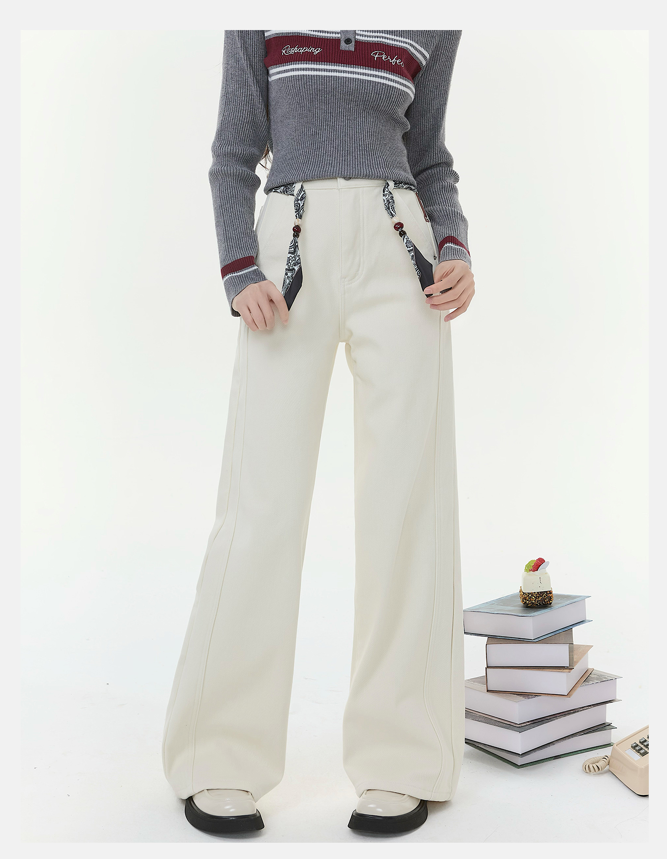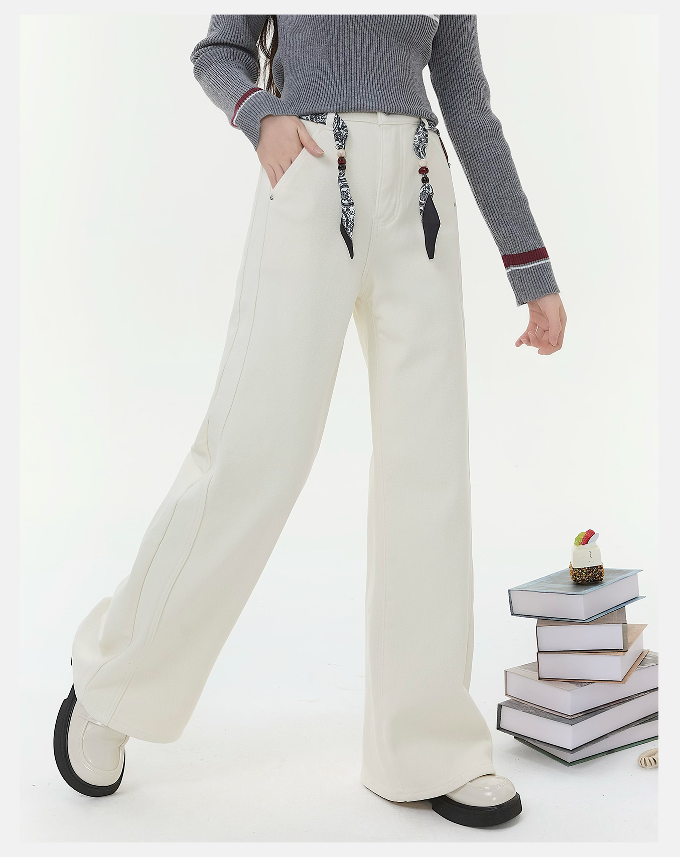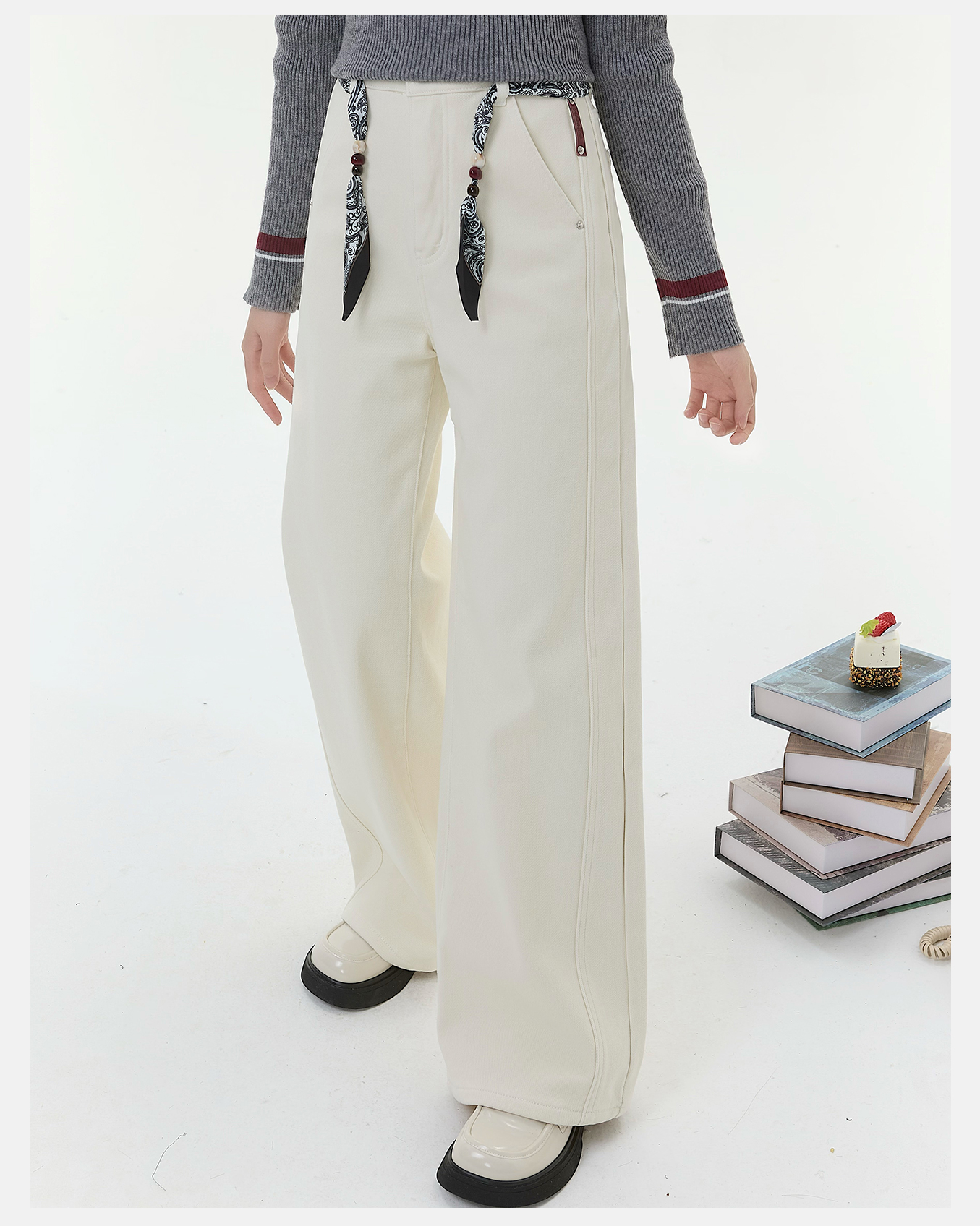 P&X设计师女装2025冬季直筒垂感拖地加绒牛仔长裤825410175 杏色