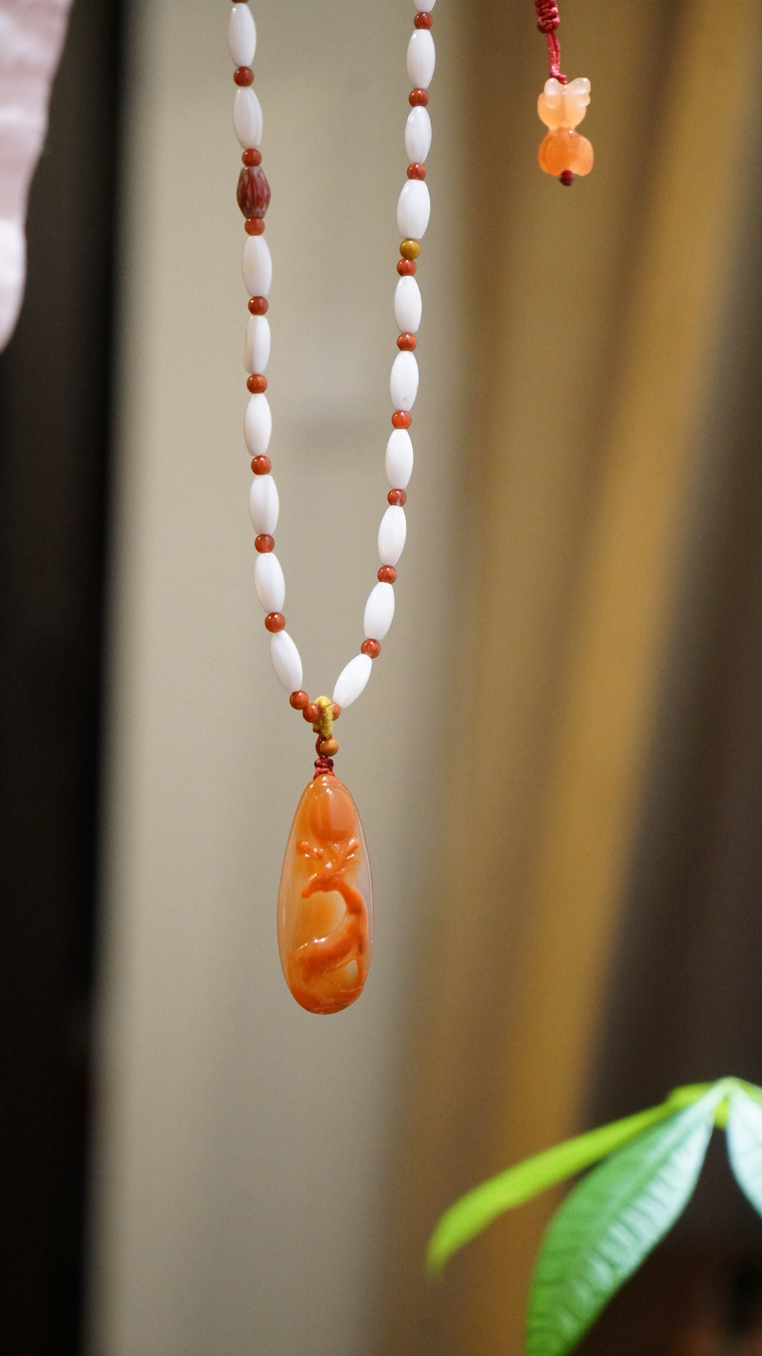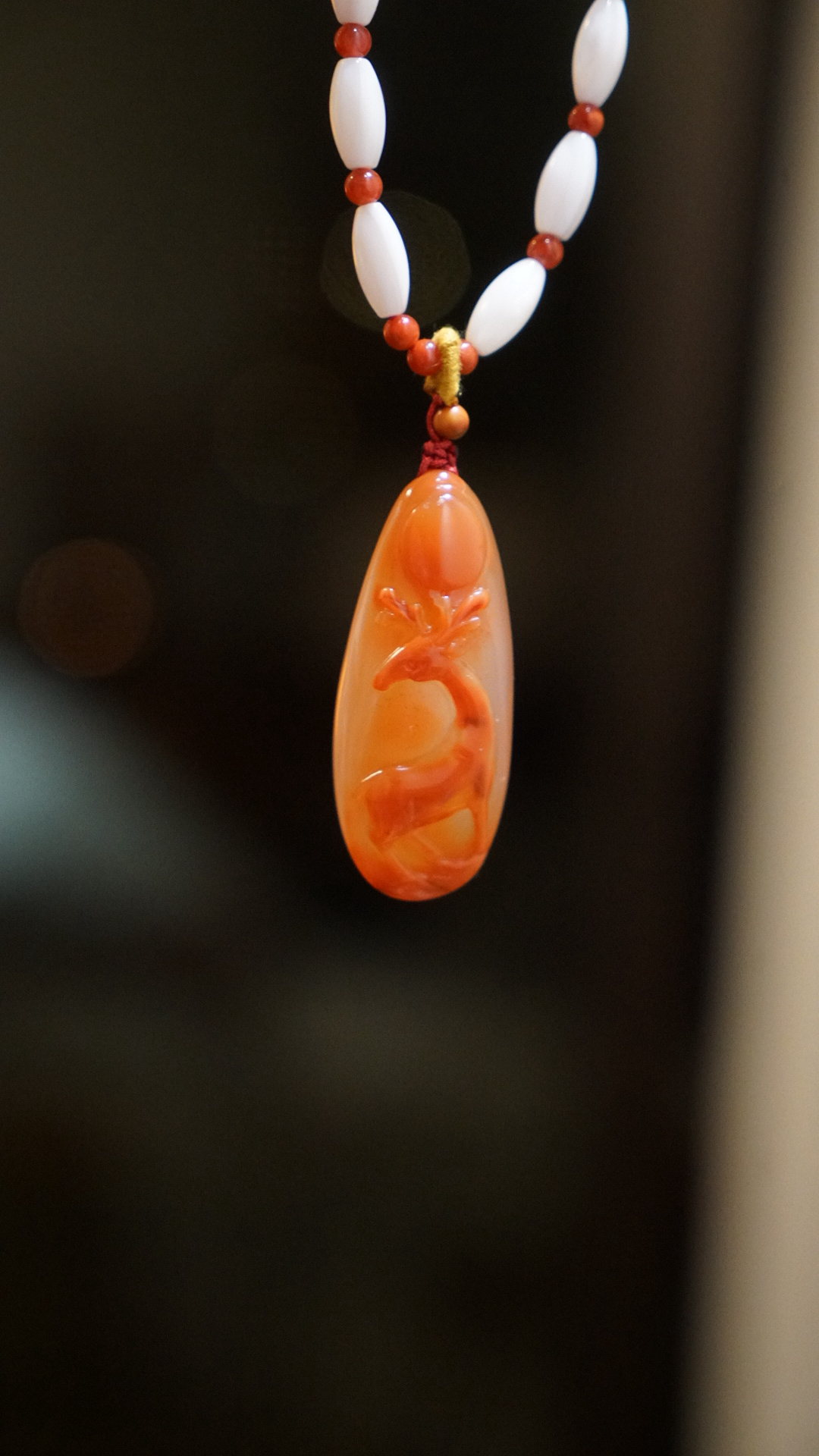 这条南红玛瑙,精品俏色雕刻,着实美貌,咱家品质更不用多说。颜色红里带着微微橘色,更活泼有生命力了~仿佛在森林里快乐的玩耍~阳光☀️普照着她们~嘿嘿~吊坠也是南红玛瑙小鹿~也许是母女或母子俩吧🥰🥰🥰