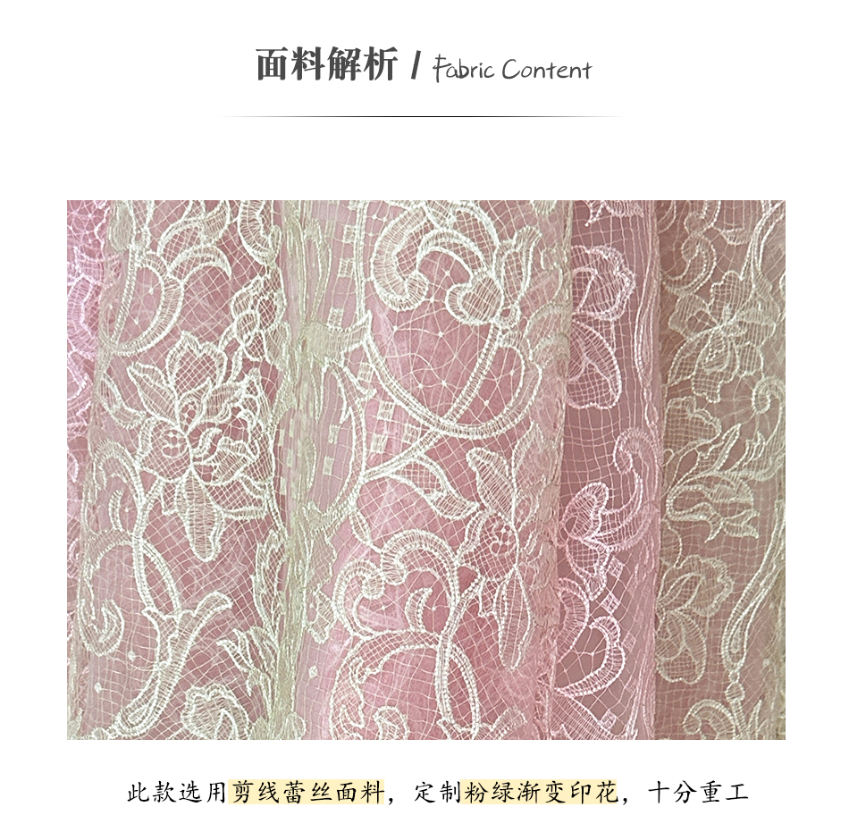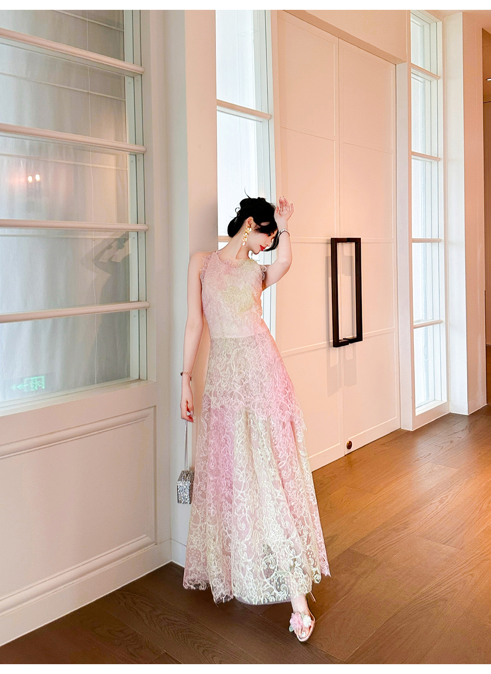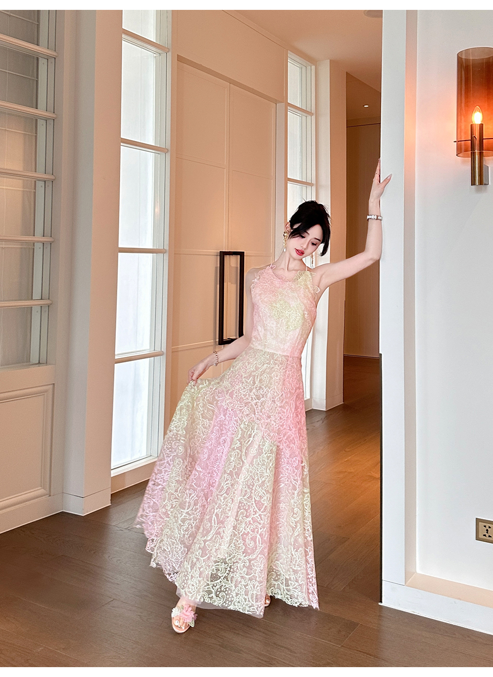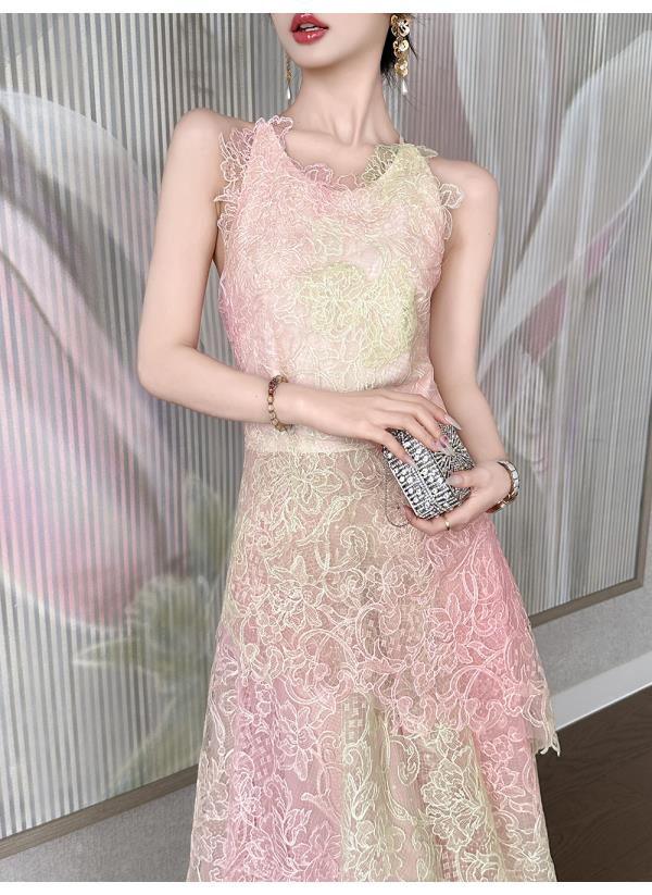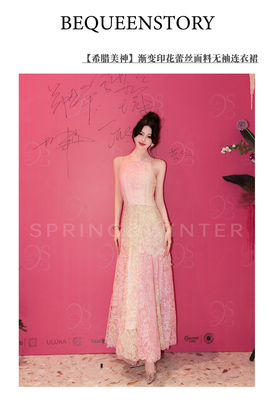 BeQueenStory【希腊美神】重工粉绿渐变印花蕾丝面料无袖连衣裙