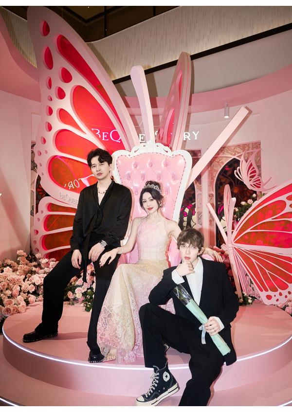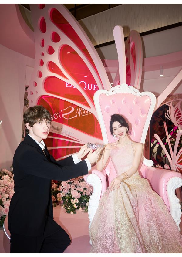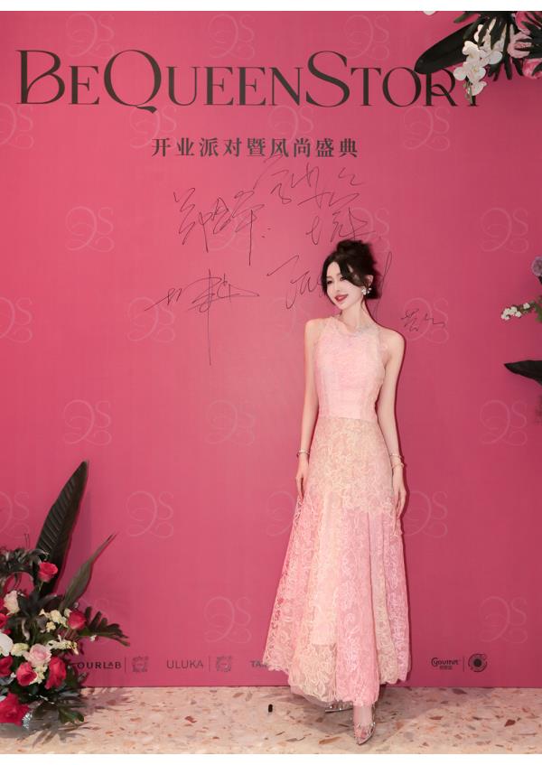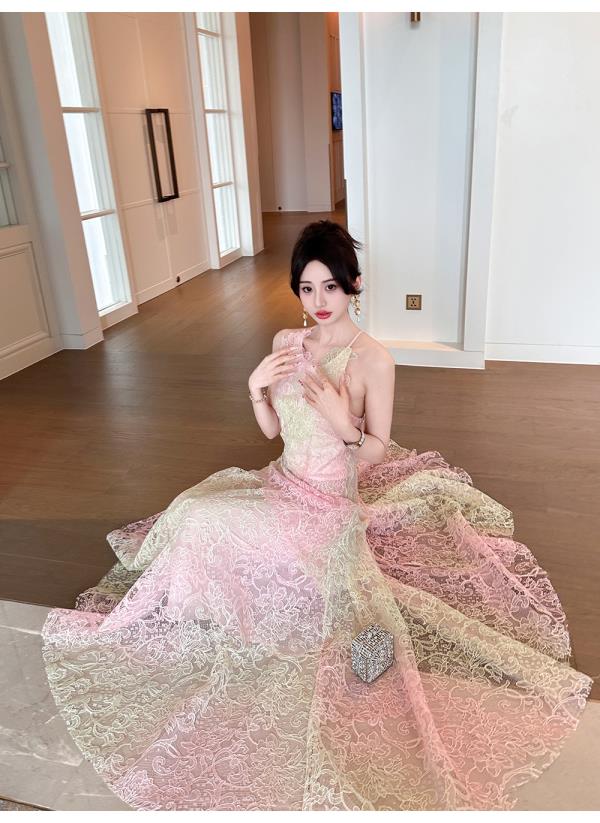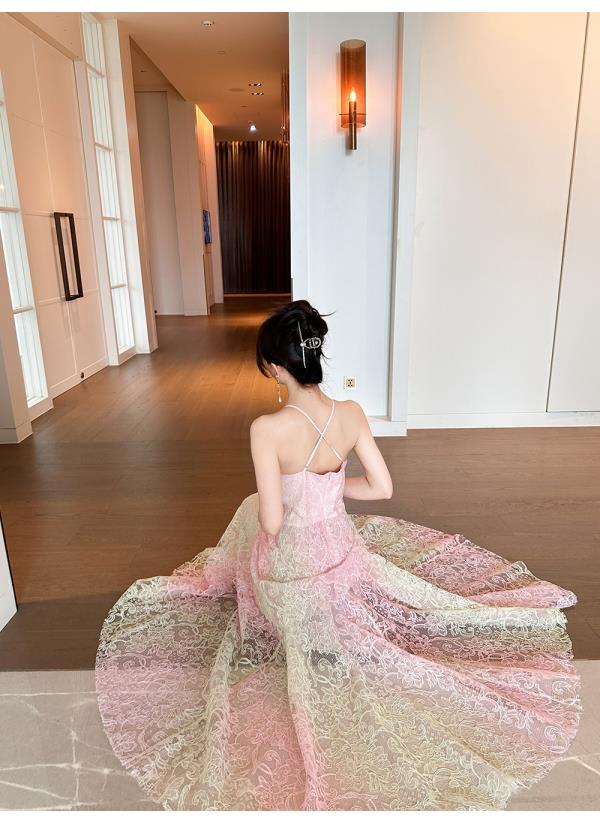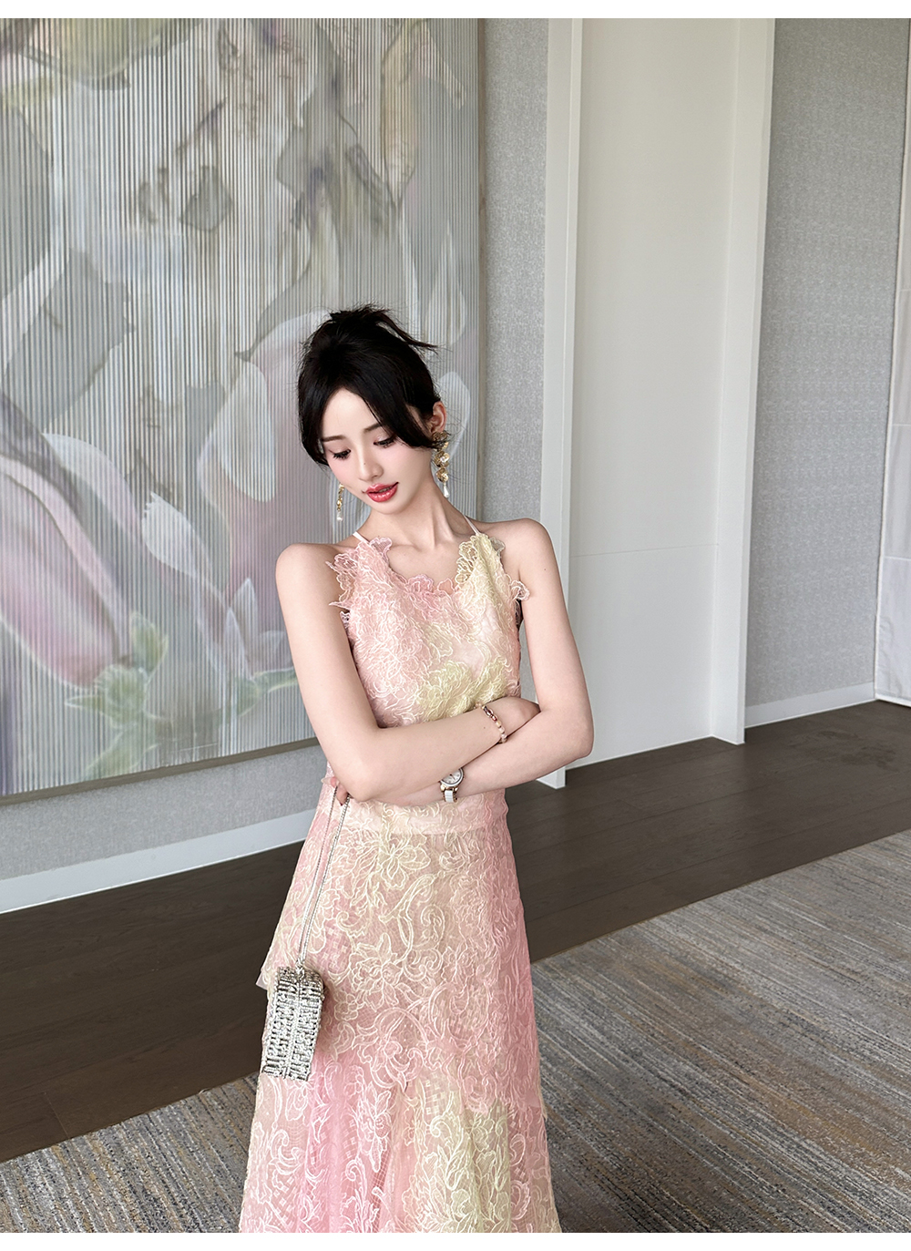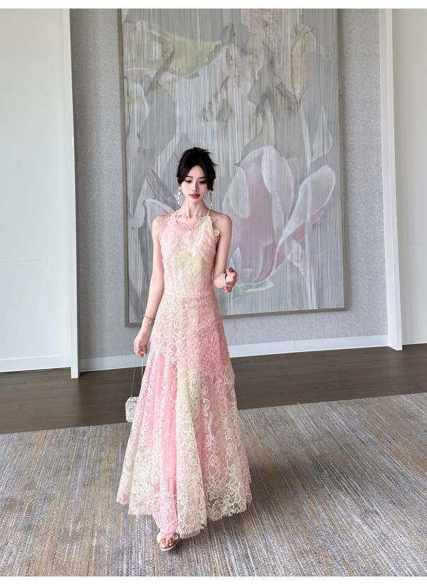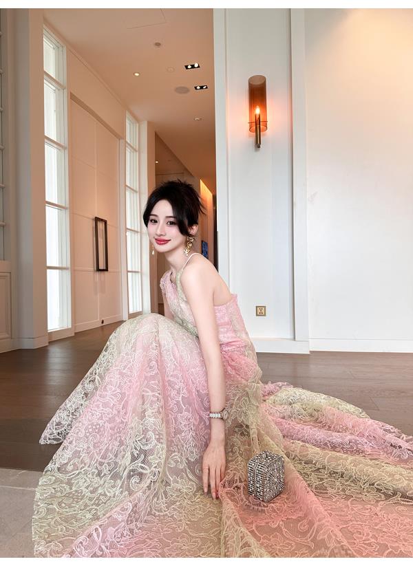 BeQueenStory【希腊美神】重工粉绿渐变印花蕾丝面料无袖连衣裙