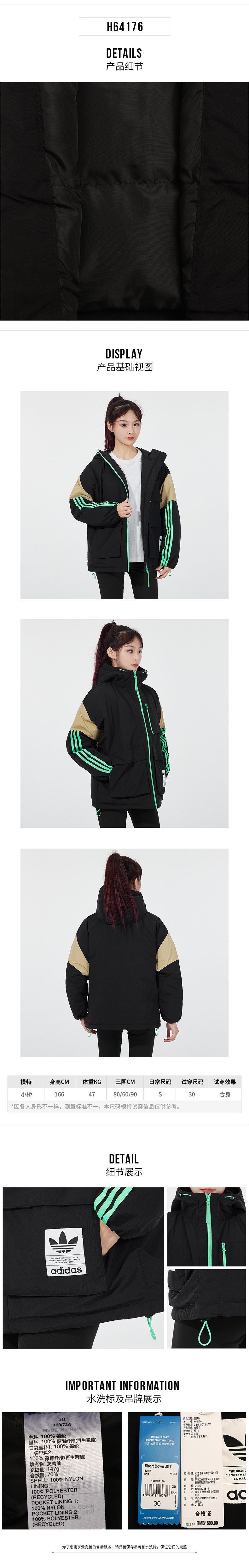 阿迪达斯三叶草女装上衣 2021冬季新款户外保暖羽绒服防风舒适连帽夹克运动服休闲外套H64176