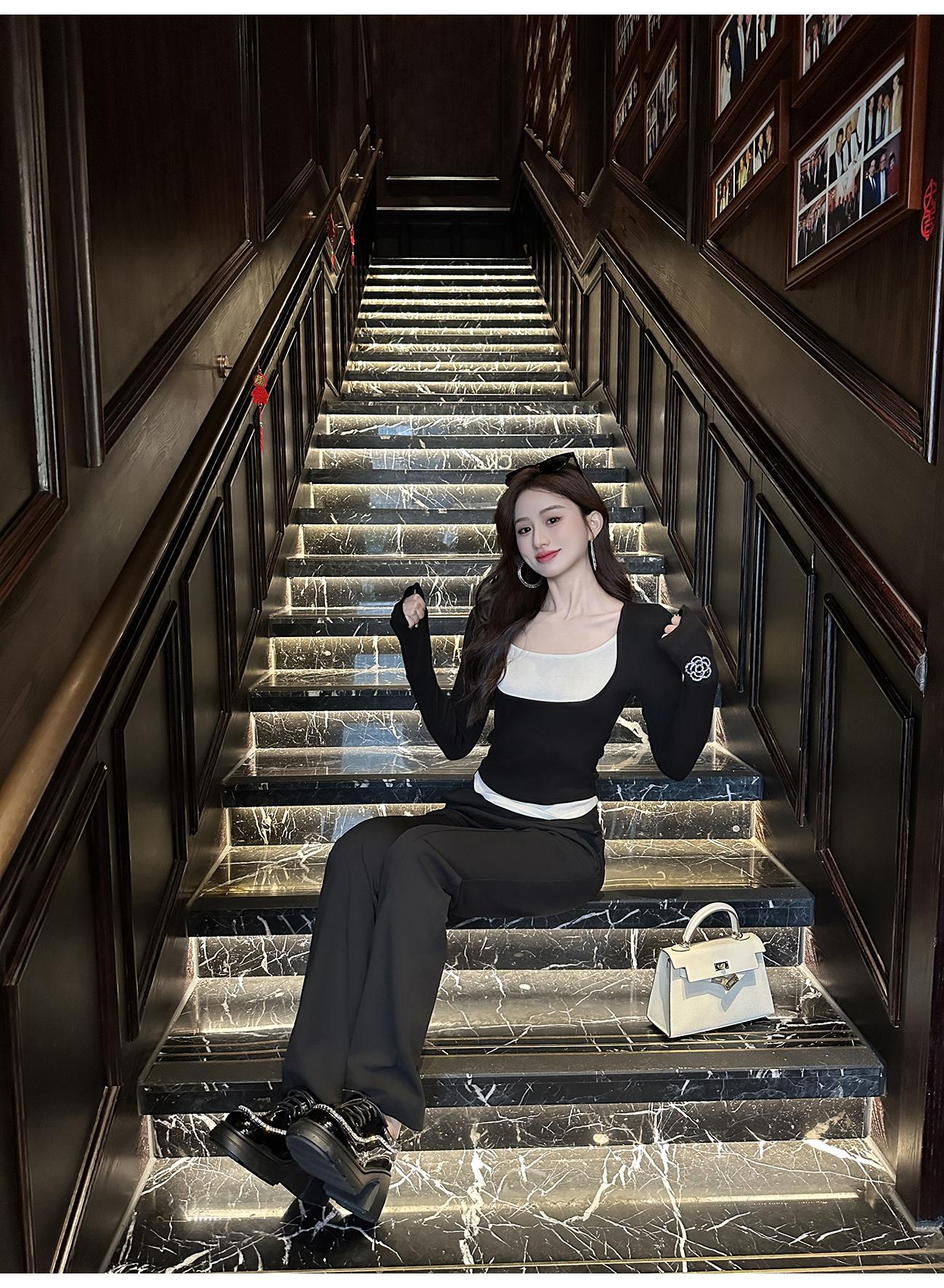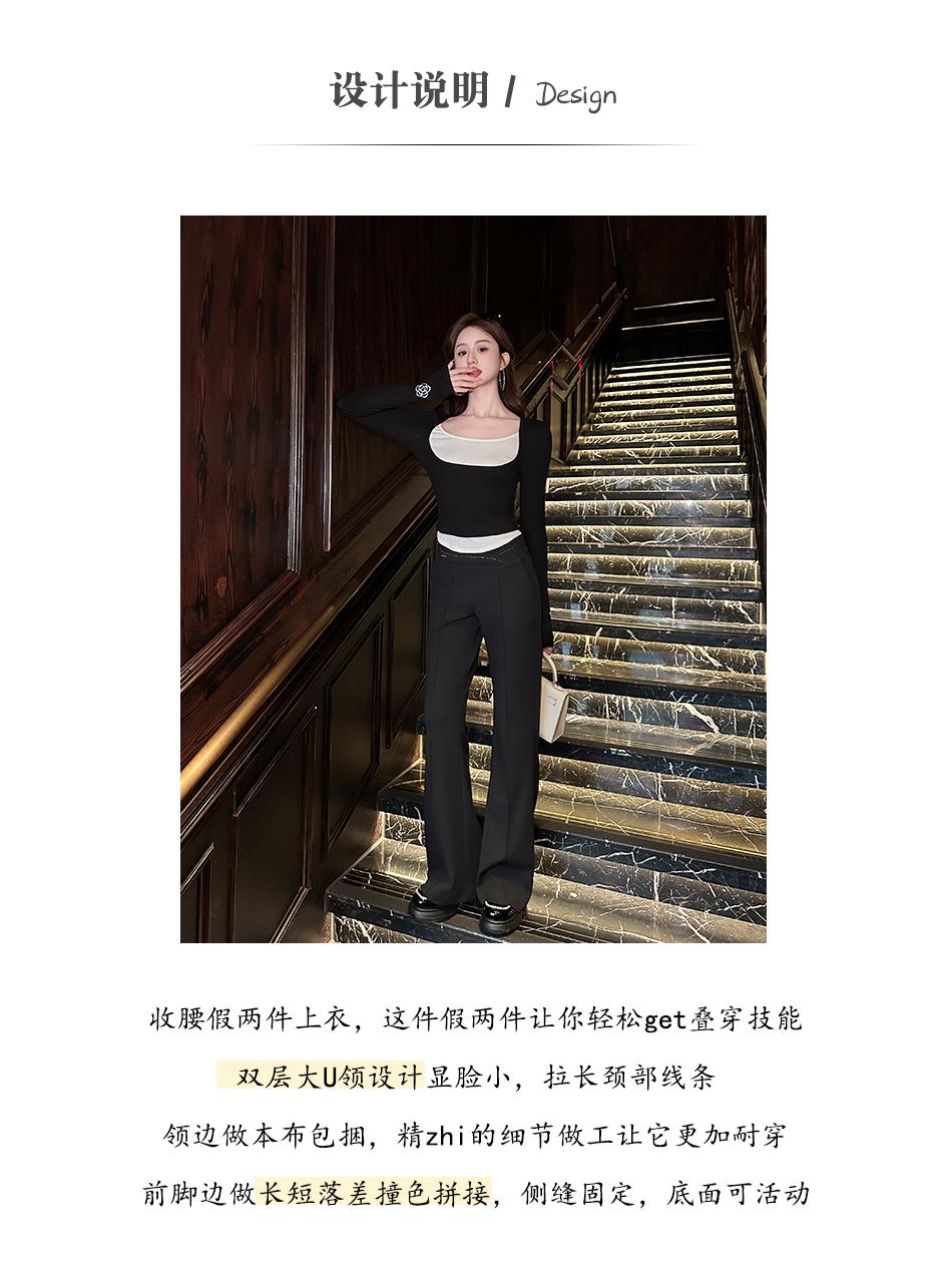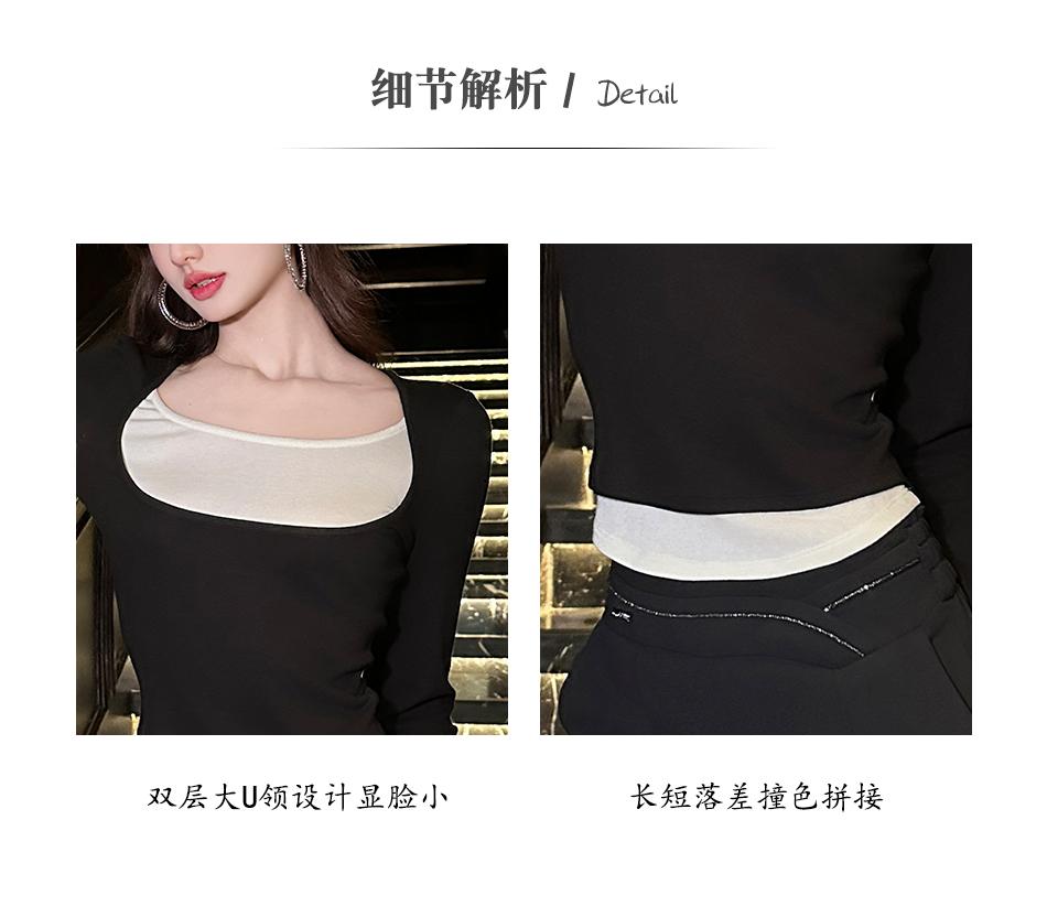 余潇潇【娇欲芭比】精致烫钻时尚百搭撞色拼接收腰假两件上衣