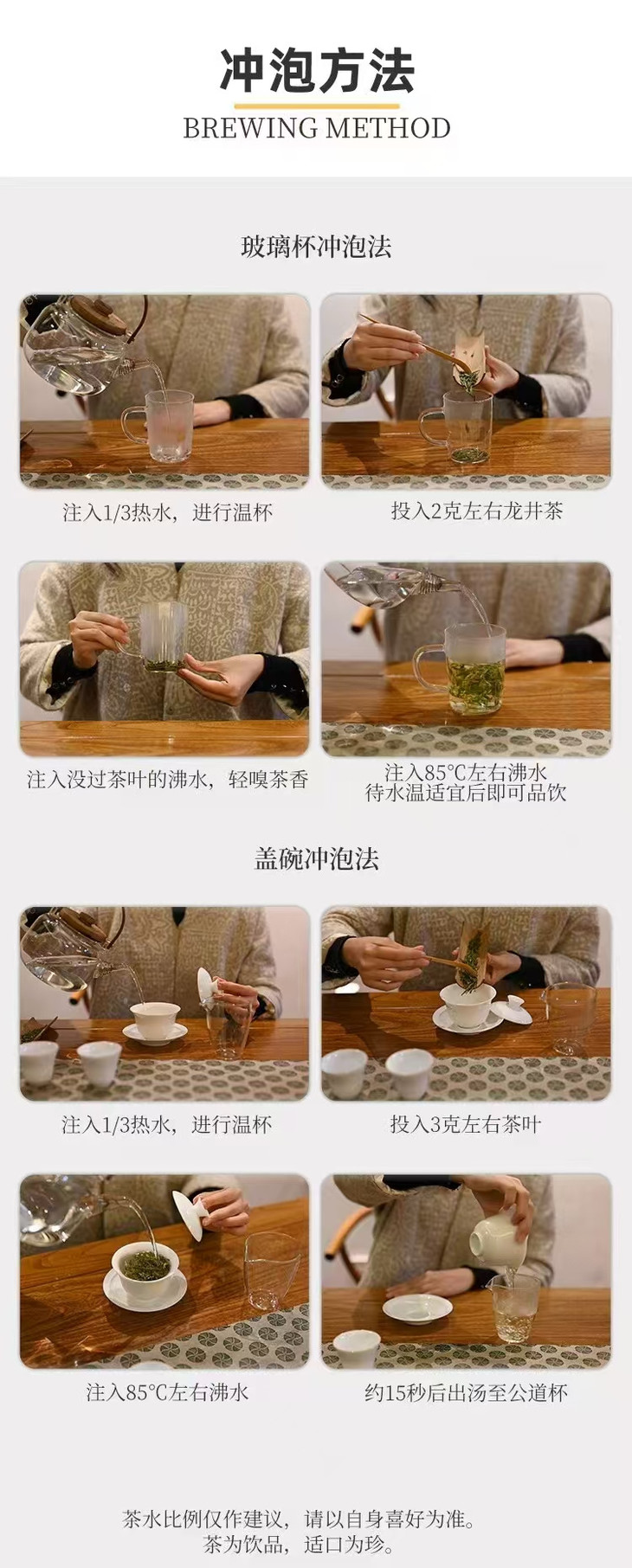 关于冲泡 观其干茶外形,扁平光滑挺直,色泽嫩绿光润。 在器皿中注入85℃-90℃的水,茶香气馥郁如兰,品其滋味细腻鲜活。过喉之后口中嫩栗香、豆香弥久不散,回味甘冽温柔,这正是龙井独到的魅力。