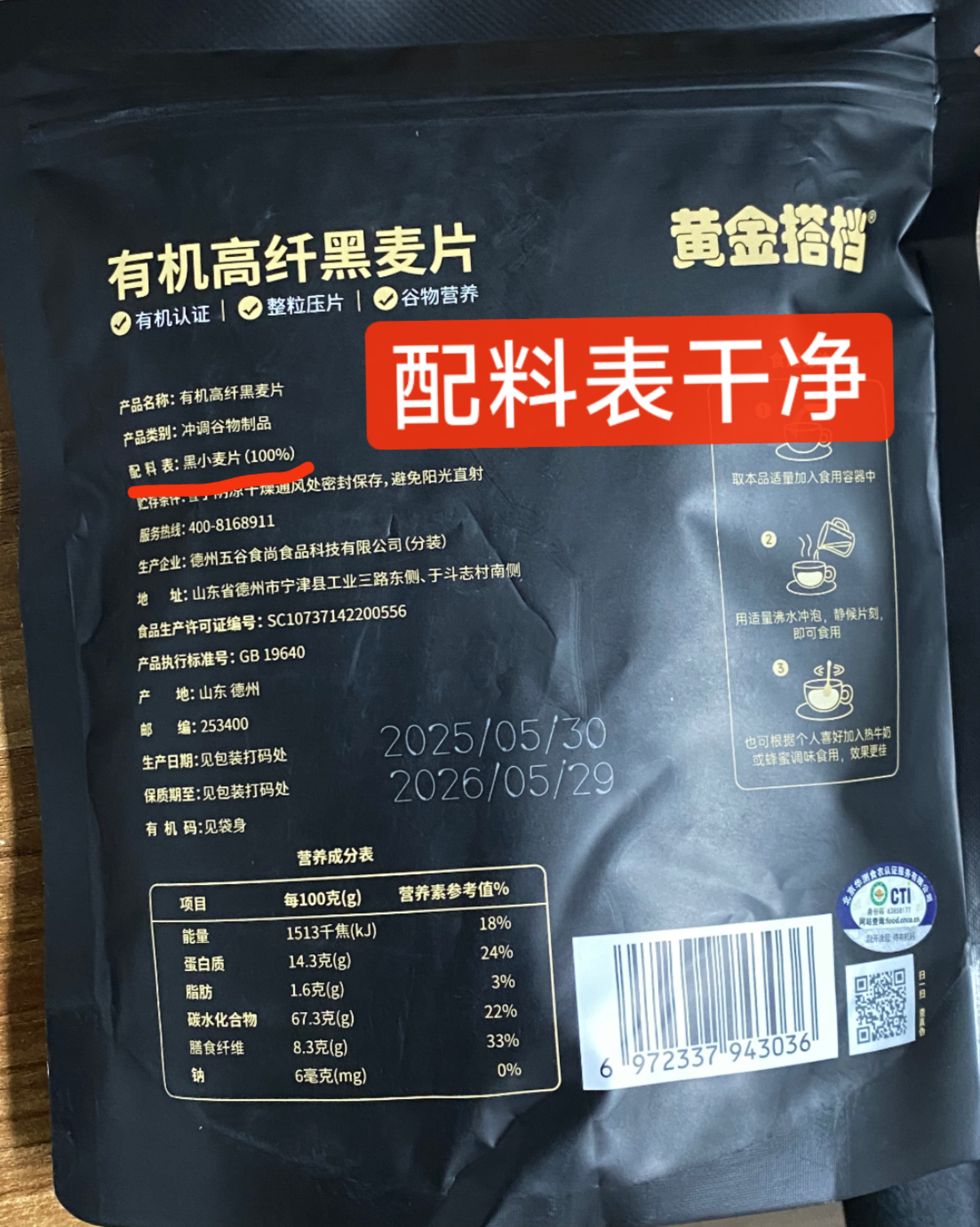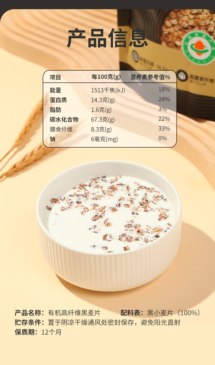 【5袋】黄金搭档有机高纤黑麦片300g 效期至26年5月 减脂期代餐 满满饱腹感
