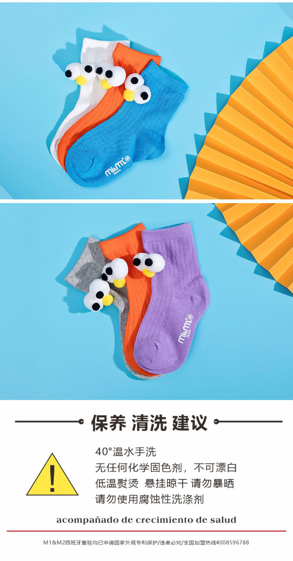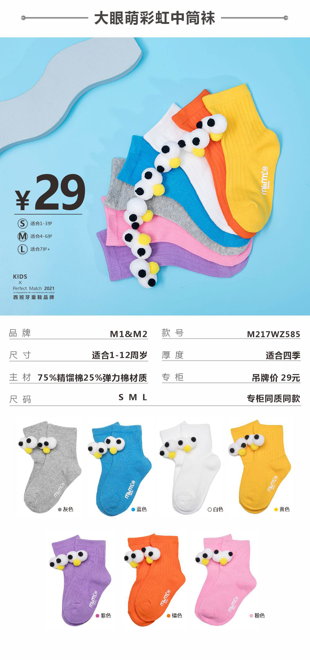 M1&M2西班牙品牌棉制中筒袜吸汗透气可爱通用室内袜鞋宝宝秋季