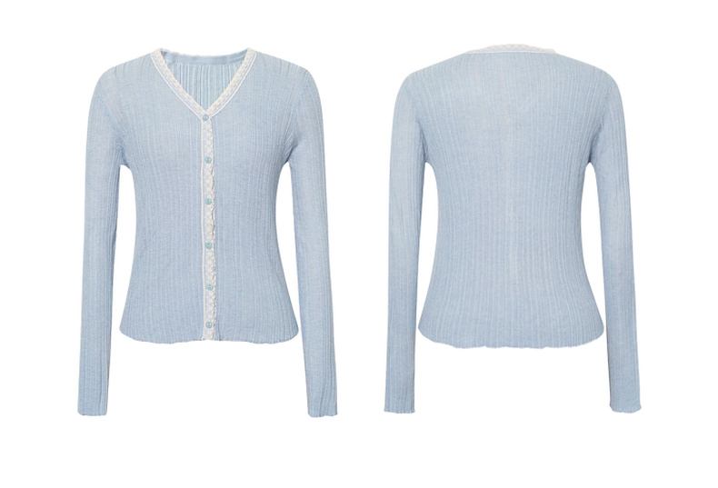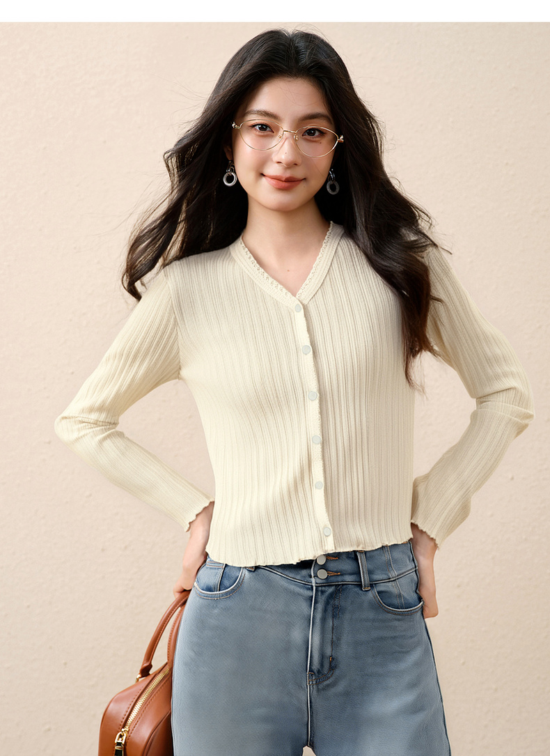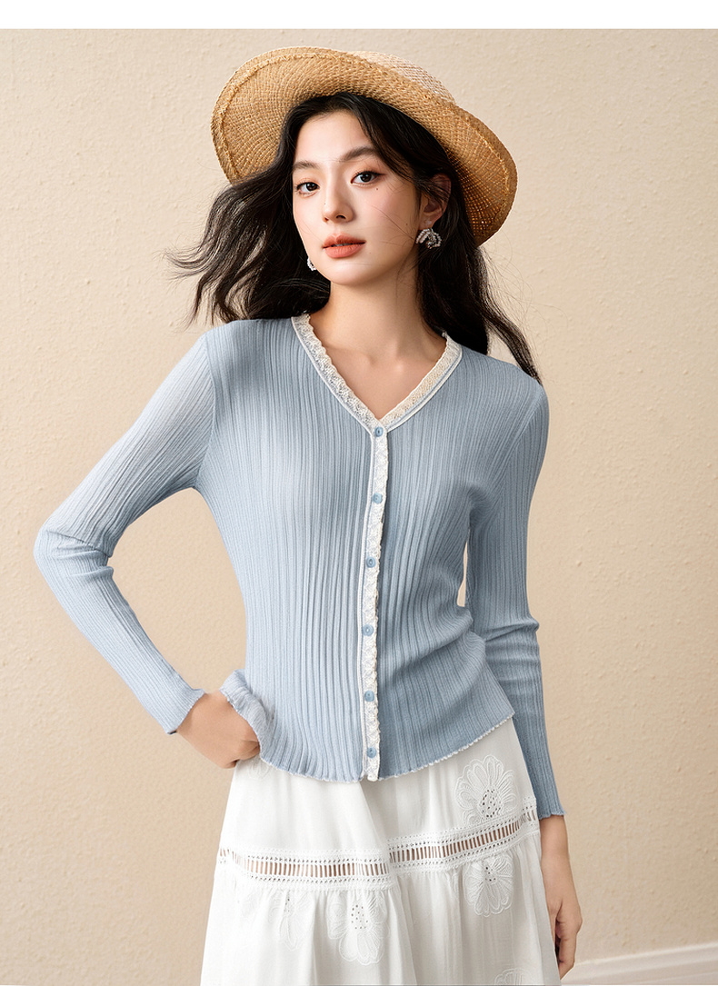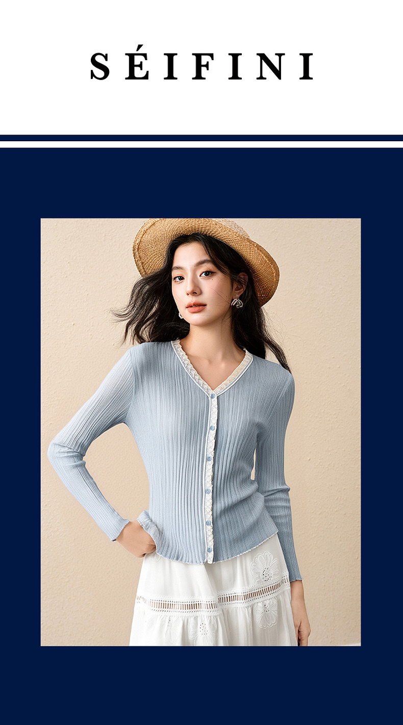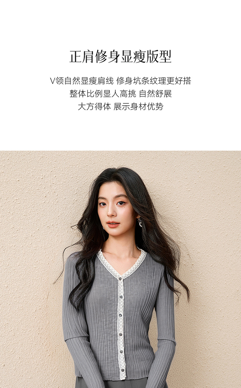 【严选】诗凡黎蕾丝拼接V领长袖针织开衫2025秋新款气质时尚显瘦外搭毛衣7G8132001