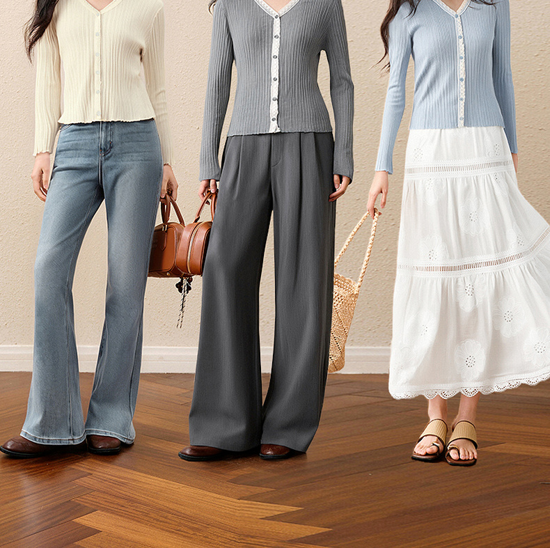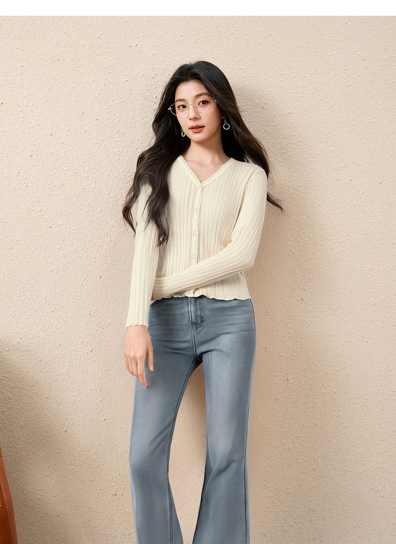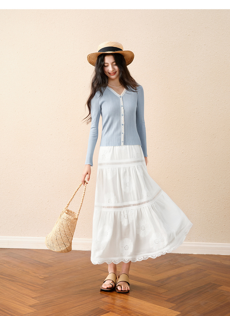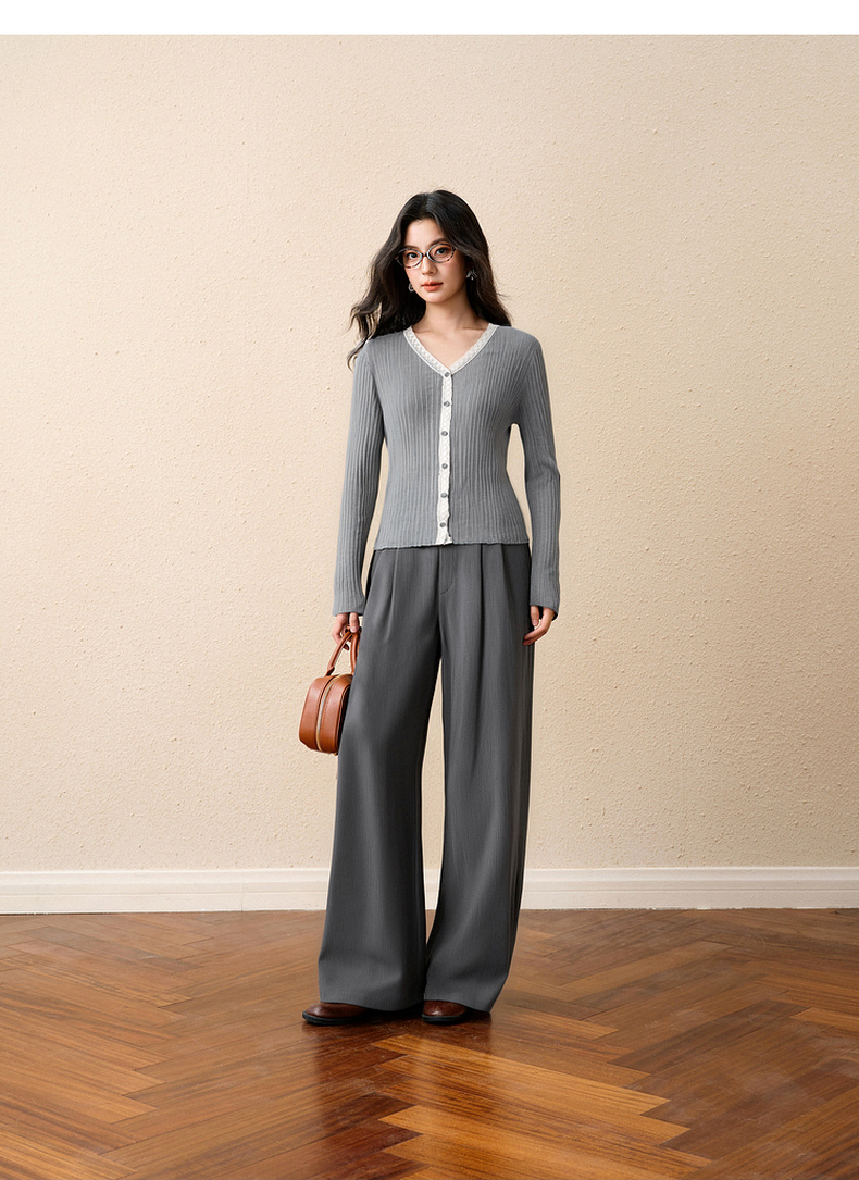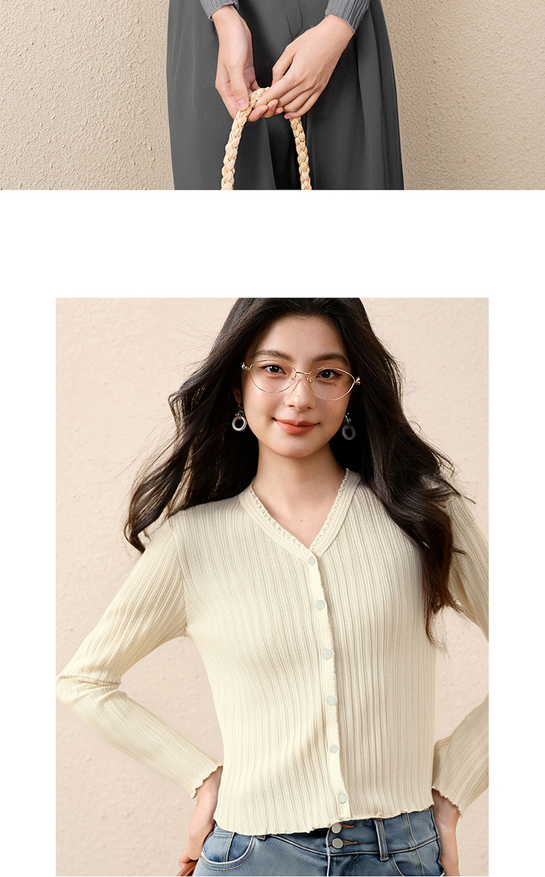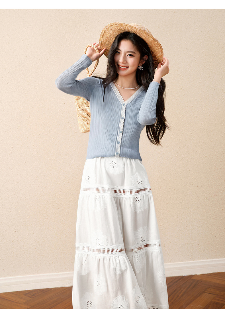 【严选】诗凡黎蕾丝拼接V领长袖针织开衫2025秋新款气质时尚显瘦外搭毛衣7G8132001
