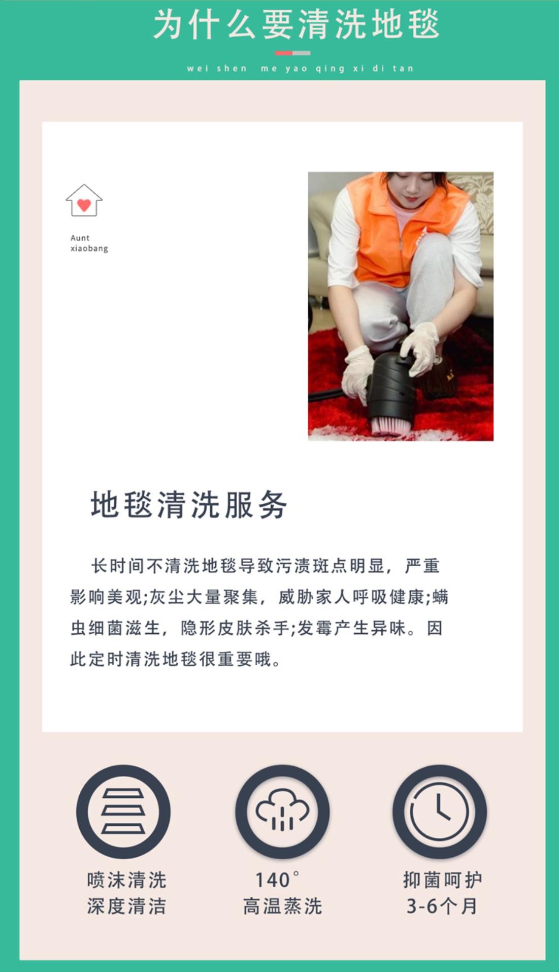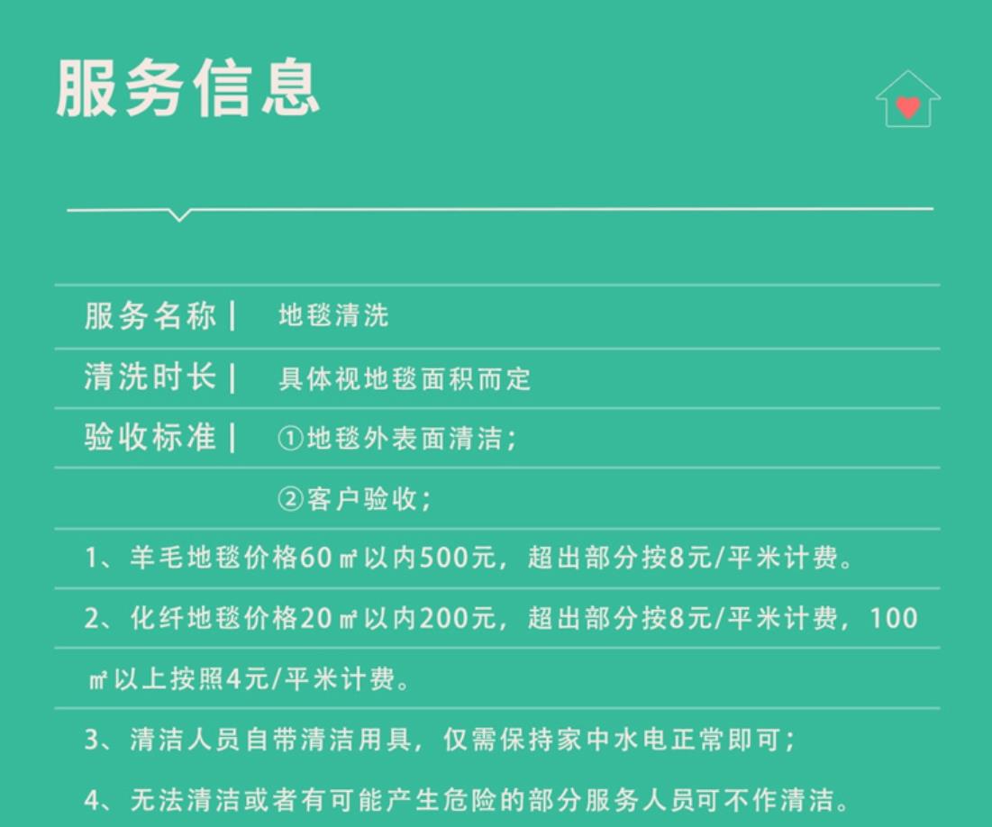 1.地毯清洗服务,上门服务时间为8:00-12:00,14:00-18:00,超出时间暂无法提供服务,请根据家庭情况预约合适人员上门!如遇服务旺季,请提前预约,以免耽误您的排程;