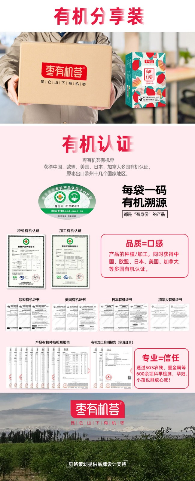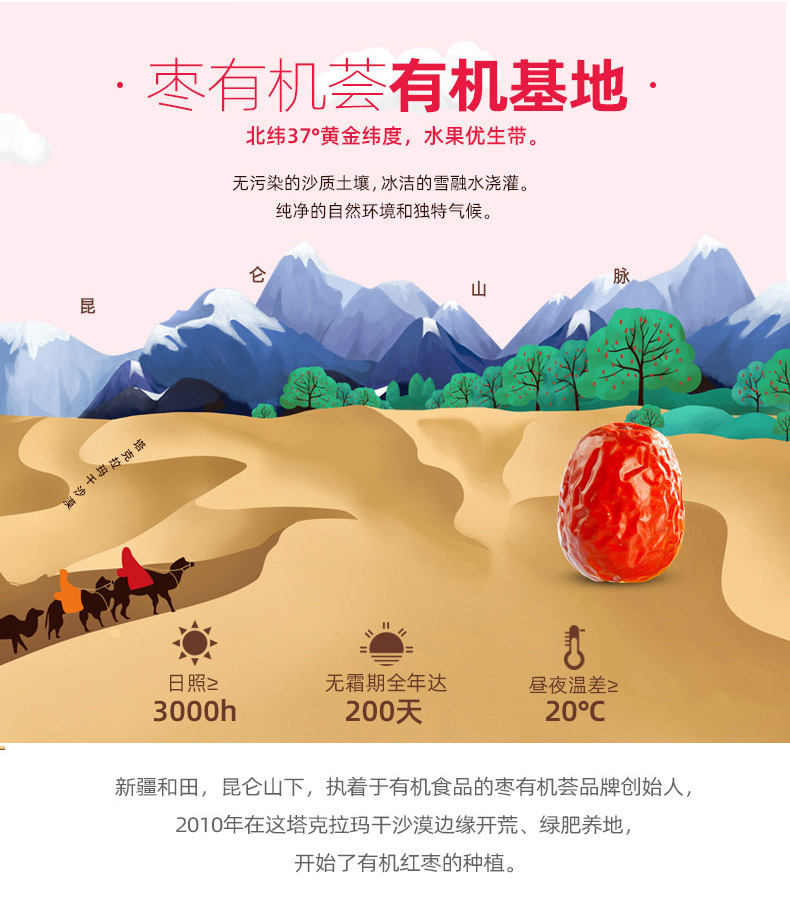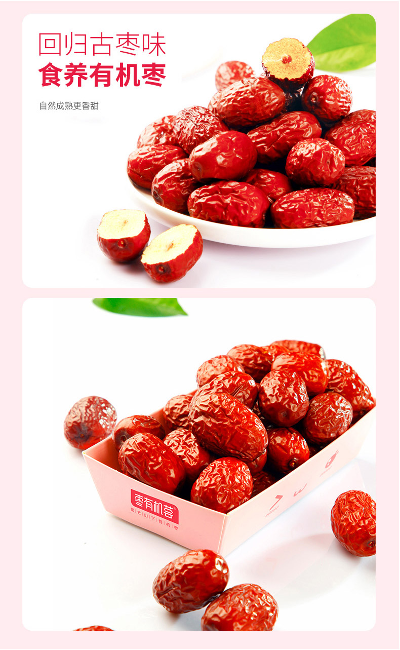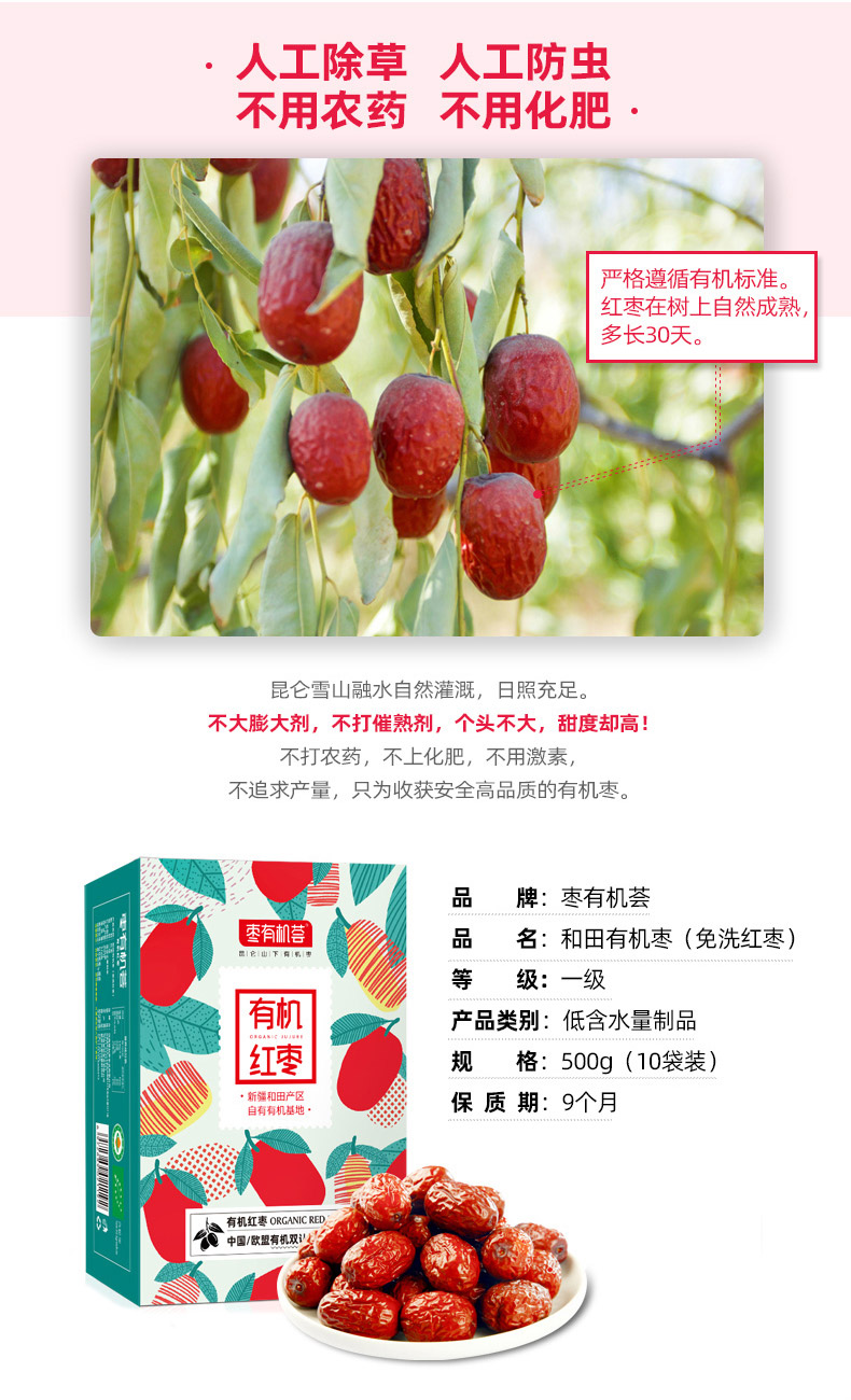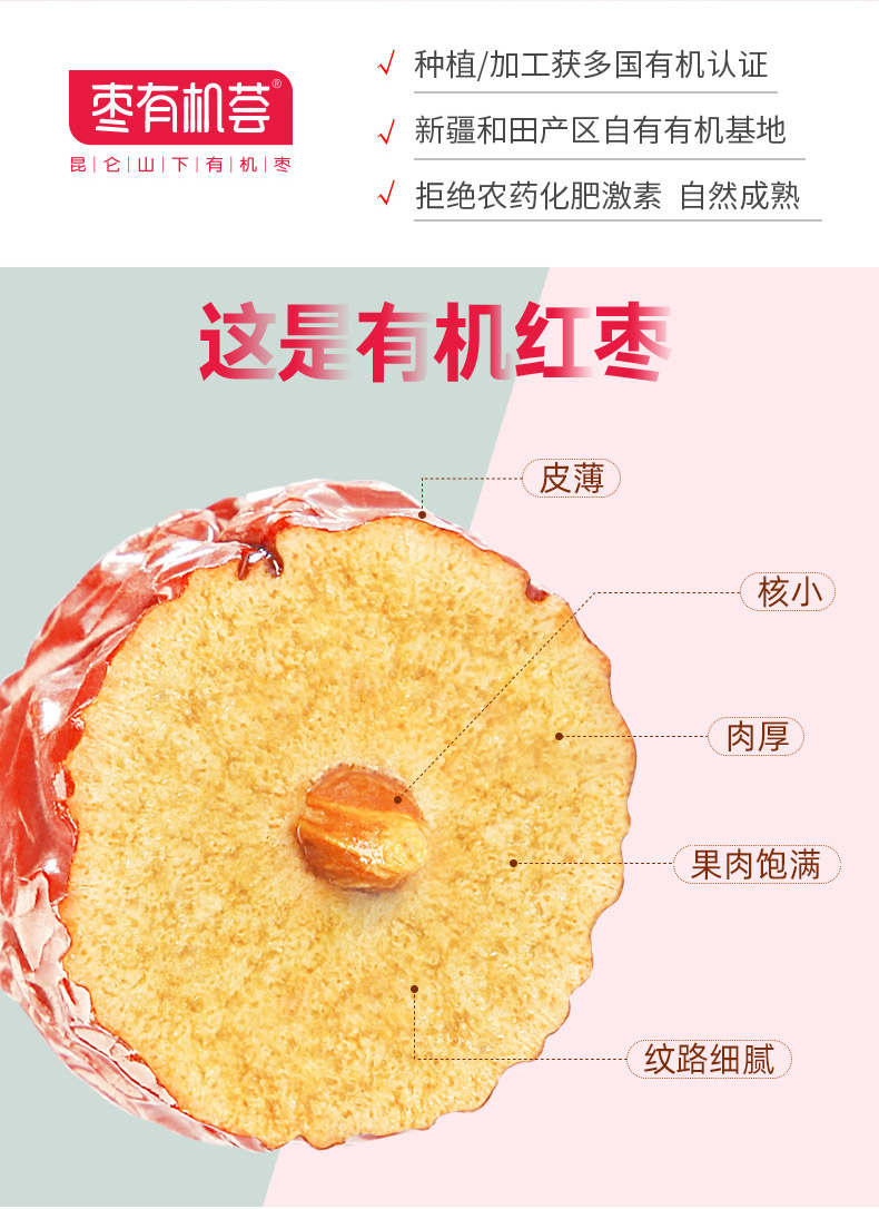 【臻如意有机红枣 500g/盒】种植/加工获多国有机认证,新疆和田产区自有有机基地,拒绝农药化肥激素自然成熟。