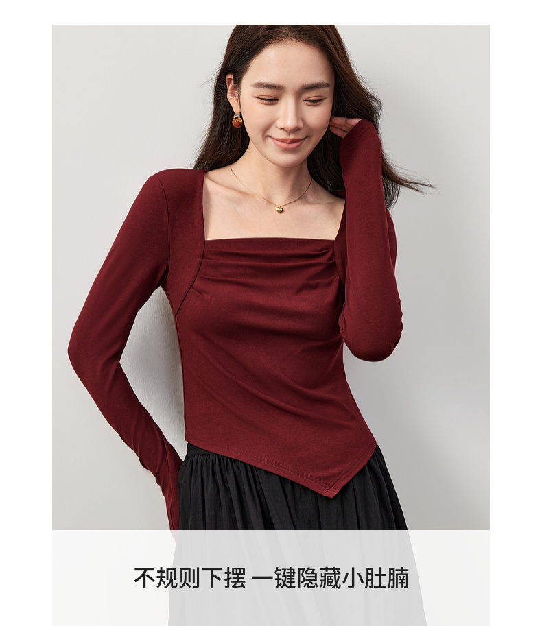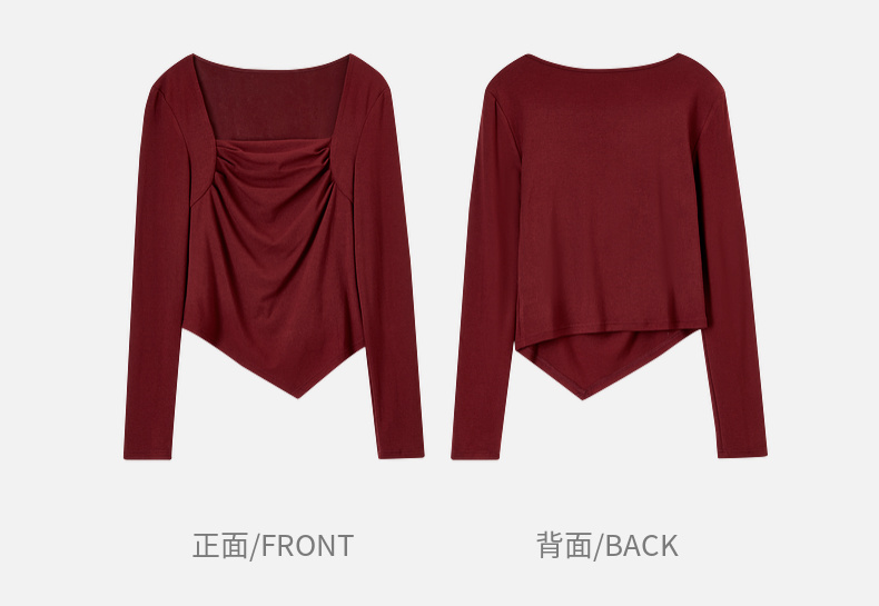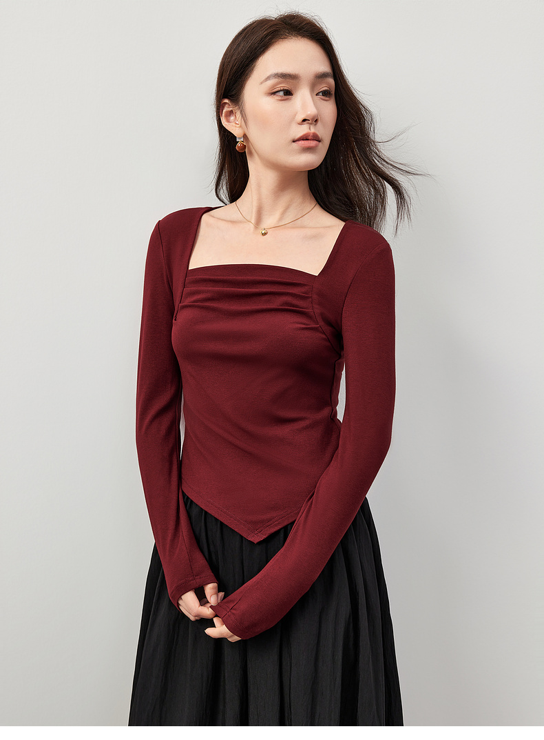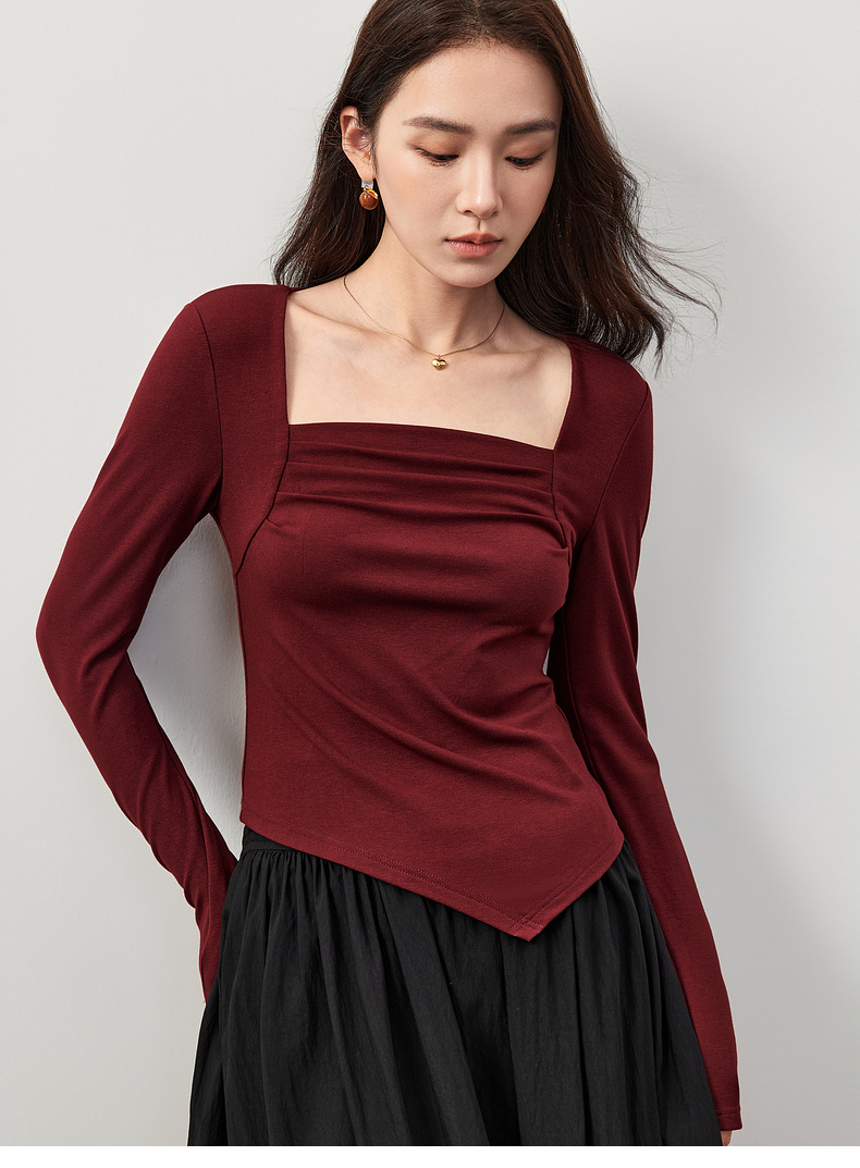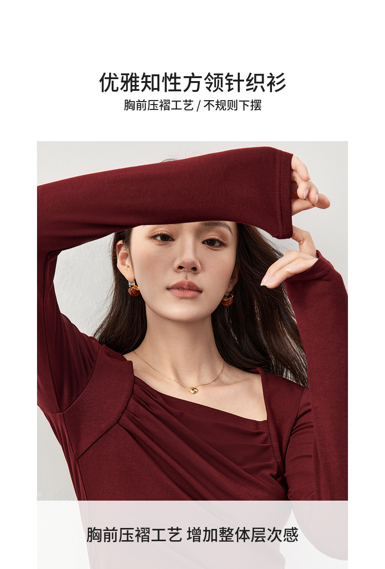 【内购】优雅知性安可拉红设计感方领压褶不规则下摆修身超弹针织衫-151T58623
