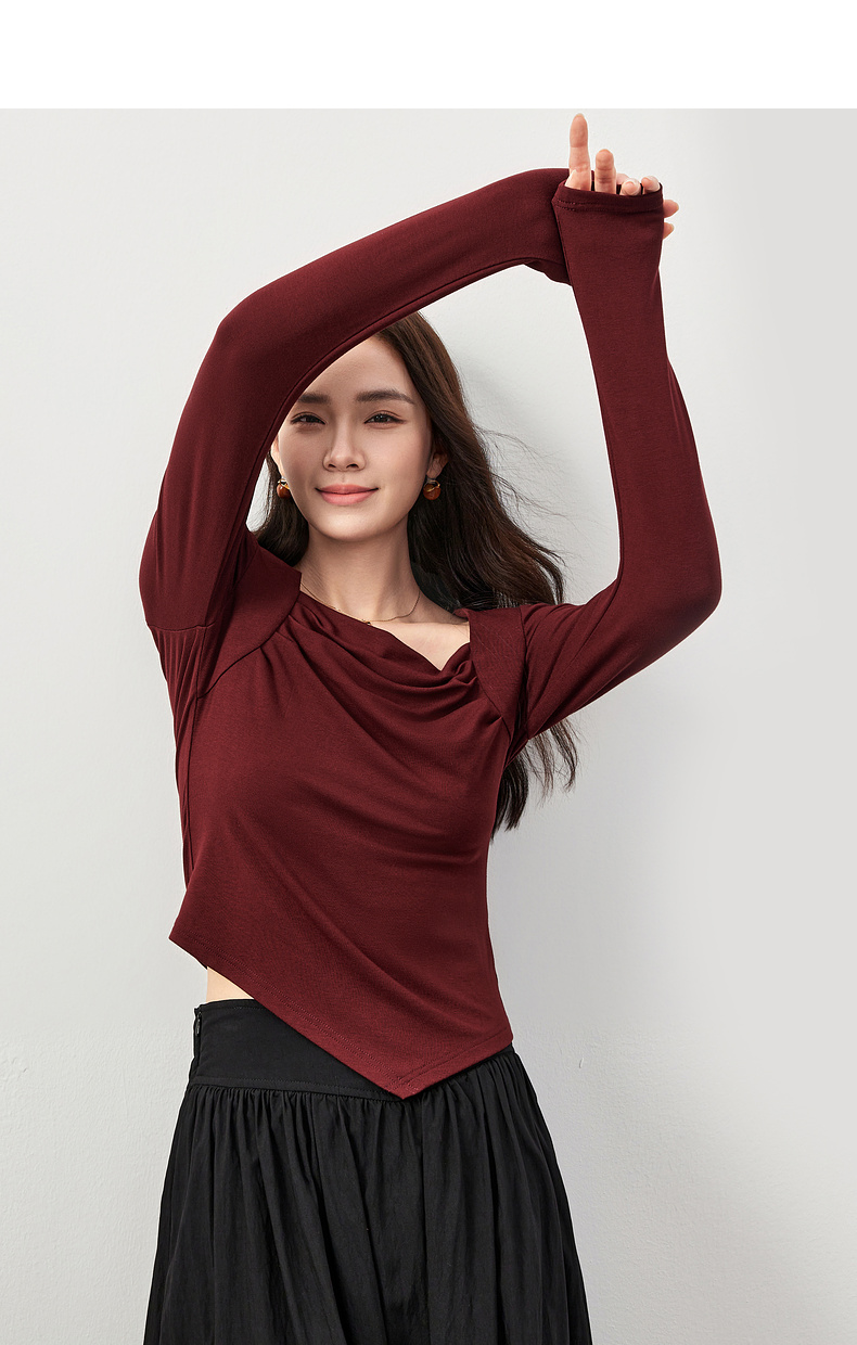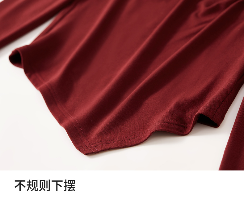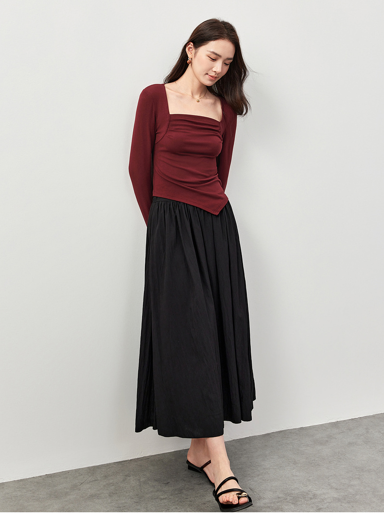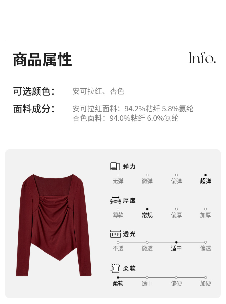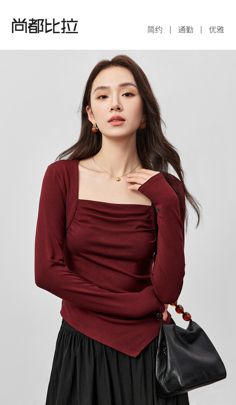 【内购】优雅知性安可拉红设计感方领压褶不规则下摆修身超弹针织衫-151T58623