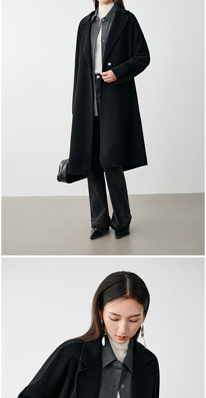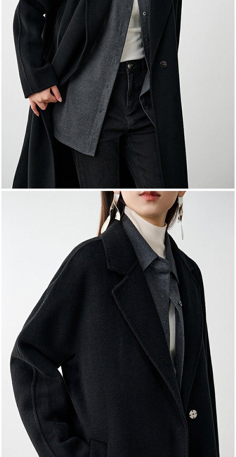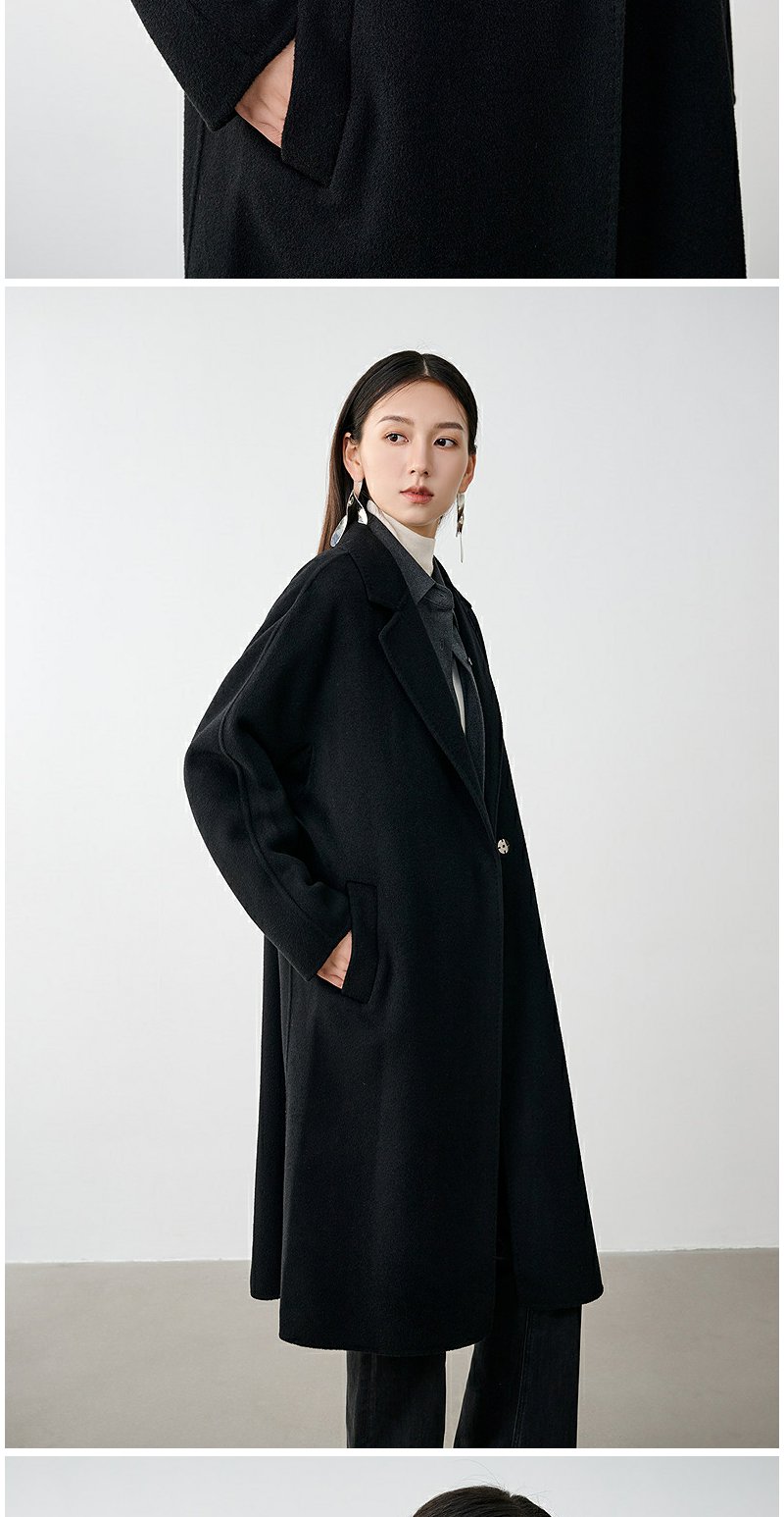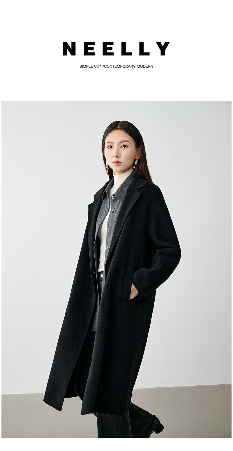 NEELLY纳俪商场同款冬季新款廓形绵羊毛双面毛呢大衣黑色外套女N24104N07774