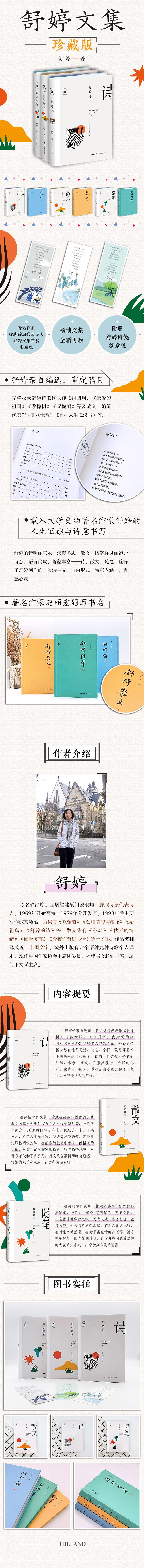 1.朦胧诗代表诗人舒婷散文自选集;2.精装典藏版;著名作家赵丽宏专门为本套书题写书名;3.完整收录舒婷散文代表作《真水无香》《自在人生浅淡写》等;4.附赠舒婷诗笺签章版;“舒婷文集·珍藏版”,包含诗歌、散文、随笔,全面呈现舒婷的文学创作,读者能够从中读懂作家舒婷为文学、为人生的各个方面