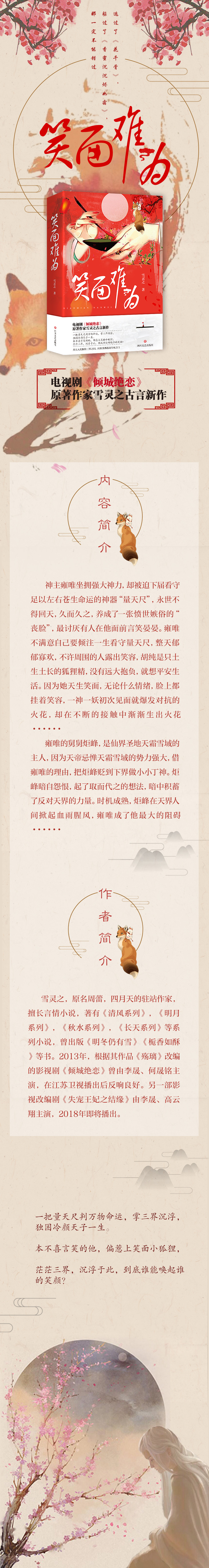 女主胡纯是只土生土长的狐狸精,没有远大抱负,就想平安生活。因为她天生笑面,无论什么情绪,脸上都挂着笑容,反而引起了雍唯的注意.......雍唯的舅舅炬峰,是仙界圣地天霜雪域的主人,因为天帝忌惮天霜雪域的势力强大,借雍唯的理由,把炬峰贬到下界做小小丁神。炬峰暗自怨恨,起了取而代之的想法,暗中积蓄了反对天界的力量。时机成熟,炬峰在天界人间掀起血雨腥风,雍唯成了他*的阻碍。以雍唯自己的力量,已经不能阻止炬峰改天换地,所以雍唯干脆毁坏了自己看守的量天尺,让天道混乱,炬峰的种种筹划都失去控制。在天帝的带领下,天界渐渐控制住局面。恢复平静之后,雍唯因为功过参半,被罚在珈冥山底修复量天尺,不得与任何人联系。胡纯经历种种险恶和人心诡变,已经失去了笑脸。她对雍*心一意,带着他们的孩子在珈冥山等了雍唯五十年。雍唯终于修好量天尺出山,胡纯看见他再次展现了笑容。