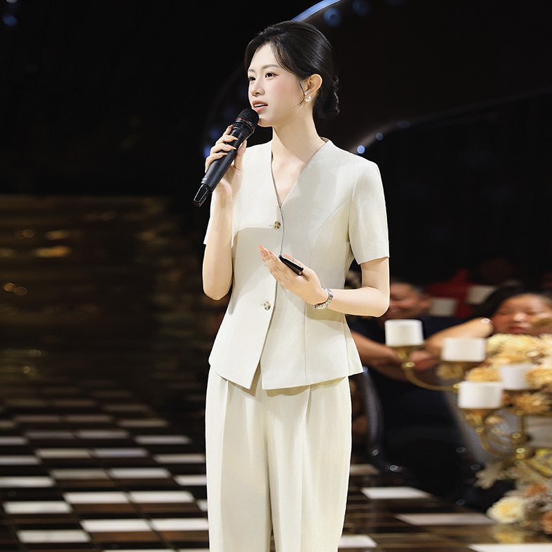 法小曼*子珍专款/杏色套装气质主持人工作服V领短袖两件套