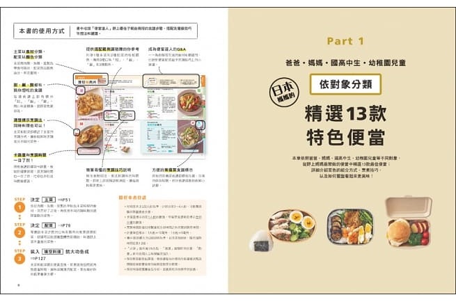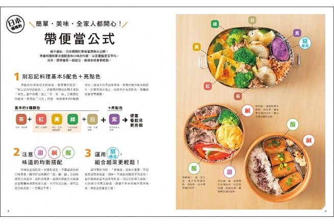 媽媽們在準備便當時,最常卡關的問題就是想菜單,不過別怕!除了主菜的茶色和主食的白色外,再依照本書的顏色分類找出「紅、黃、綠」三色配菜,馬上就能決定好菜色。顏色配好後也別忘了美味,如果選擇了鹹香誘人的主菜,當然就要來點清爽微酸和甘甜口感的配菜,這樣的味道層次能讓味蕾更享受。最後挑選不同烹調法的料理,就能讓好幾道菜同時進行!
