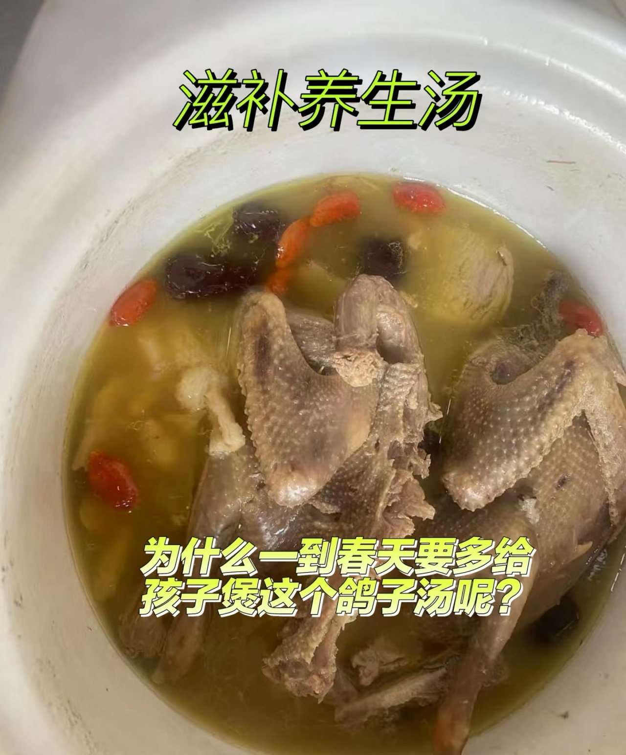 鸽子肉富含蛋白质,维生素A,B族维生素,钙,铁,铜等营养成分,春天孩子生长发育较快,喝鸽子汤能提供充足营养支持,另外春天天气多变,孩子易受病菌侵袭,喝鸽子汤有助于增强免疫力,提高抗病能力!同时春天孩子可能因环境变化等影响睡眠,鸽子汤中的营养物质能调节神经系统功能,帮助孩子放松身心,改善睡眠质量,有利于生长激素分泌,促进生长发育!家长们,快来给家里的宝贝安排上吧