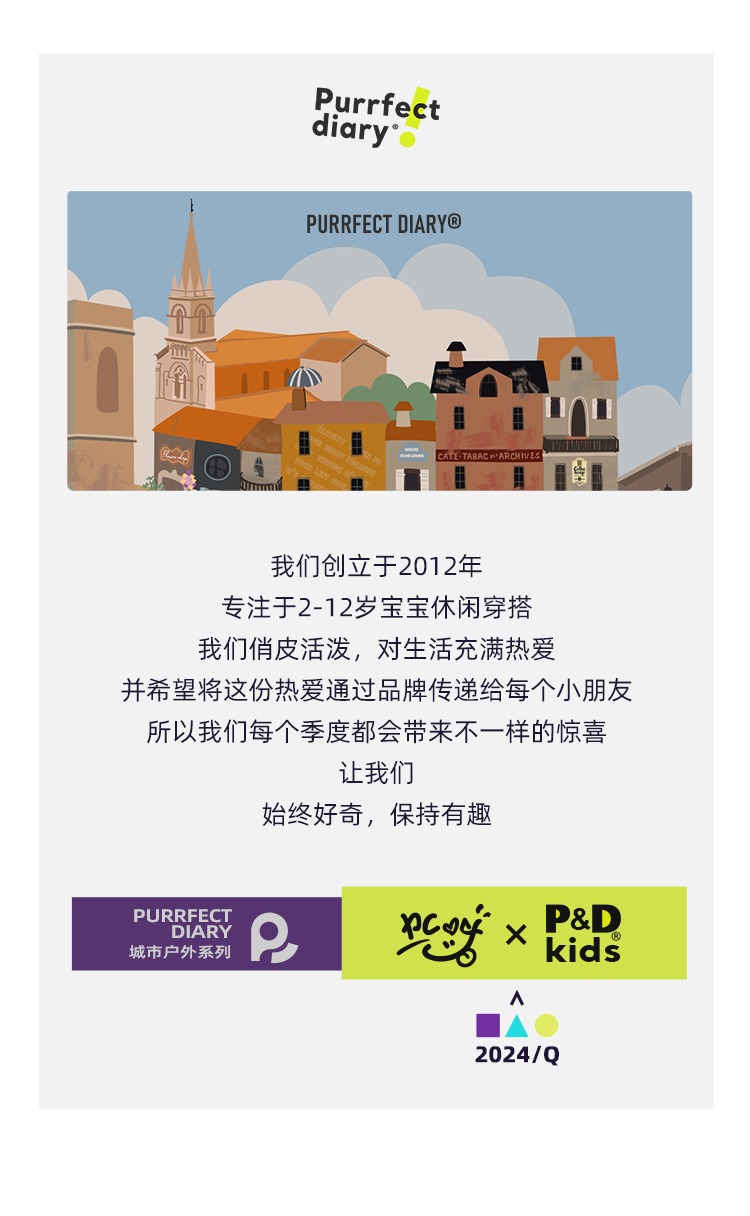 - Purrfect-Diary专注于贴近自然随性的穿着概念,轻奢平价的童装文化传播,在产品设计上更加注重婴童穿着的舒适性、安全性、更出众的国际化品牌,将欧美的育婴文化在中国进行深入的传播与推广。