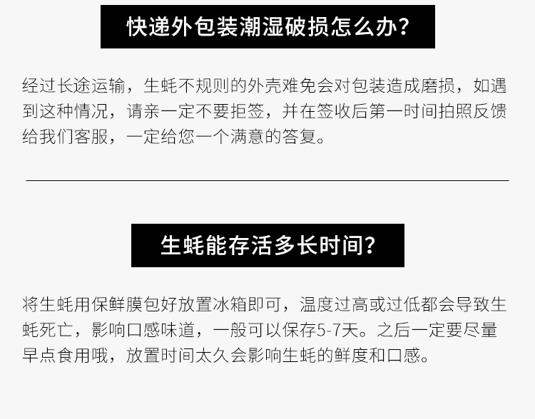 | 【品名】乳山生蚝 【规格】 拇指生蚝(1-2两)净重4斤/32-40只左右 中号(2两+)净重4.5斤/19-24只左右 大号(2.5两+)净重4.5斤/16-19只左右 特大号(3两+)净重4.5斤/12-16只左右 蚝王(4-6两)净重4.5斤/7-12只左右 【产地】乳山市 【包装方式】正宗生蚝防伪标+防水袋+加厚保温箱+冰袋+不干胶标签+豪华三件套 【送三件套】蚝刀、调料、手套 【承运快递】京东快递 【不发货区域】新疆,西藏,海南,青海不发货 【补邮费区域】甘肃,黑龙江,云南+3元/单9:【存储方式】冰箱选择3-4℃℃的恒温,尽早食用,时间越久越不新鲜! 【发货时间】72小时内发货由于产品现捞现发的特殊性,受天气影响,若海上大风船只不能出海,发货可能会有延迟,发货延迟我们会及时通知! |