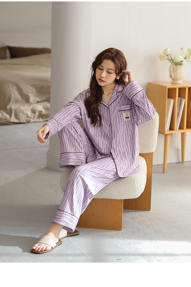 可人儿春秋季带胸垫奥力棉女士长袖长裤睡衣可外出纯棉家居服套装
