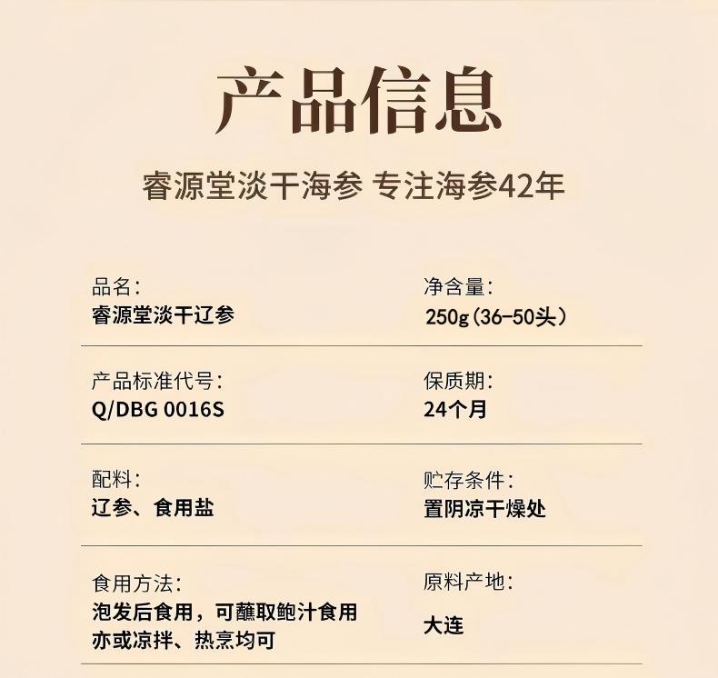 睿源堂大连淡干海参250g(36-50头)