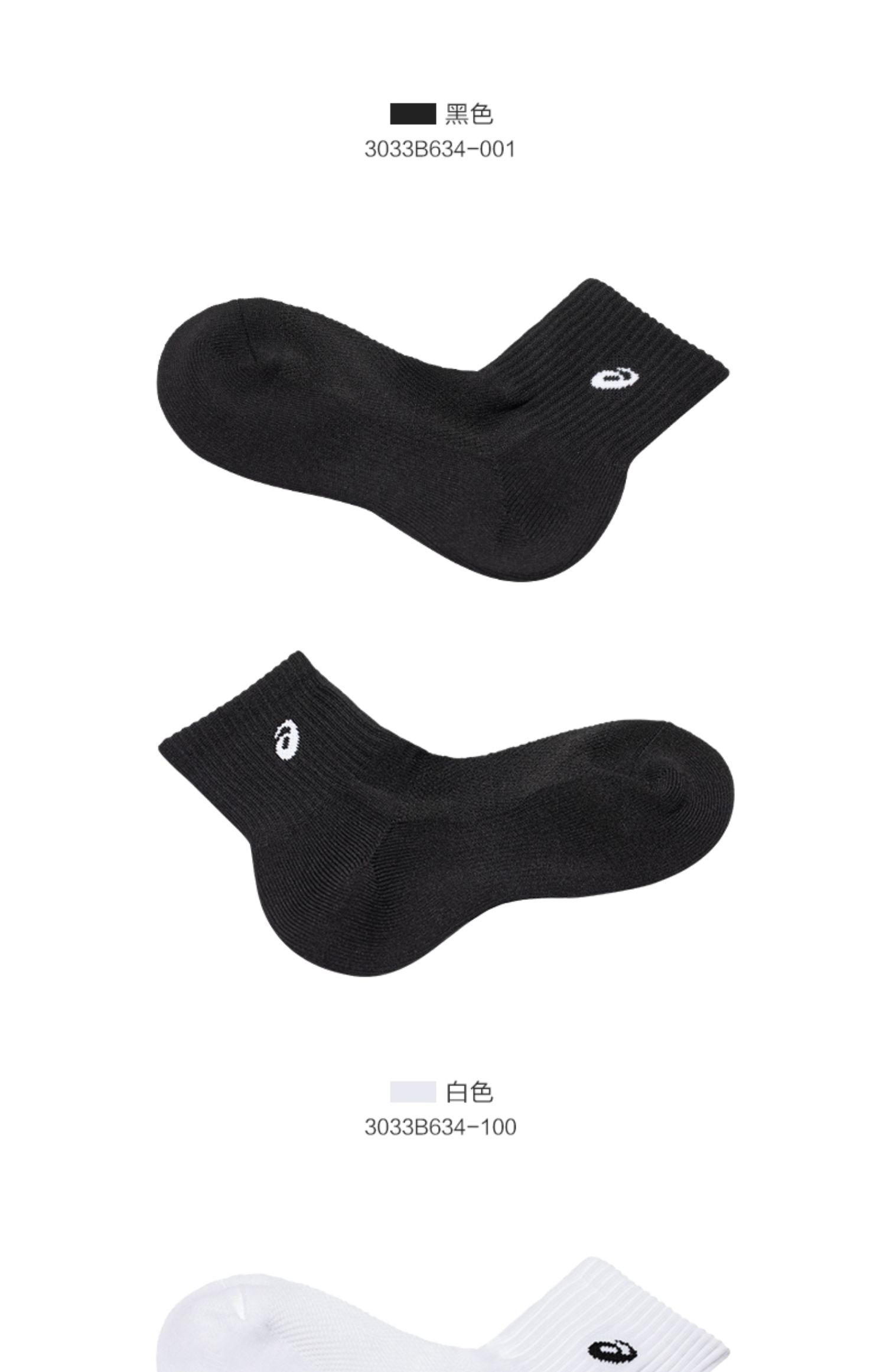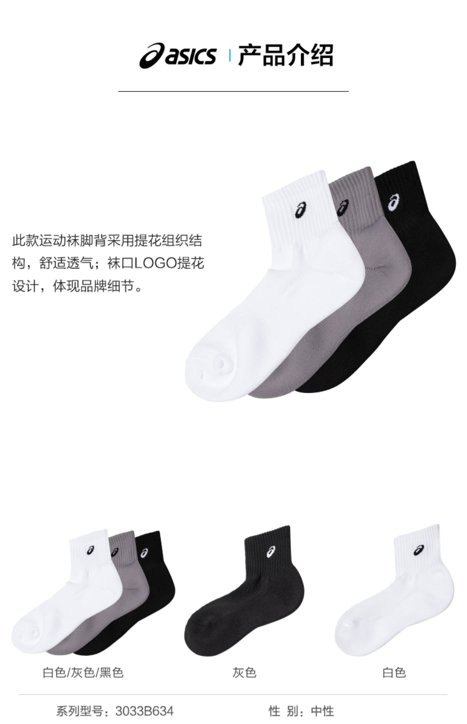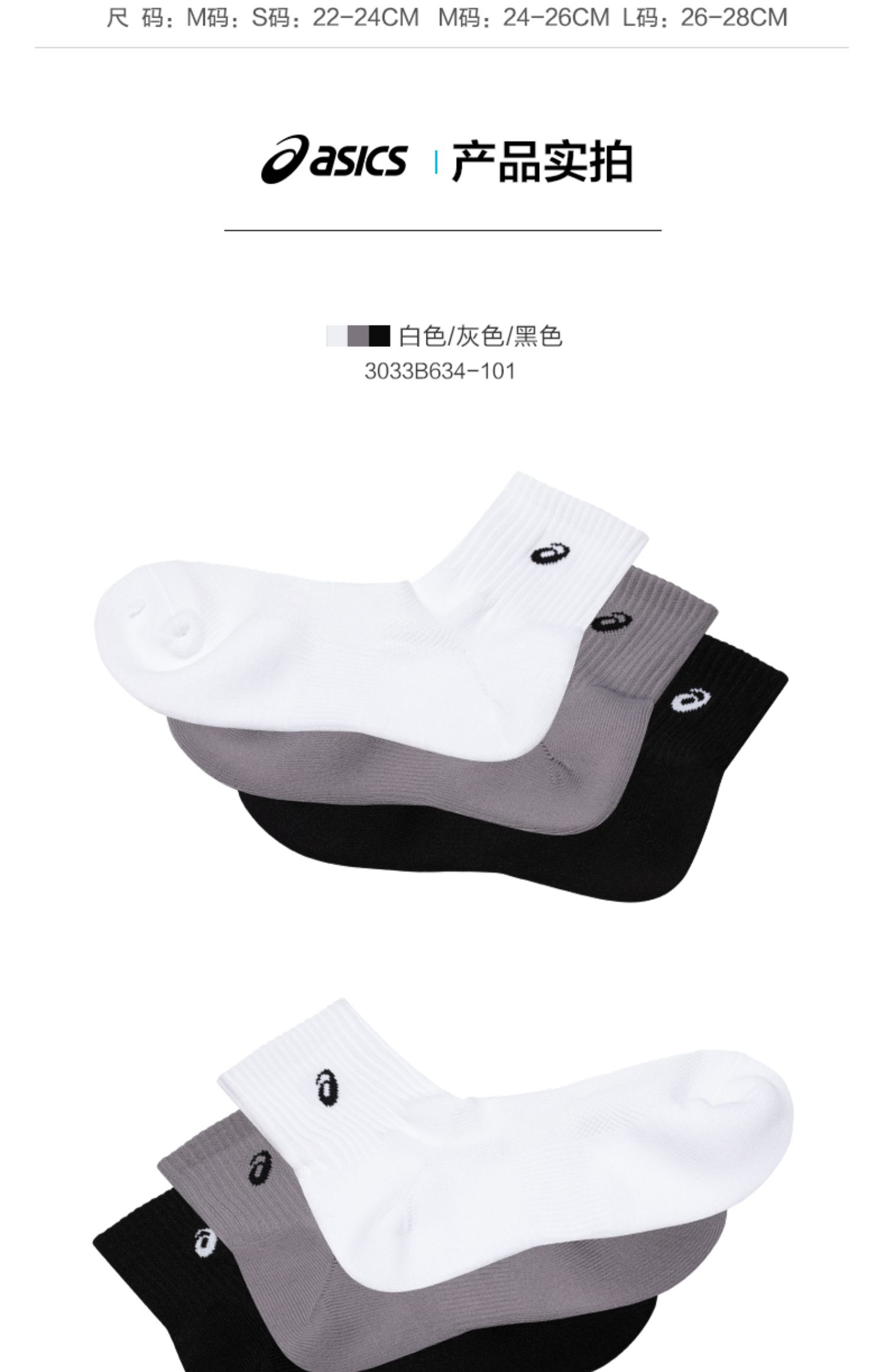 ASICS亚瑟士男女LOGO提花三双装运动袜3033B634