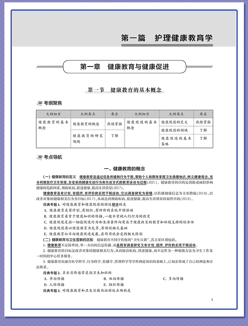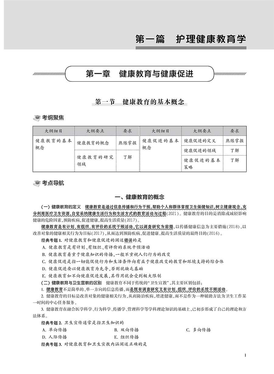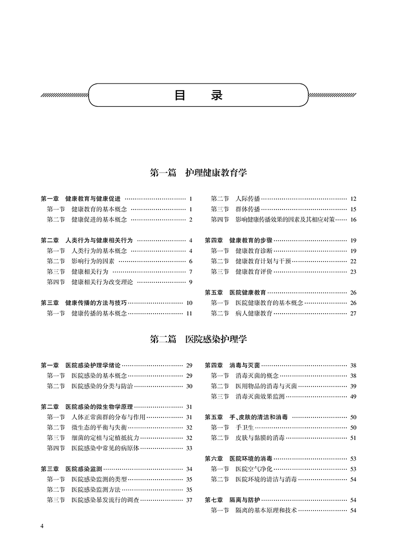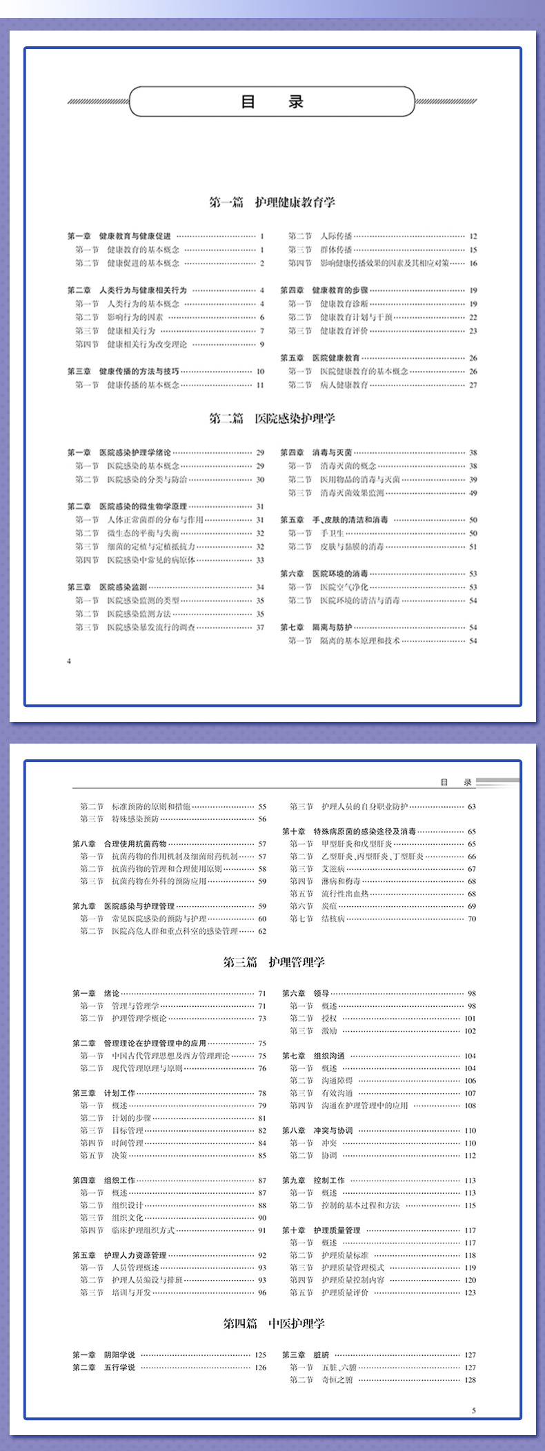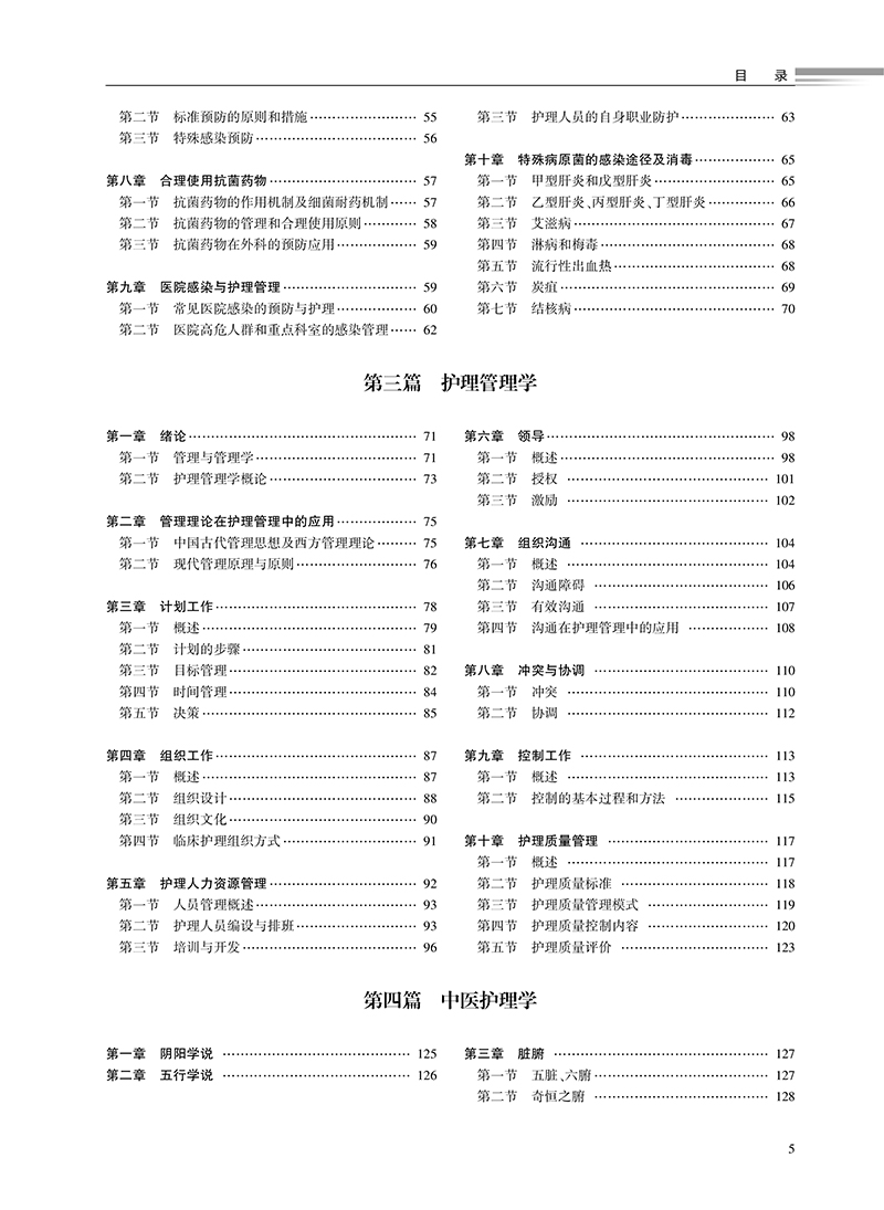 第一篇护理健康教育学 第一章 健康教育与健康促进 / 1 第一节 健康教育的基本概念 / 1 第二节 健康促进的基本概念 / 2 第二章 人类行为与健康相关行为 / 4 第一节 人类行为的基本概念 / 4 第二节 影响行为的因素 / 6 第三节 健康相关行为 / 7 第四节 健康相关行为改变理论 / 9 第三章 健康传播的方法与技巧/ 10 第一节 健康传播的基本概念/ 11 第二节 人际传播/ 12 第三节 群体传播/ 15 第四节 影响健康传播效果的因素及其相应对策/ 16 第四章 健康教育的步骤/ 19 第一节 健康教育诊断/ 19 第二节 健康教育计划与干预/ 22 第三节 健康教育评价/ 23 第五章 医院健康教育/ 26 第一节 医院健康教育的基本概念/ 26 第二节 病人健康教育/ 27 第二篇医院感染护理学 第一章 医院感染护理学绪论/ 29 第一节 医院感染的基本概念/ 29 第二节 医院感染的分类与防治/ 30 第二章 医院感染的微生物学原理/ 31 第一节 人体正常菌群的分布与作用/ 31 第二节 微生态的平衡与失衡/ 32 第三节 细菌的定植与定植抵抗力/ 32 第四节 医院感染中常见的病原体/ 33 第三章 医院感染监测/ 34 第一节 医院感染监测的类型/ 35 第二节 医院感染监测方法/ 35 第三节 医院感染暴发流行的调查/ 37 第四章 消毒与灭菌/ 38 第一节 消毒灭菌的概念/ 38 第二节 医用物品的消毒与灭菌/ 39 第三节 消毒灭菌效果监测/ 49 第五章 手、皮肤的清洁和消毒 / 50 第一节 手卫生/ 50 第二节 皮肤与黏膜的消毒/ 51 第六章 医院环境的消毒/ 53 第一节 医院空气净化/ 53 第二节 医院环境的清洁与消毒/ 54 第七章 隔离与防护/ 54 第一节 隔离的基本原理和技术/ 54 第二节 标准预防的原则和措施/ 55 第三节 特殊感染预防/ 56 第八章 合理使用抗菌药物/ 57 第一节 抗菌药物的作用机制及细菌耐药机制/ 57 第二节 抗菌药物的管理和合理使用原则/ 58 第三节 抗菌药物在外科的预防应用/ 59 第九章 医院感染与护理管理/ 59 第一节 常见医院感染的预防与护理/ 60 第二节 医院高危人群和重点科室的感染管理/ 62 第三节 护理人员的自身职业防护/ 63 第十章 特殊病原菌的感染途径及消毒/ 65 第一节 甲型肝炎和戊型肝炎/ 65 第二节 乙型肝炎、丙型肝炎、丁型肝炎/ 66 第三节 艾滋病/ 67 第四节 淋病和梅毒/ 68 第五节 流行性出血热/ 68 第六节 炭疽/ 69 第七节 结核病/ 70 第三篇护理管理学 第一章 绪论/ 71 第一节 管理与管理学/ 71 第二节 护理管理学概论/ 73 第二章 管理理论在护理管理中的应用/ 75 第一节 中国古代管理思想及西方管理理论/ 75 第二节 现代管理原理与原则/ 76 第三章 计划工作/ 78 第一节 概述/ 79 第二节 计划的步骤/ 81 第三节 目标管理/ 82 第四节 时间管理/ 84 第五节 决策/ 85 第四章 组织工作/ 87 第一节 概述/ 87 第二节 组织设计/ 88 第三节 组织文化/ 90 第四节 临床护理组织方式/ 91 第五章 护理人力资源管理/ 92 第一节 人员管理概述/ 93 第二节 护理人员编设与排班/ 93 第三节 培训与开发/ 96 第六章 领导/ 98 第一节 概述/ 98 第二节 授权 / 101 第三节 激励 / 102 第七章 组织沟通 / 104 第一节 概述 / 104 第二节 沟通障碍 / 106 第三节 有效沟通 / 107 第四节 沟通在护理管理中的应用 / 108 第八章 冲突与协调 / 110 第一节 冲突 / 110 第二节 协调 / 112 第九章 控制工作 / 113 第一节 概述 / 113 第二节 控制的基本过程和方法 / 115 第十章 护理质量管理 / 117 第一节 概述 / 117 第二节 护理质量标准 / 118 第三节 护理质量管理模式 / 119 第四节 护理质量控制内容 / 120 第五节 护理质量评价 / 123 第四篇中医护理学 第一章 阴阳学说 / 125 第二章 五行学说 / 126 第三章 脏腑 / 127 第一节 五脏、六腑/ 127 第二节 奇恒之腑 / 128 第三节 脏腑之间的关系 / 129 第四章 气、血、津液 / 130 第一节 气 / 130 第二节 血 / 131 第三节 津液 / 131 第五章 辨证 / 132 第一节 八纲辨证 / 132 第二节 脏腑辨证 / 135 第三节 卫气营血辨证 / 137 第六章 经络 / 138 第一节 经络的基本知识 / 138 第二节 经脉 / 138 第七章 病因和病机 / 140 第一节 病因 / 140 第二节 病机 / 141 第八章 防治原则 / 142 第一节 预防 / 142 第二节 治则 / 143 第九章 中医护理的基本内容 / 144 第一节 病情观察 / 144 第二节 情志护理 / 145 第三节 饮食护理 / 146 第四节 服药护理 / 147 第十章 常用中医护理适宜技术 / 151 第一节 灸法 / 151 第二节 拔罐法 / 153 第三节 耳穴压丸法 / 154 第四节 刮痧法 / 155 第五节 湿热敷法 / 157 第六节 中药泡洗法 / 157 第五篇通关考卷 通关考卷一 / 159 通关考卷二 / 164 通关考卷三 / 170 通关考卷参考答案与解析 / 176