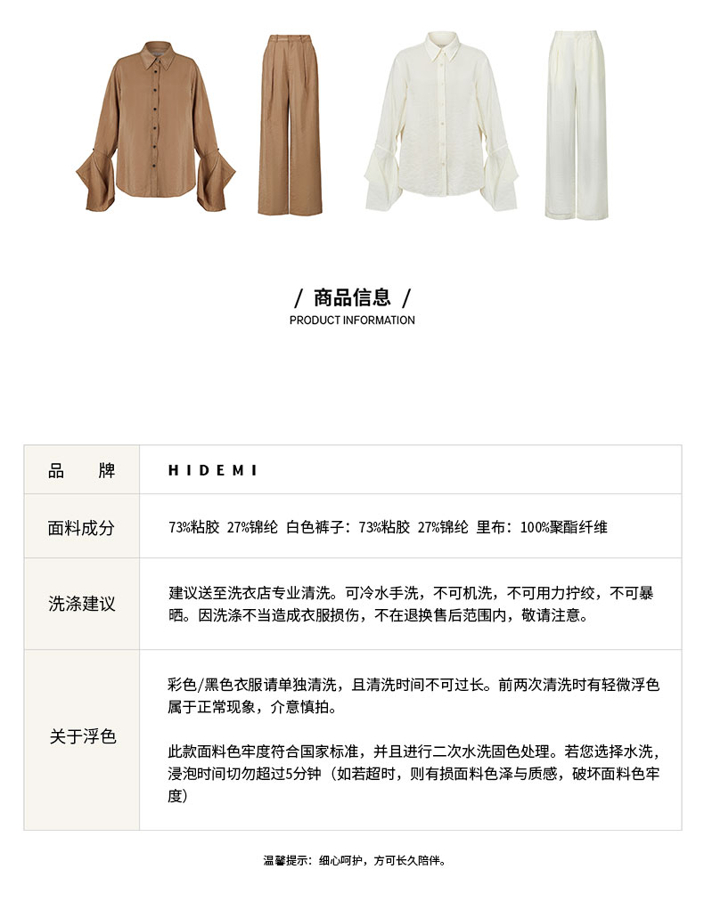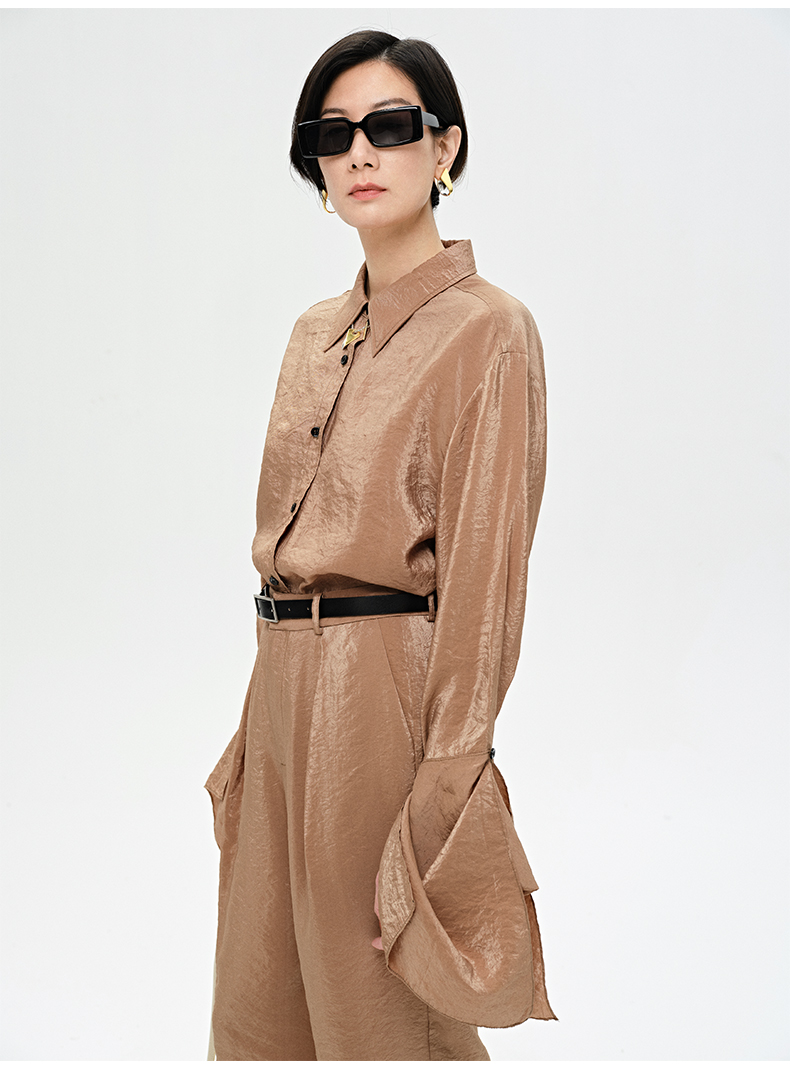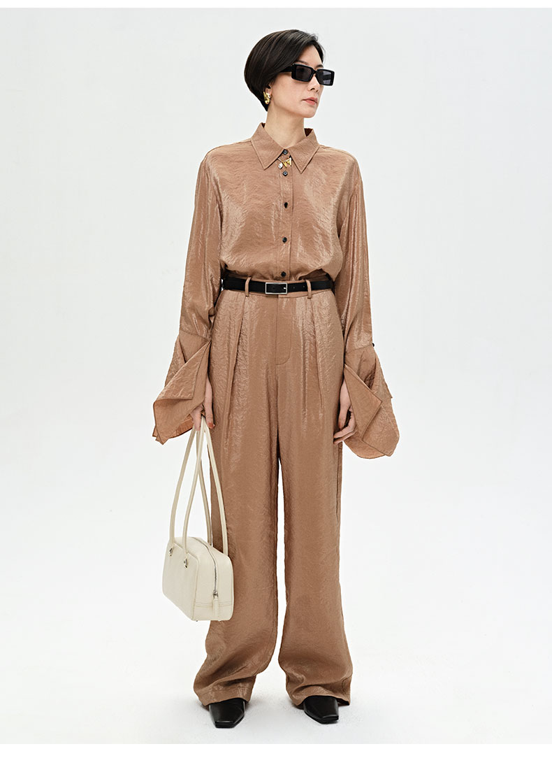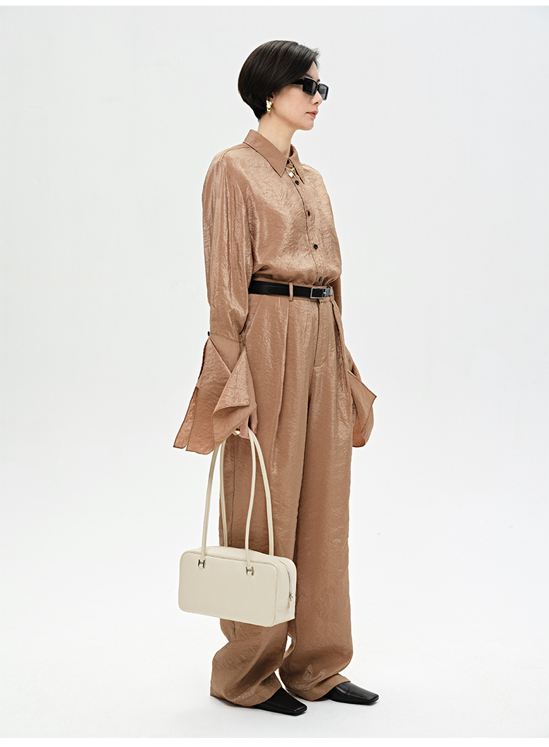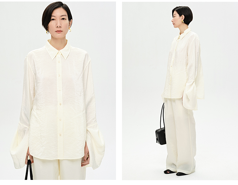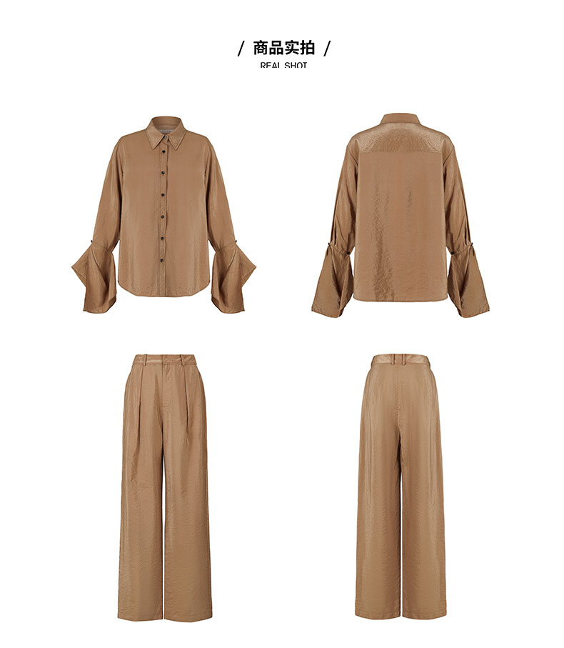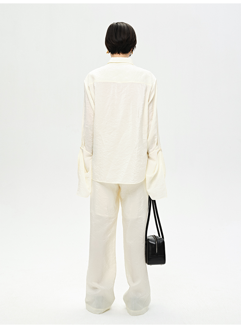 HIDEMI 【麦子同款】极简设计感花苞堆堆袖衬衫垂顺亲肤缎感衬衫套装 衬衫/长裤 乳白色/饼干色