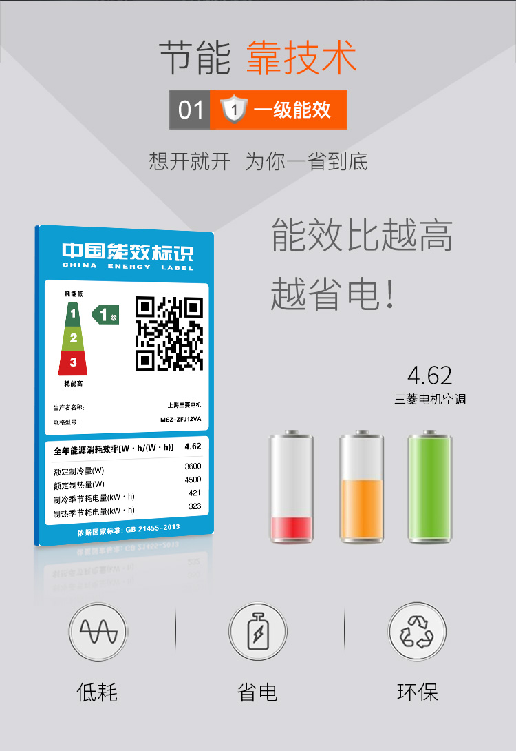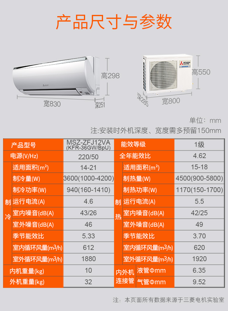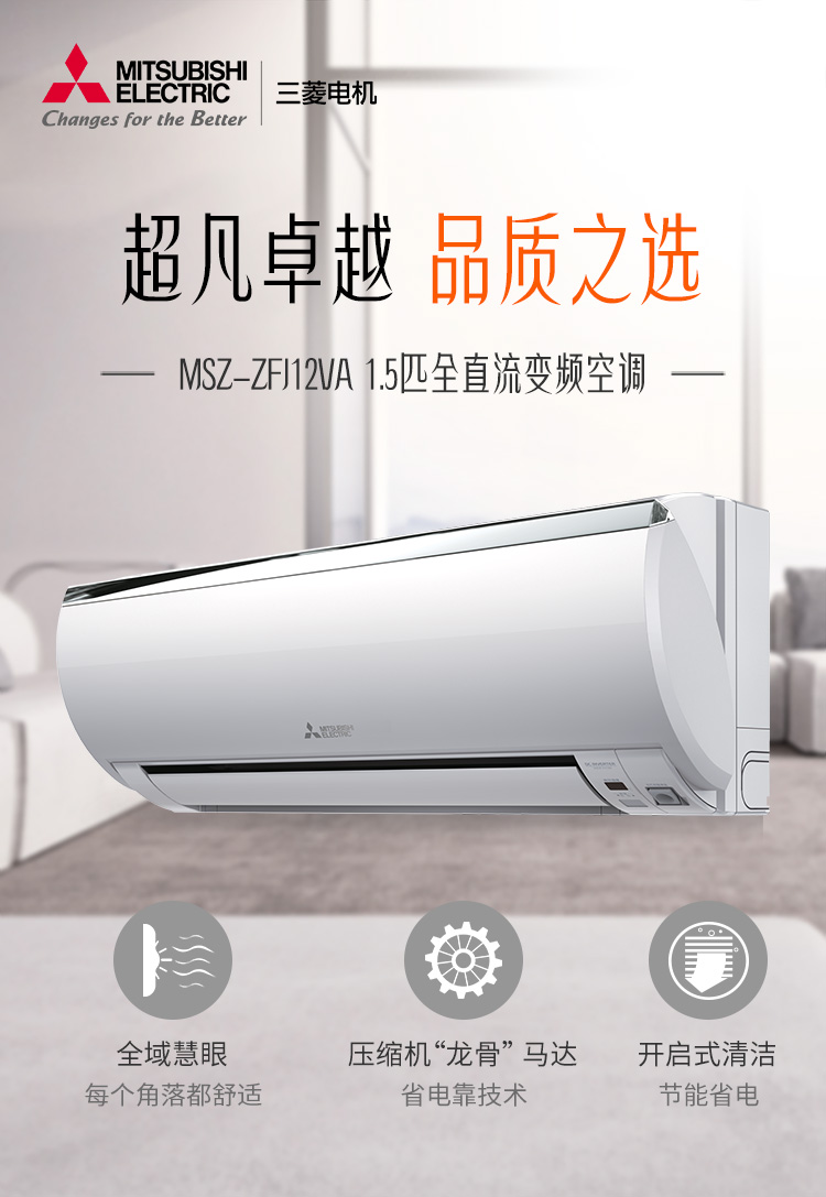 三菱电机 1.5匹 1级能效 变频 壁挂式家用冷暖空调 MSZ-ZFJ12VA(白色)