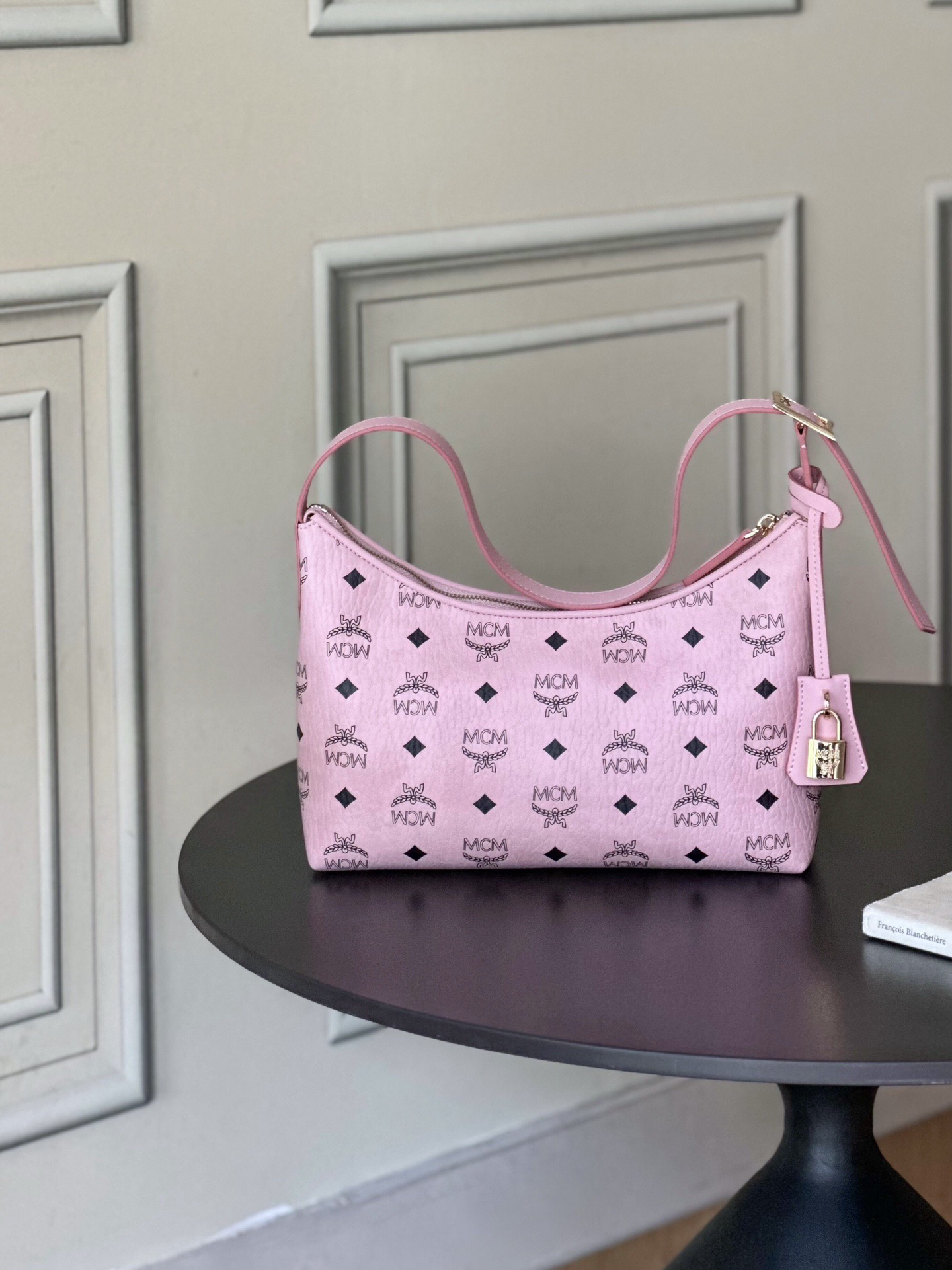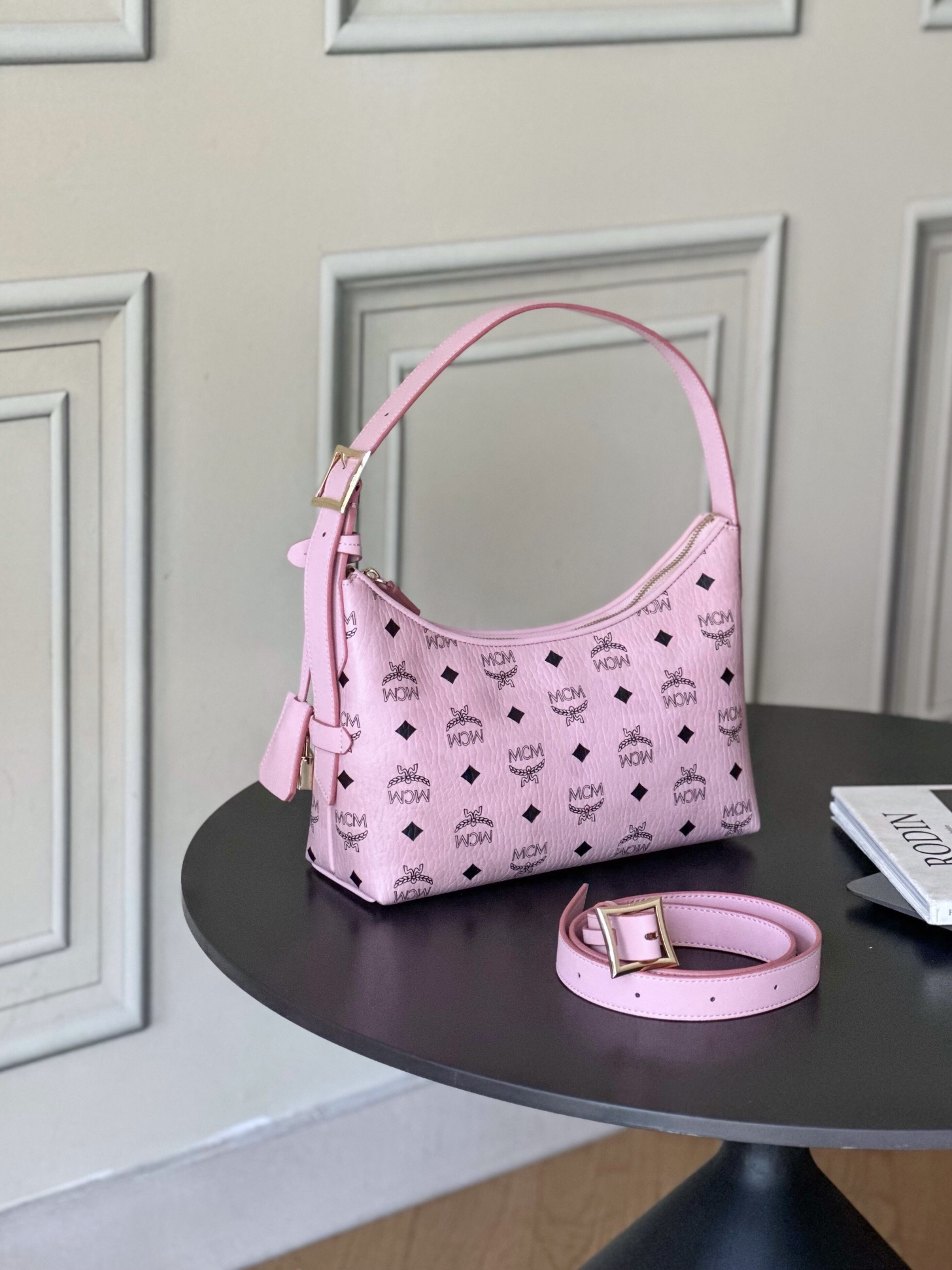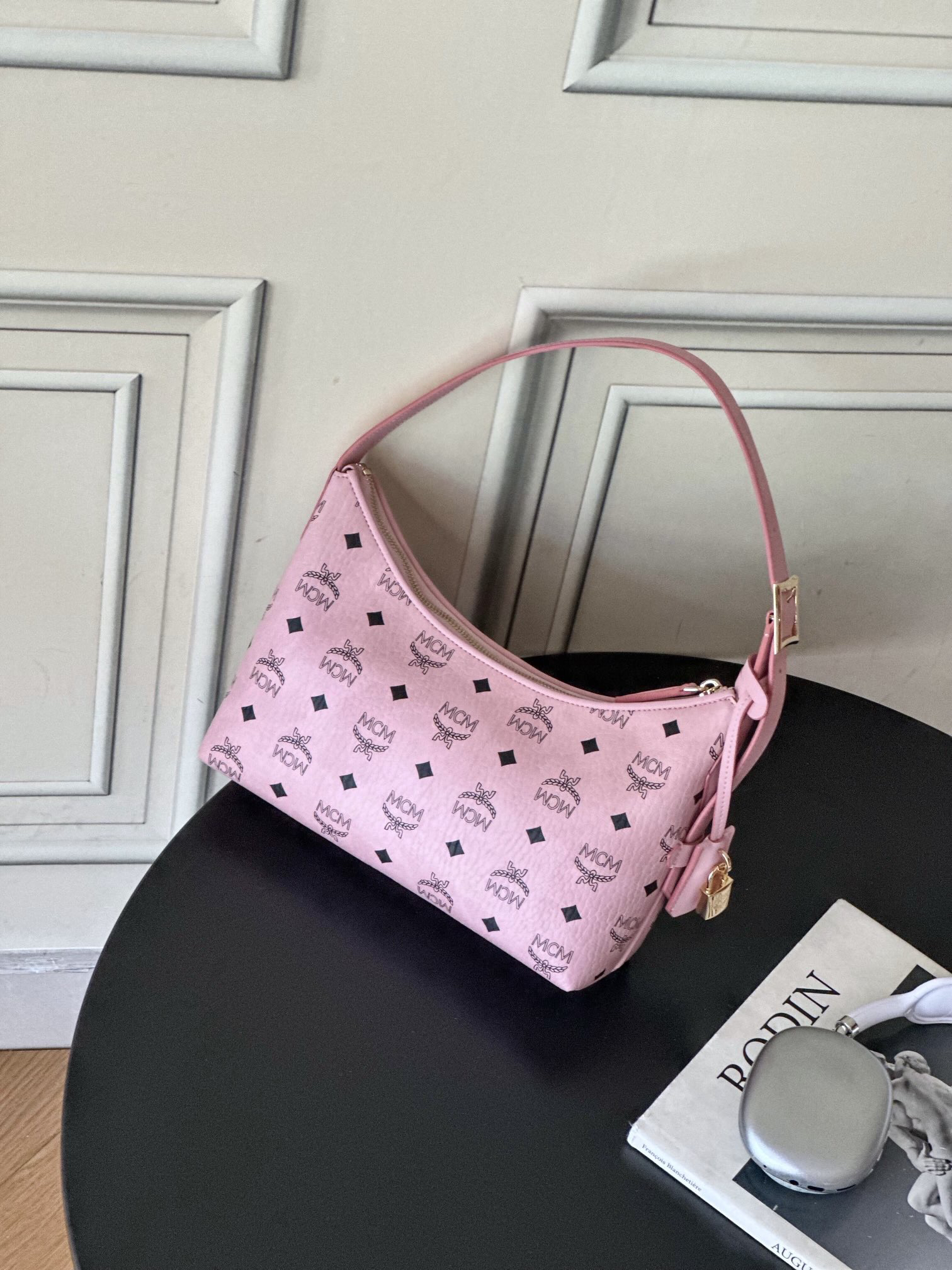 秋冬特惠💰780 原单MCM 原厂皮 新款桃花粉 Small 腋下肩背包牛角包 老花满印 这款单品对经典的休闲款式进行了现代风的全新演绎,在柔软与挺阔之间取得了理想的平衡。这款小号Aren Hobo肩背包采用了传统MCM行李箱的设计元素,包括一个可拆卸皮革吊牌及雕花Logo挂锁,达到锦上添花的效果。