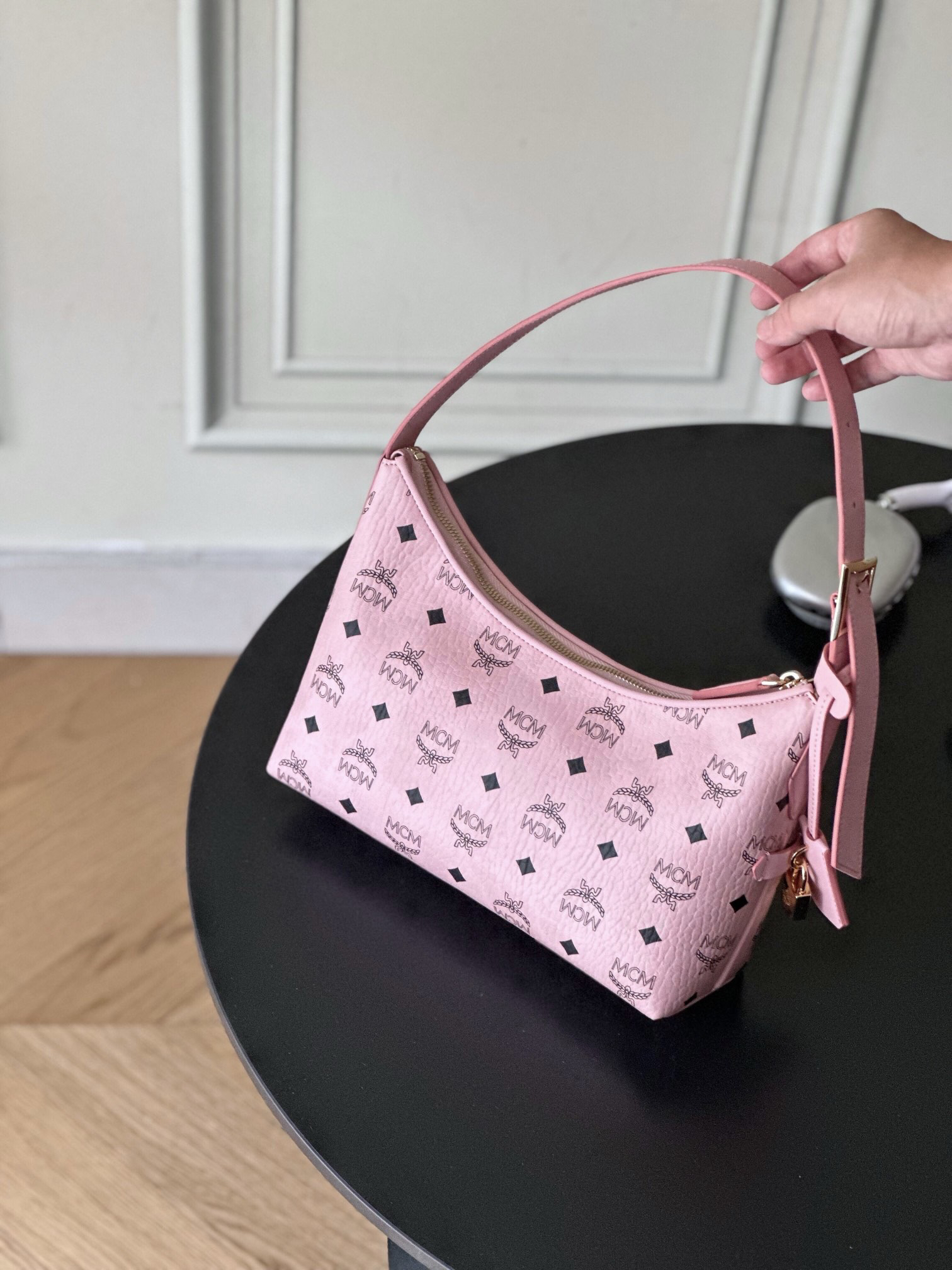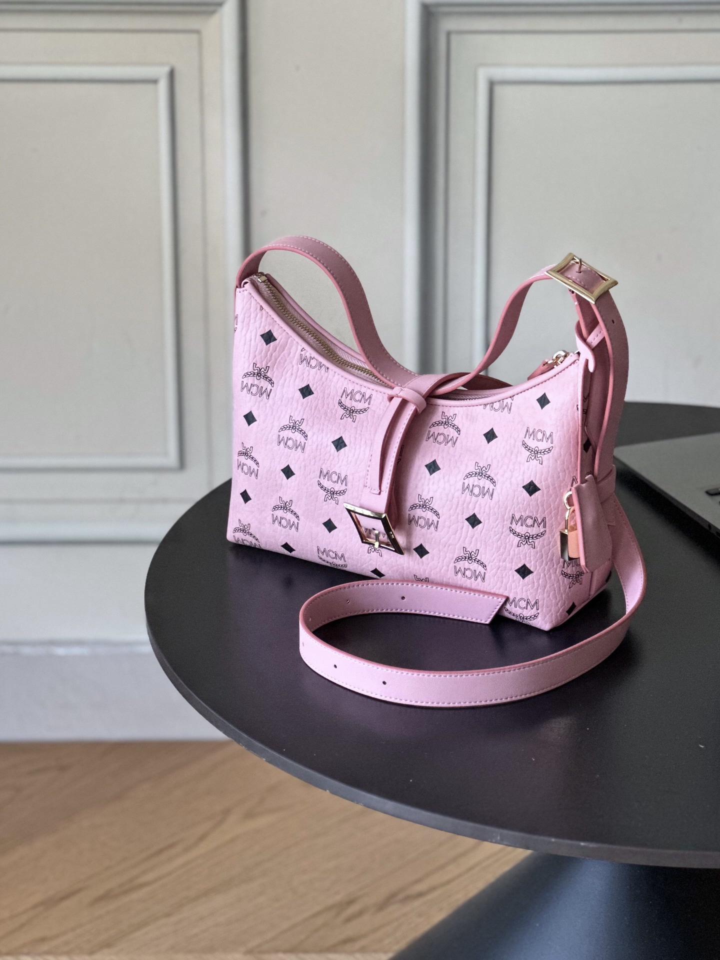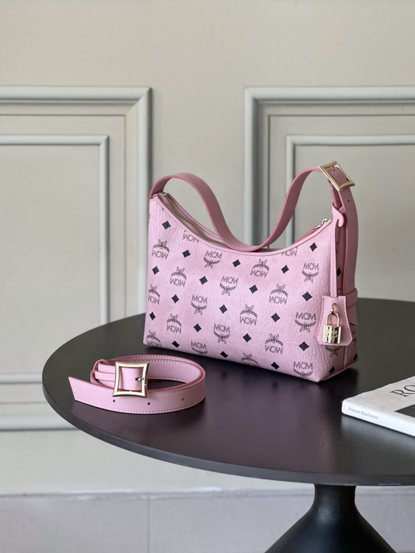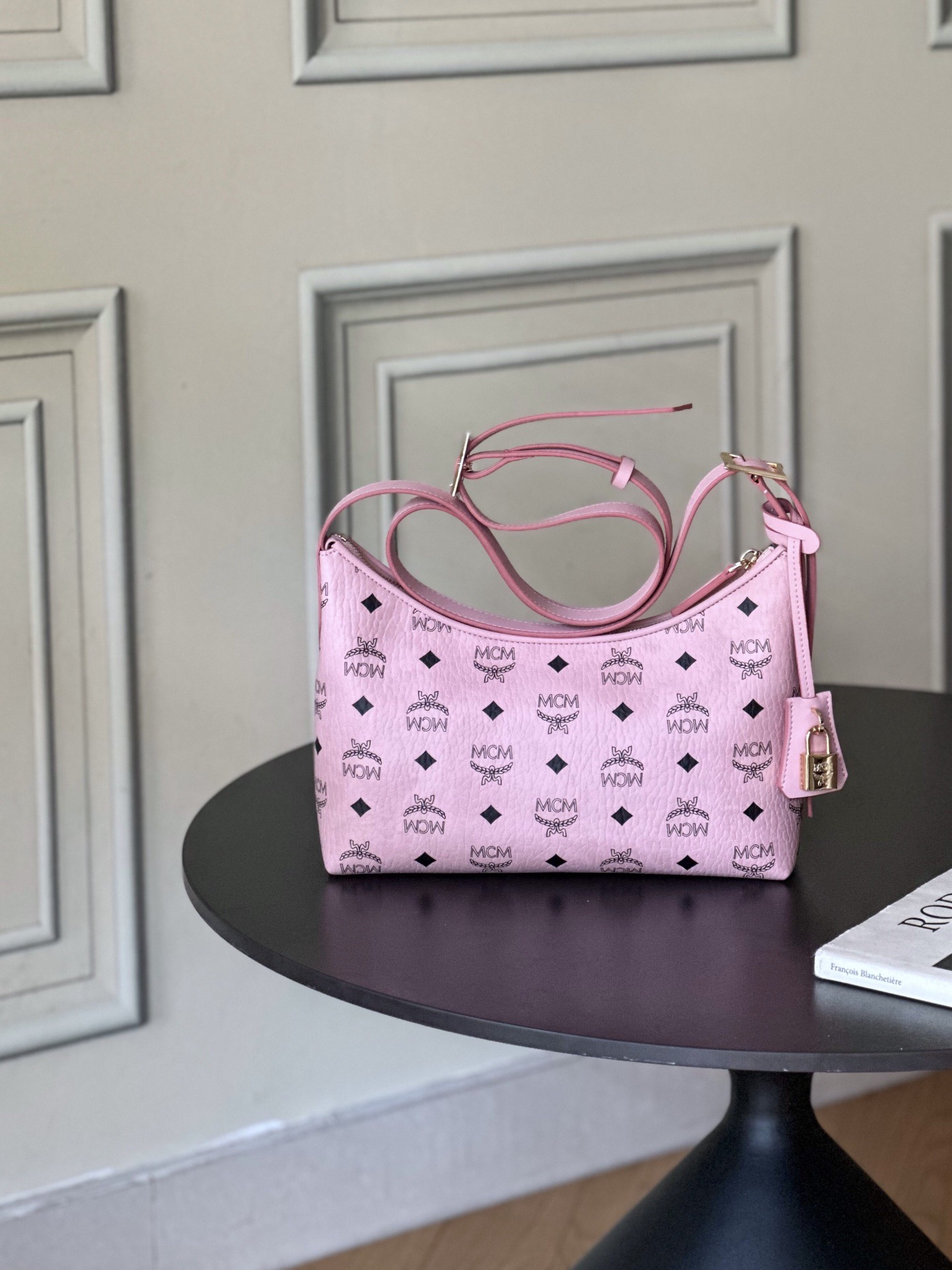 秋冬特惠💰780 原单MCM 原厂皮 新款桃花粉 Small 腋下肩背包牛角包 老花满印 这款单品对经典的休闲款式进行了现代风的全新演绎,在柔软与挺阔之间取得了理想的平衡。这款小号Aren Hobo肩背包采用了传统MCM行李箱的设计元素,包括一个可拆卸皮革吊牌及雕花Logo挂锁,达到锦上添花的效果。