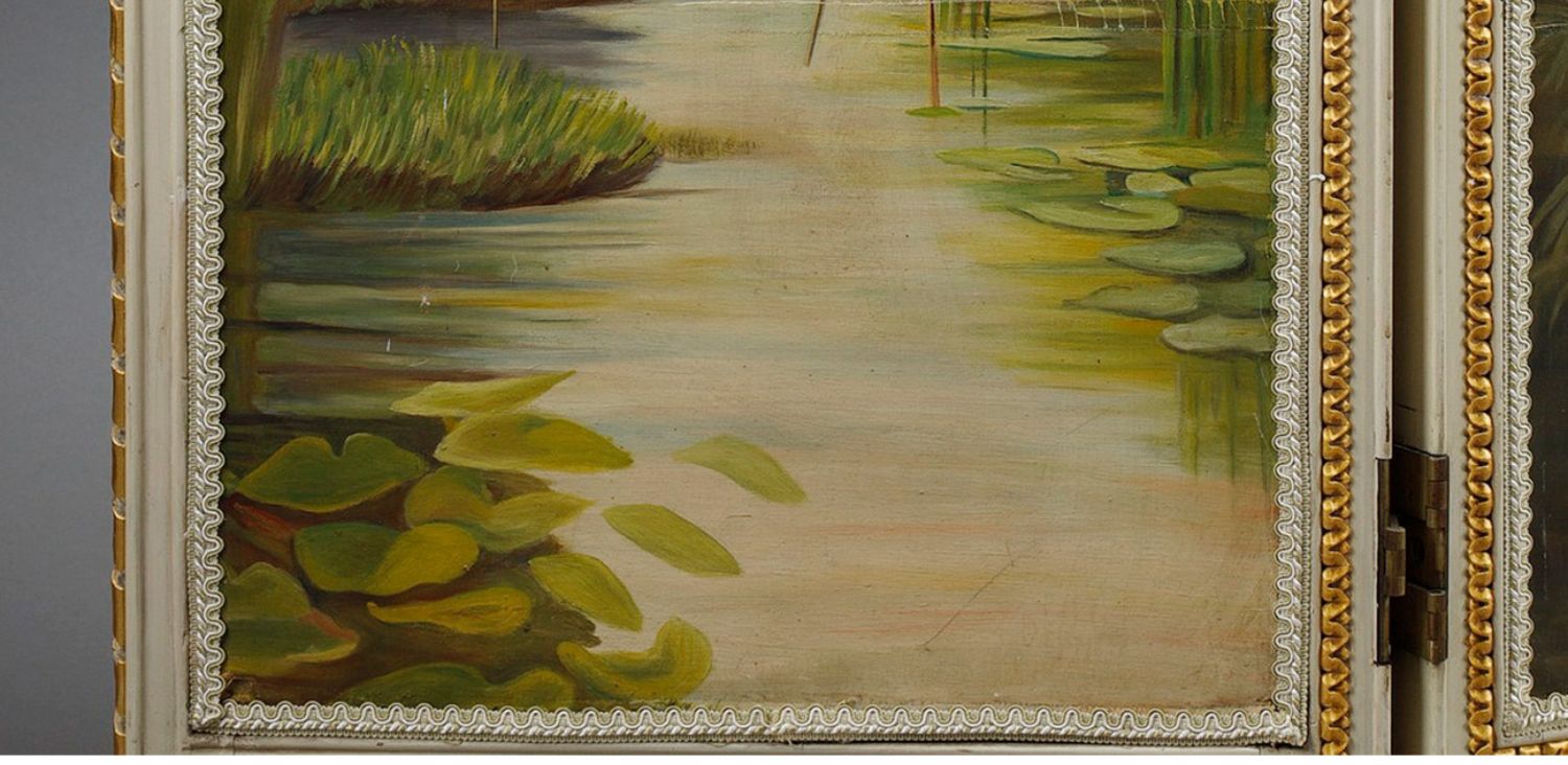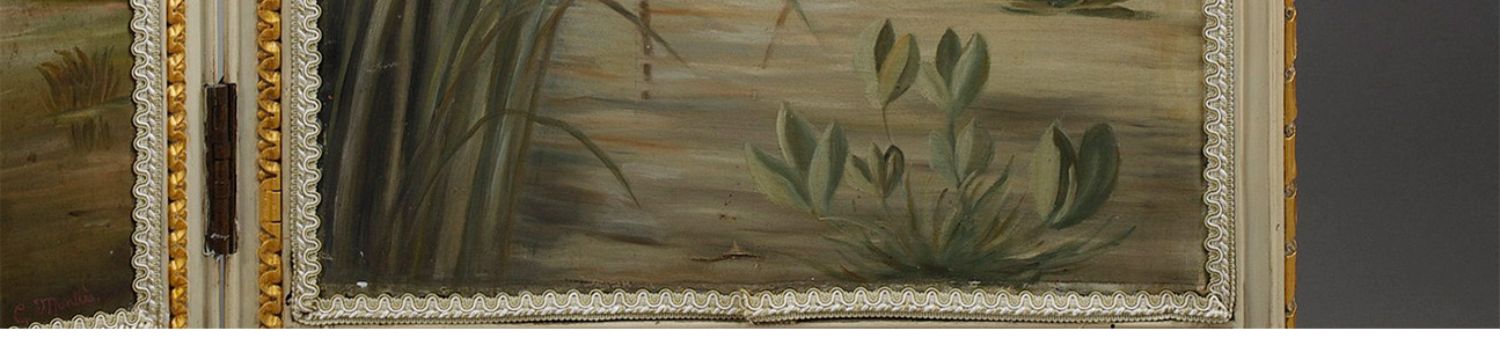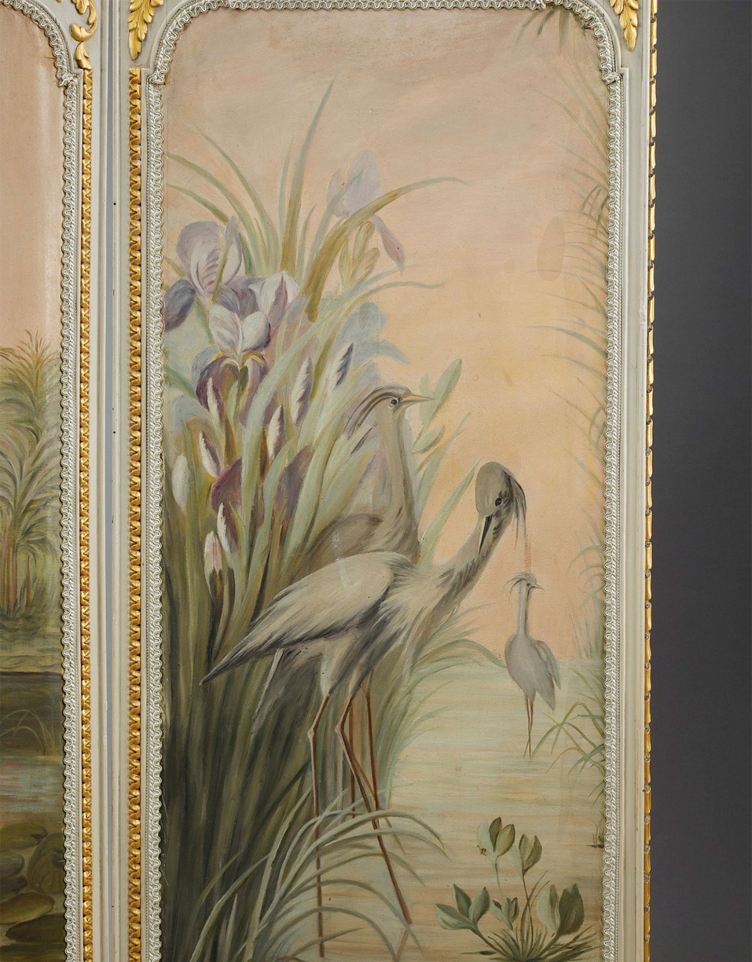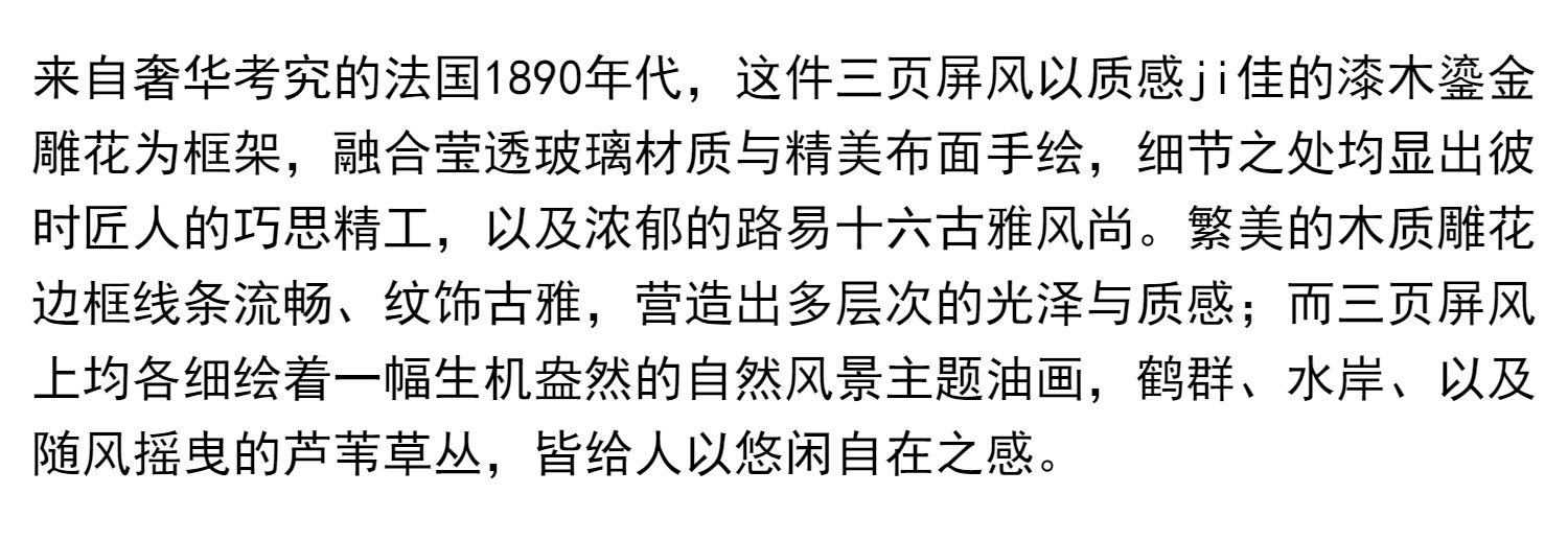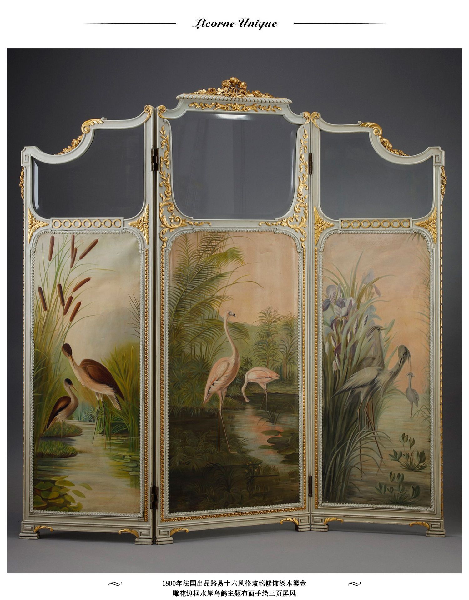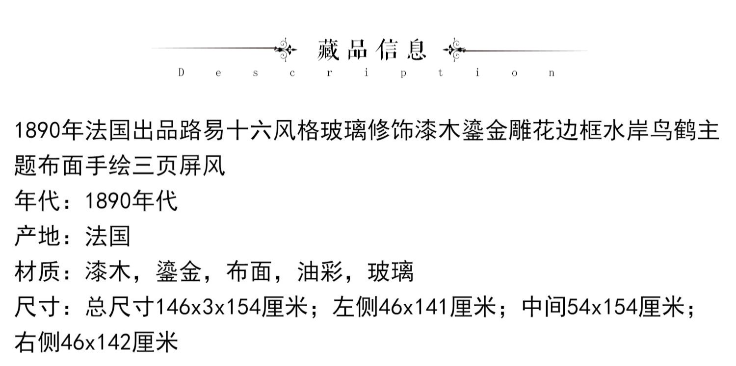 独角鹿西洋古董玻璃修漆木鎏金雕花边框水岸鸟鹤布面手绘三页屏风