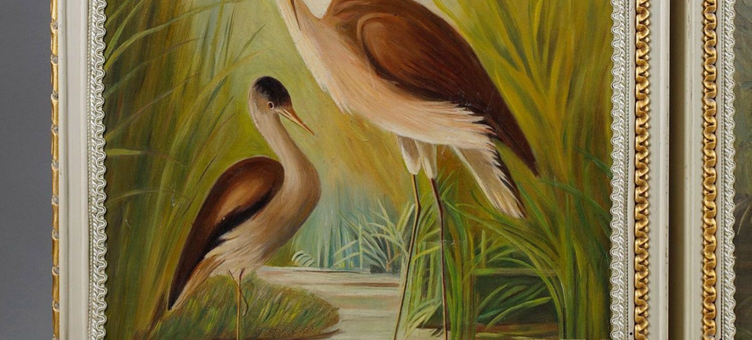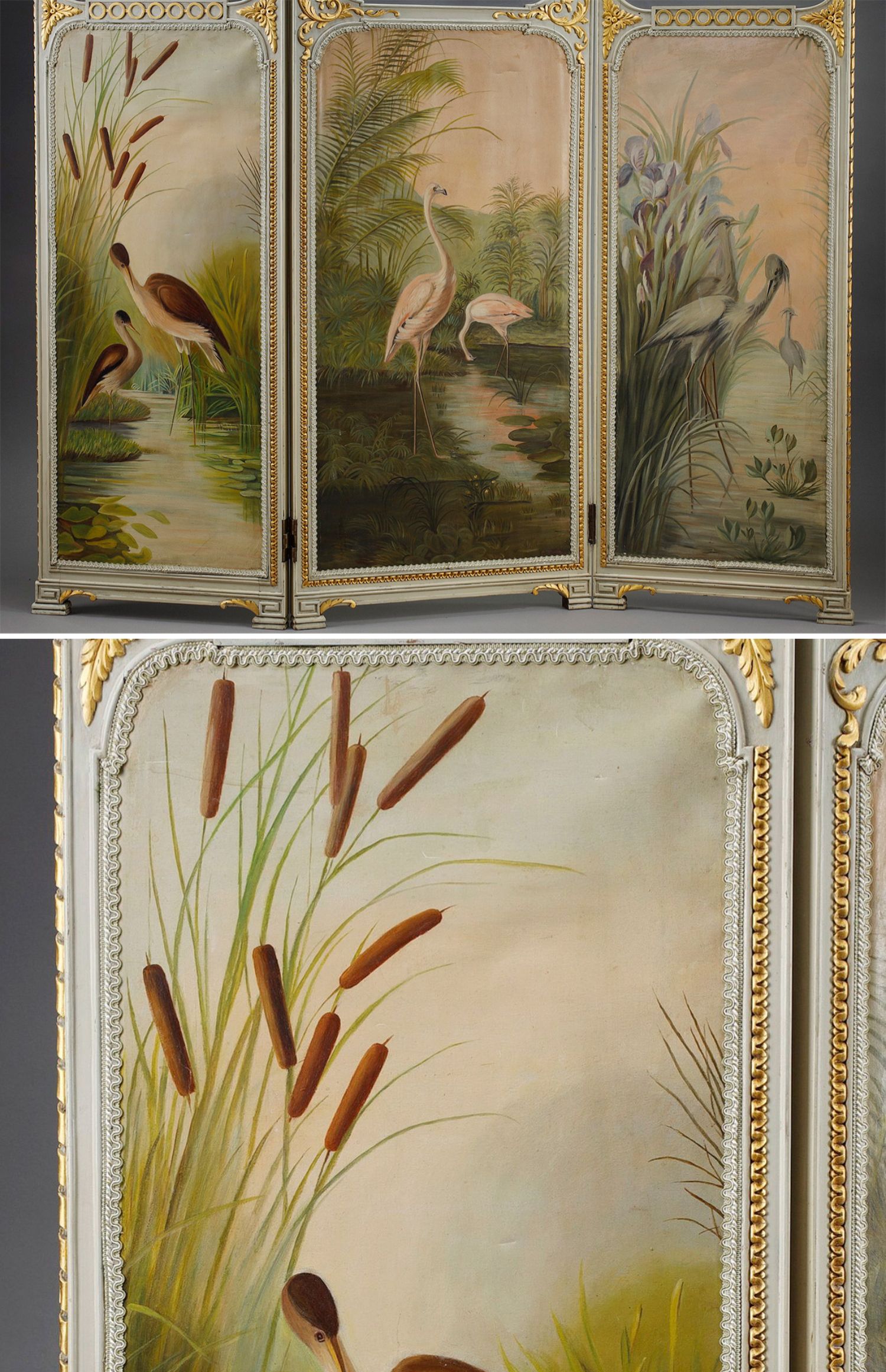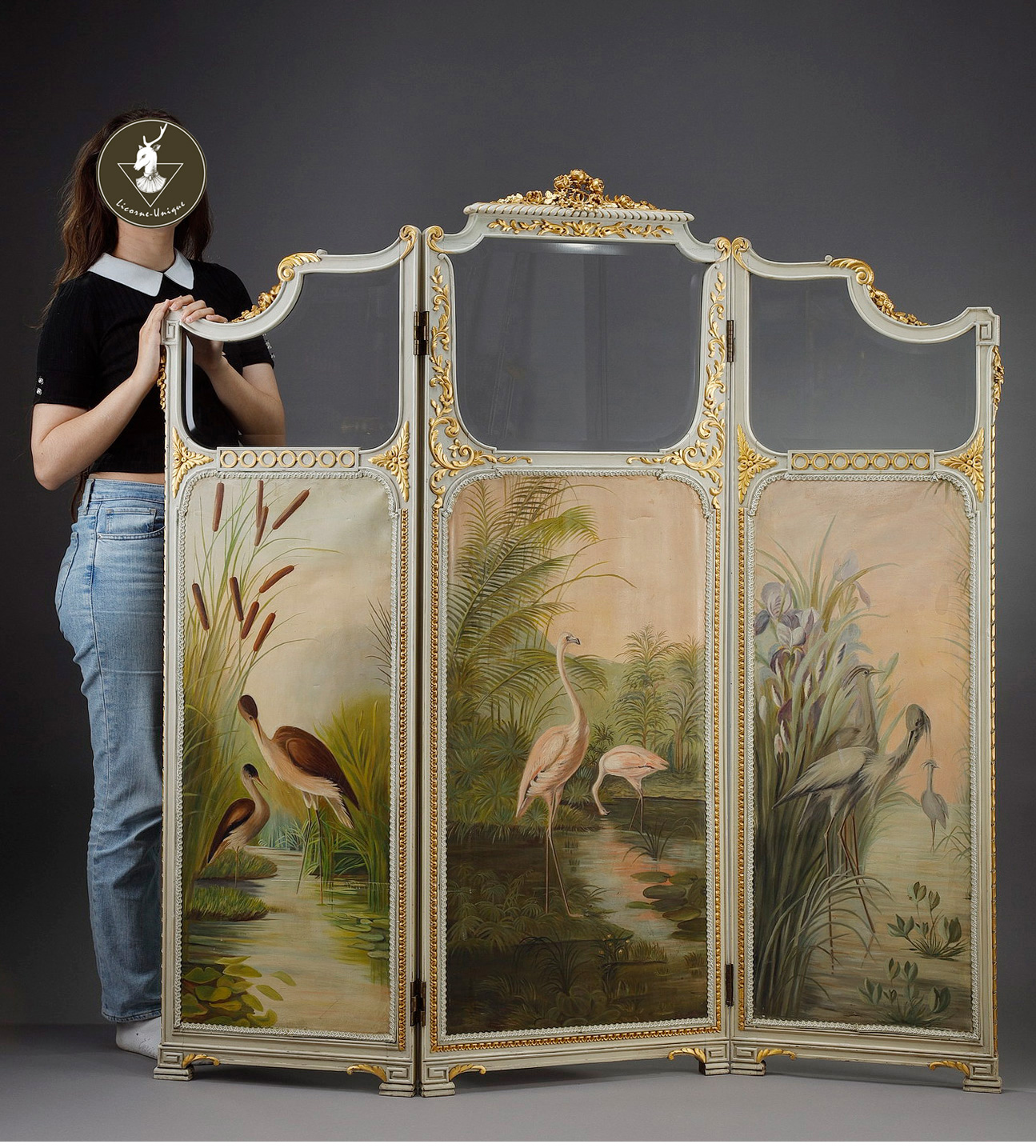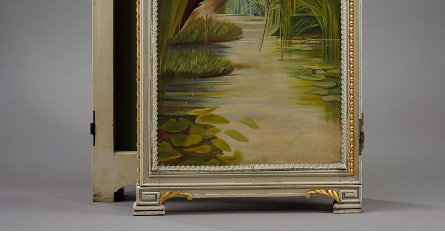 独角鹿西洋古董玻璃修漆木鎏金雕花边框水岸鸟鹤布面手绘三页屏风